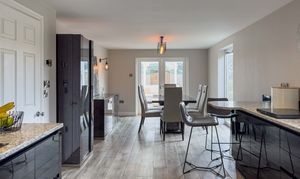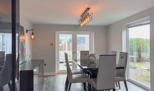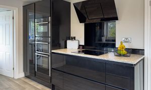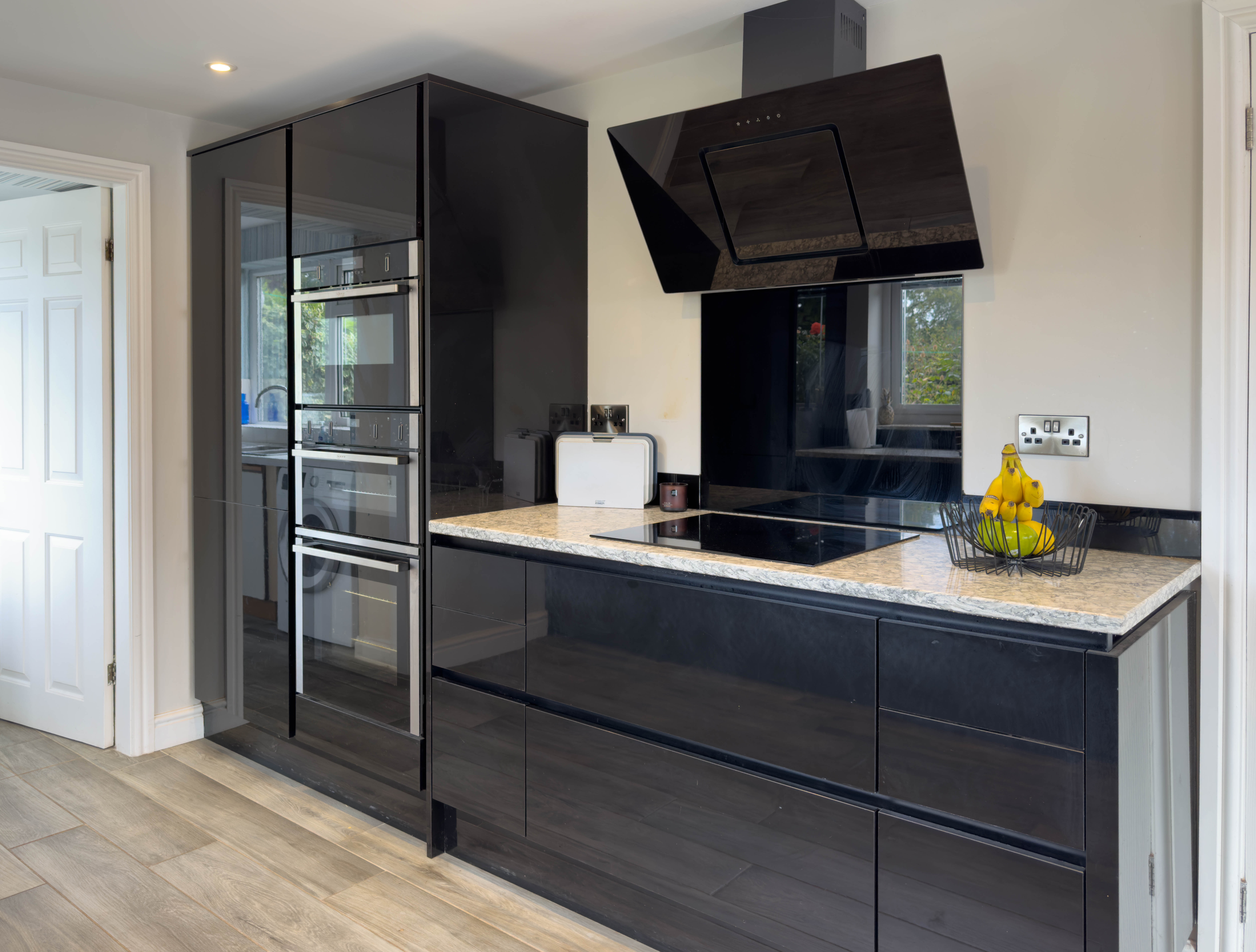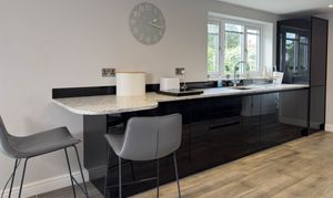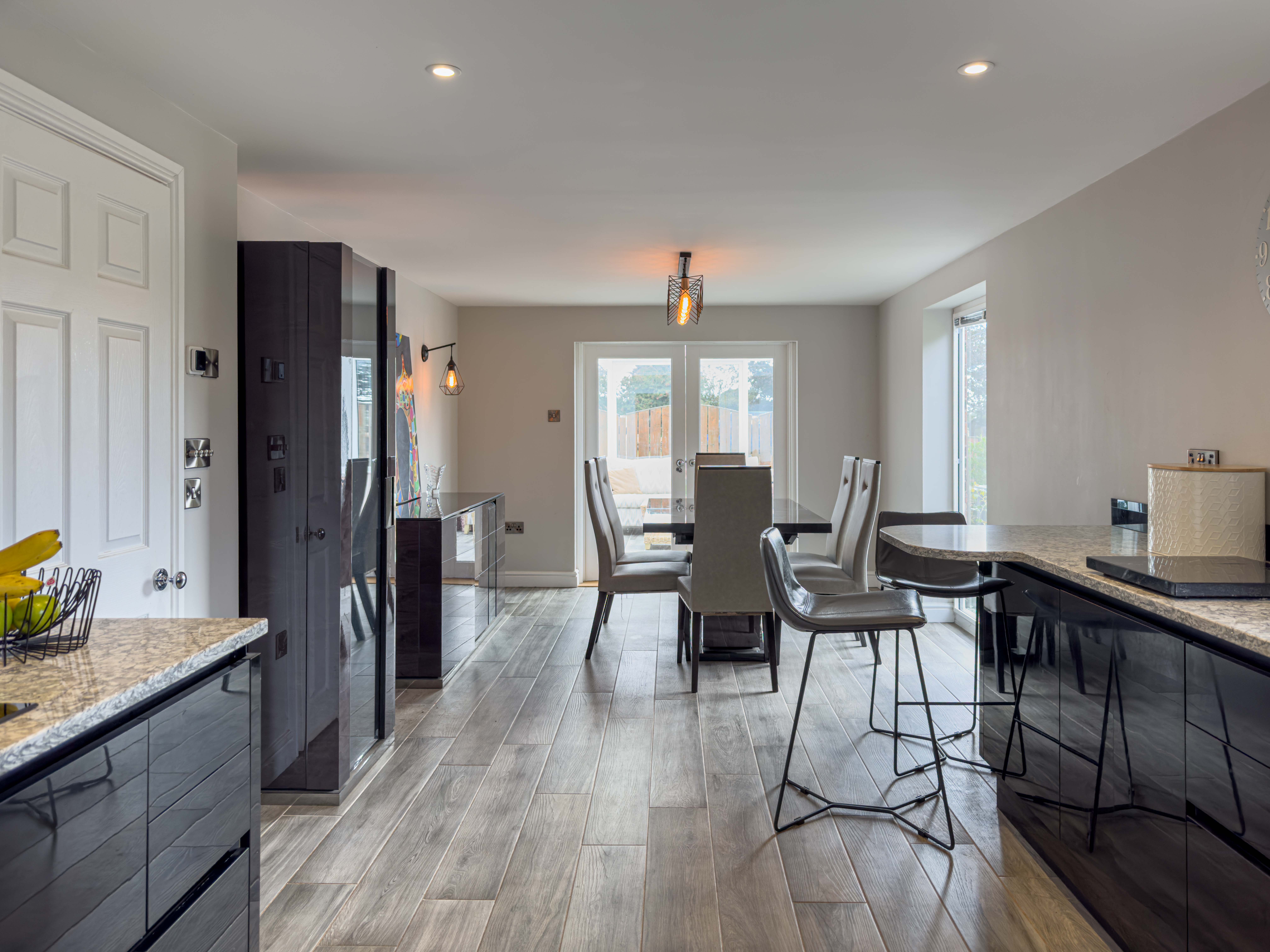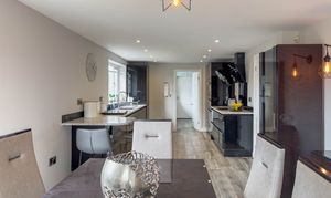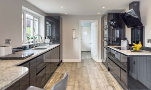 The large sunny kitchen is fitted with underfloor heating, and wood effect flooring, The black high gloss units sit below stone worktops. The double oven, microwave, dishwasher and induction hob are integrated. The hot water tap removes the need for a kettle. The kitchen has ample space for a large dining table and the breakfast bar offers additional seating.
