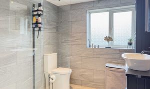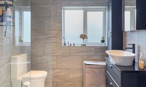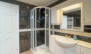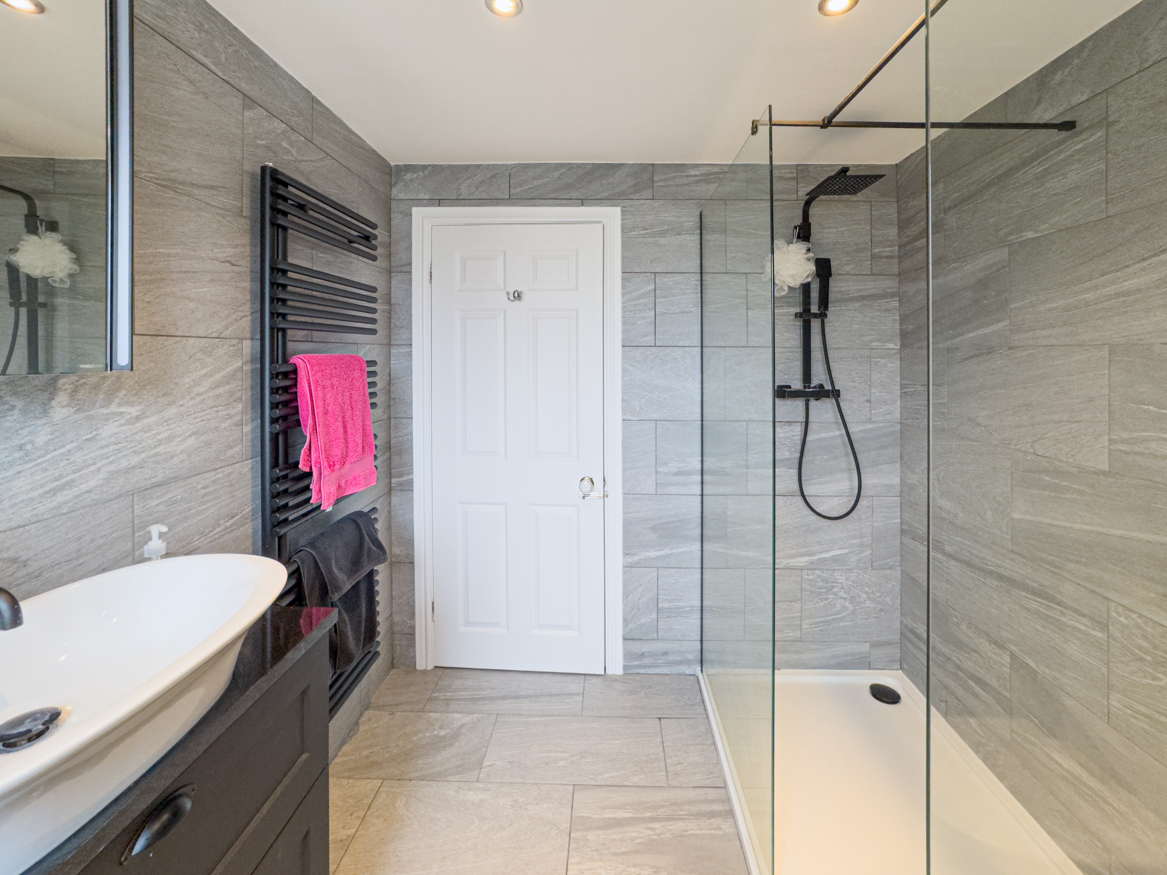The recently fitted bathroom has a double shower cubicle; the floor and walls are tiled for easy maintenance. The basin is fitted into a vanity unit and the illuminated mirror. The matt black towel radiator finishes the bathroom.