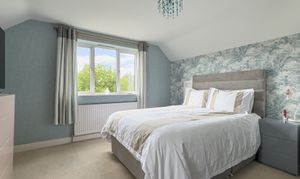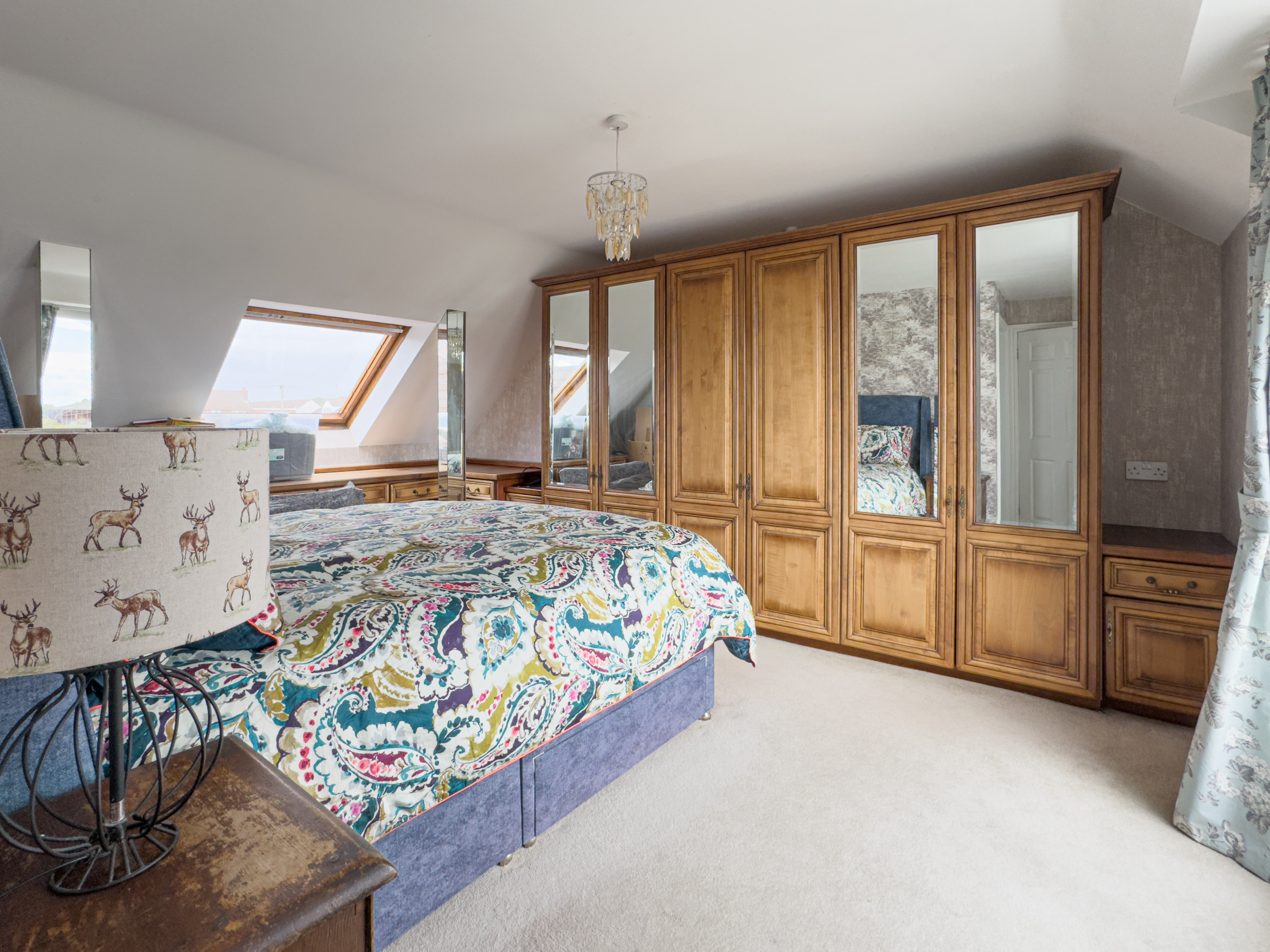 With dual aspect views the principle bedroom has a large Velux window to the front of the property and a small walk out balcony to the rear overlooking the fields beyond. There is an abundance of fitted storage including wardrobes and drawers.