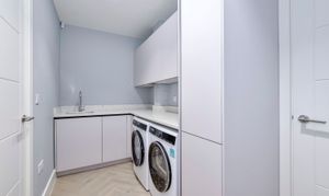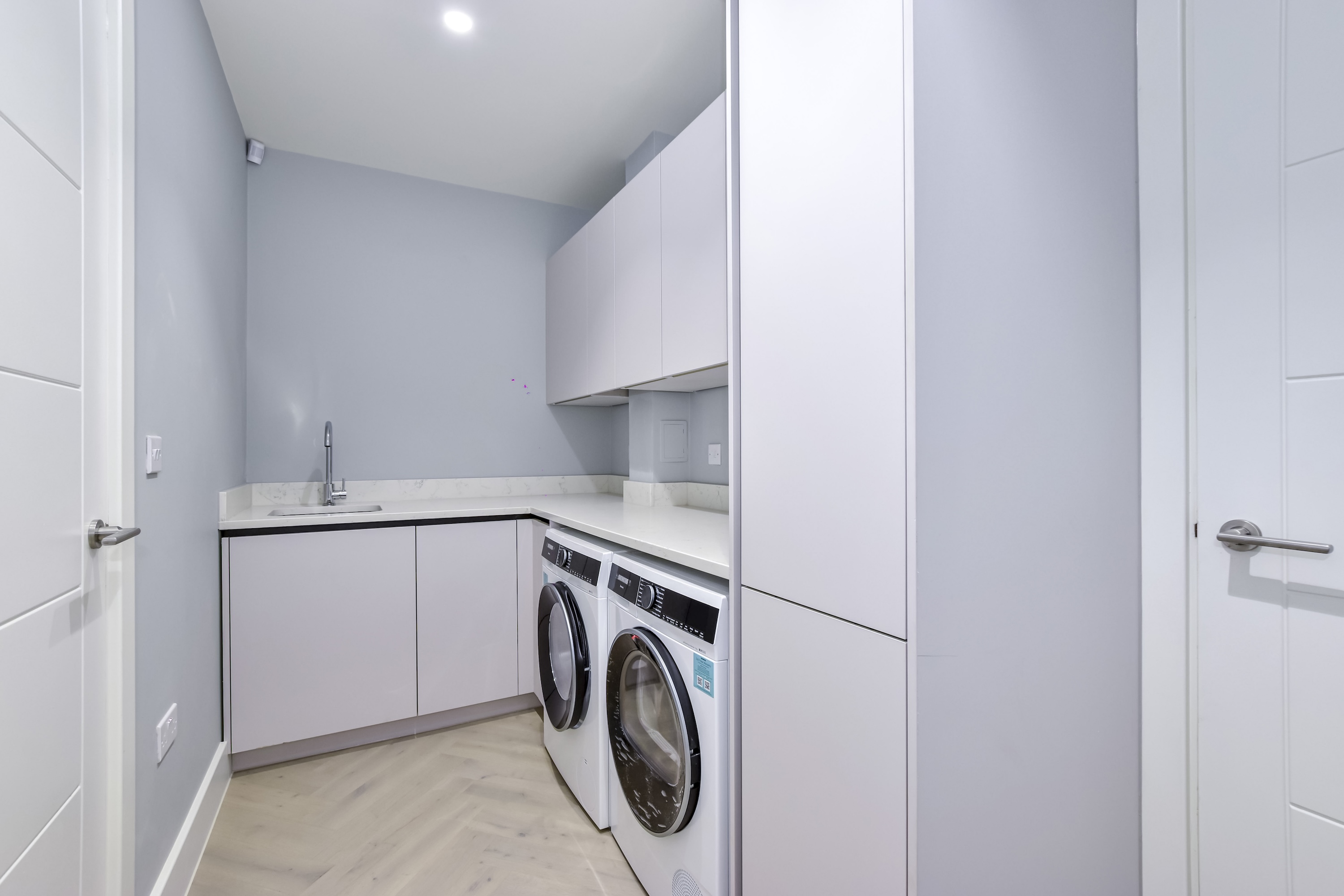 Hacker handless range to kitchen and utility room with Carrara Storm siltstone worktops and splashbacks, plus Quooker hot tap and Siemens appliances.