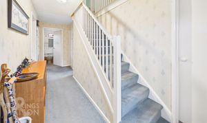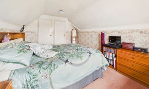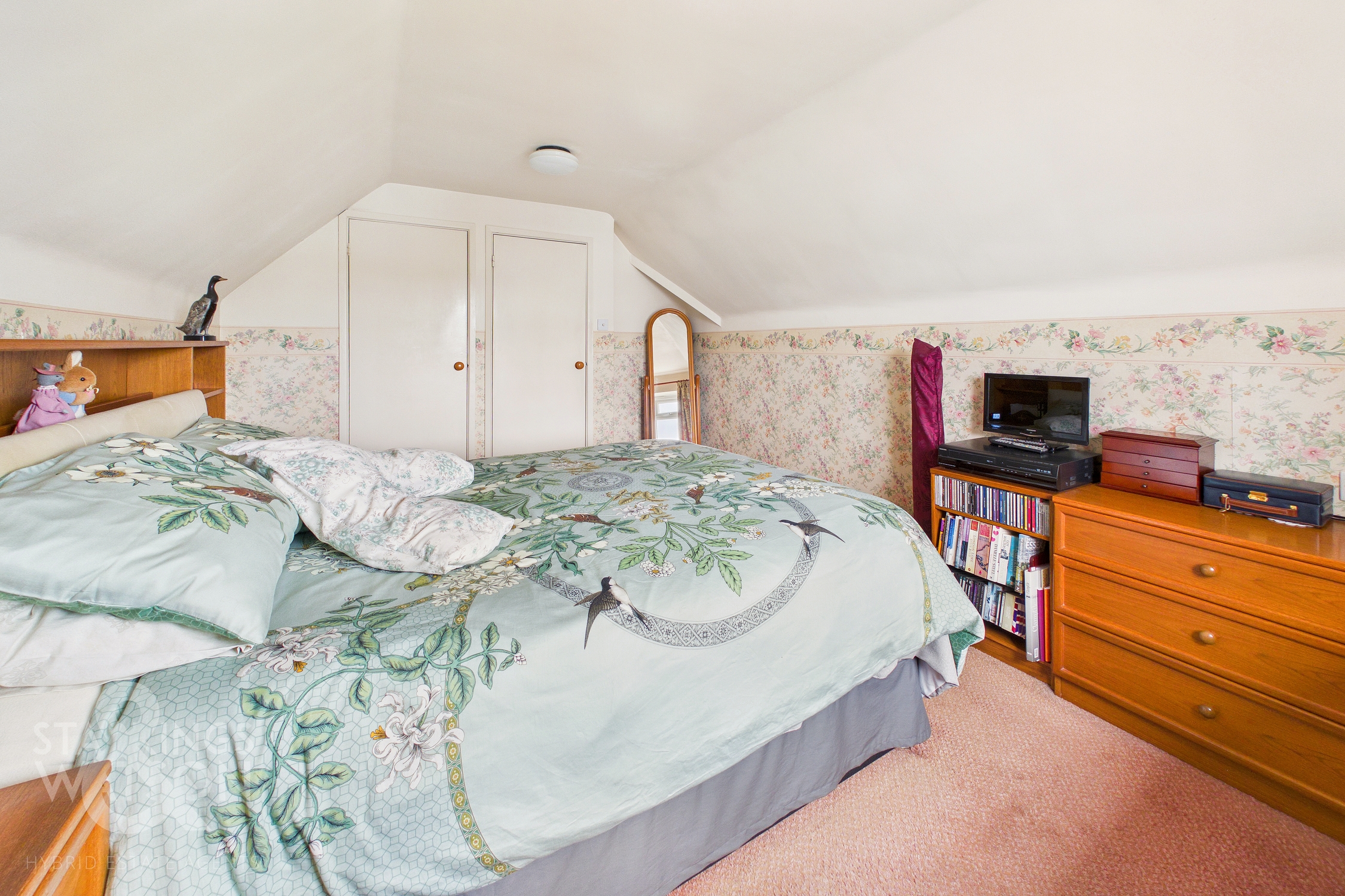 Heading upstairs, the carpeted landing offers a range of built-in storage with a side facing window and fitted carpet underfoot. Two double bedrooms lead off, both finished with fitted carpet and uPVC double glazing, with a range of built-in storage and eaves storage.