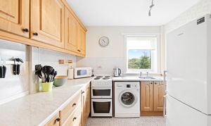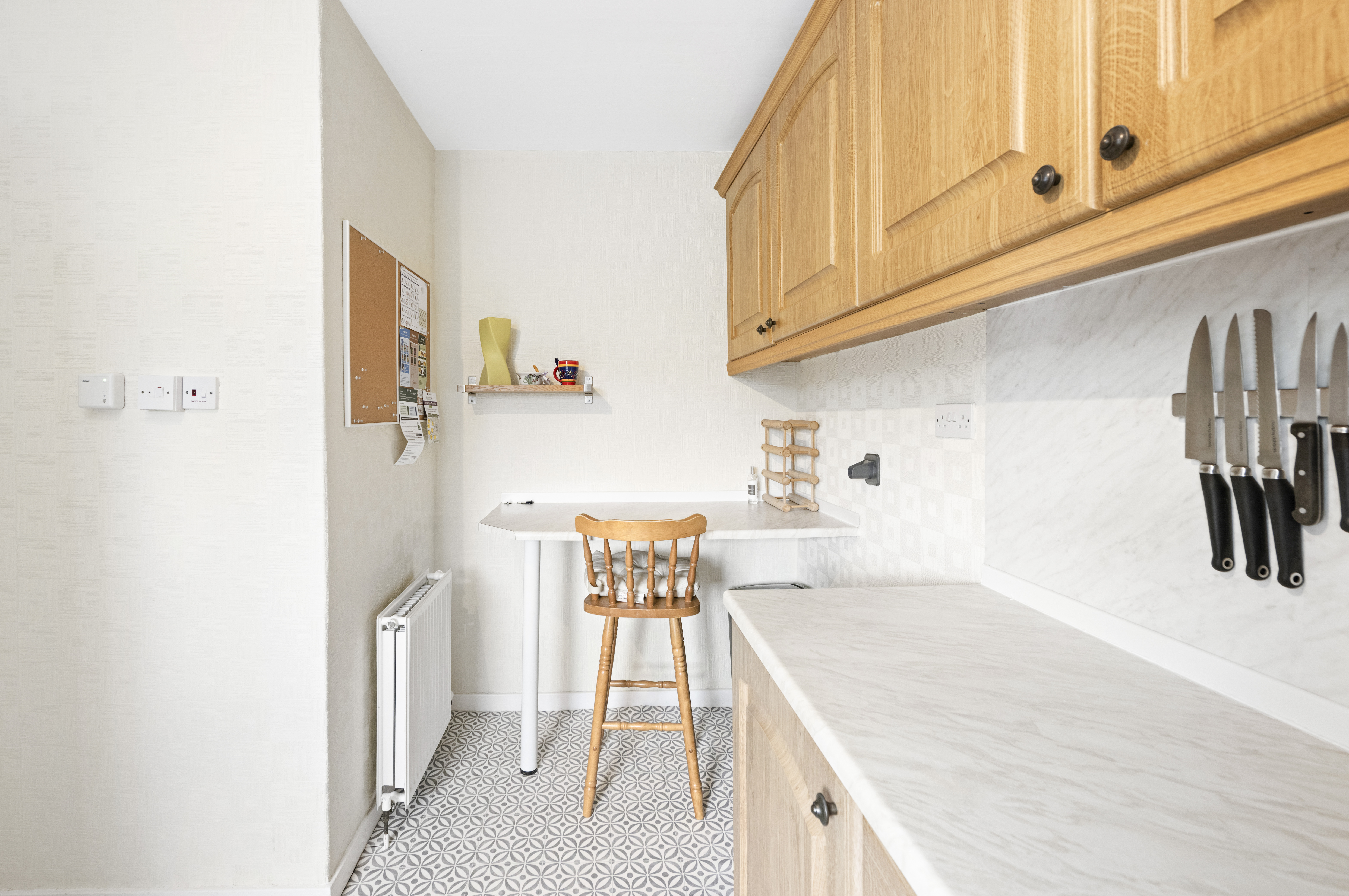 Fitted with base and wall mounted units, drawers, complementary worktops including breakfast bar and splashbacks, stainless steel sink with side drainer. The washing machine, fridge/freezer and electric cooker are included in the sale but are not warranted. Rear facing window with roller blind, again offering open views. Radiator, 4-way tracked lighting.