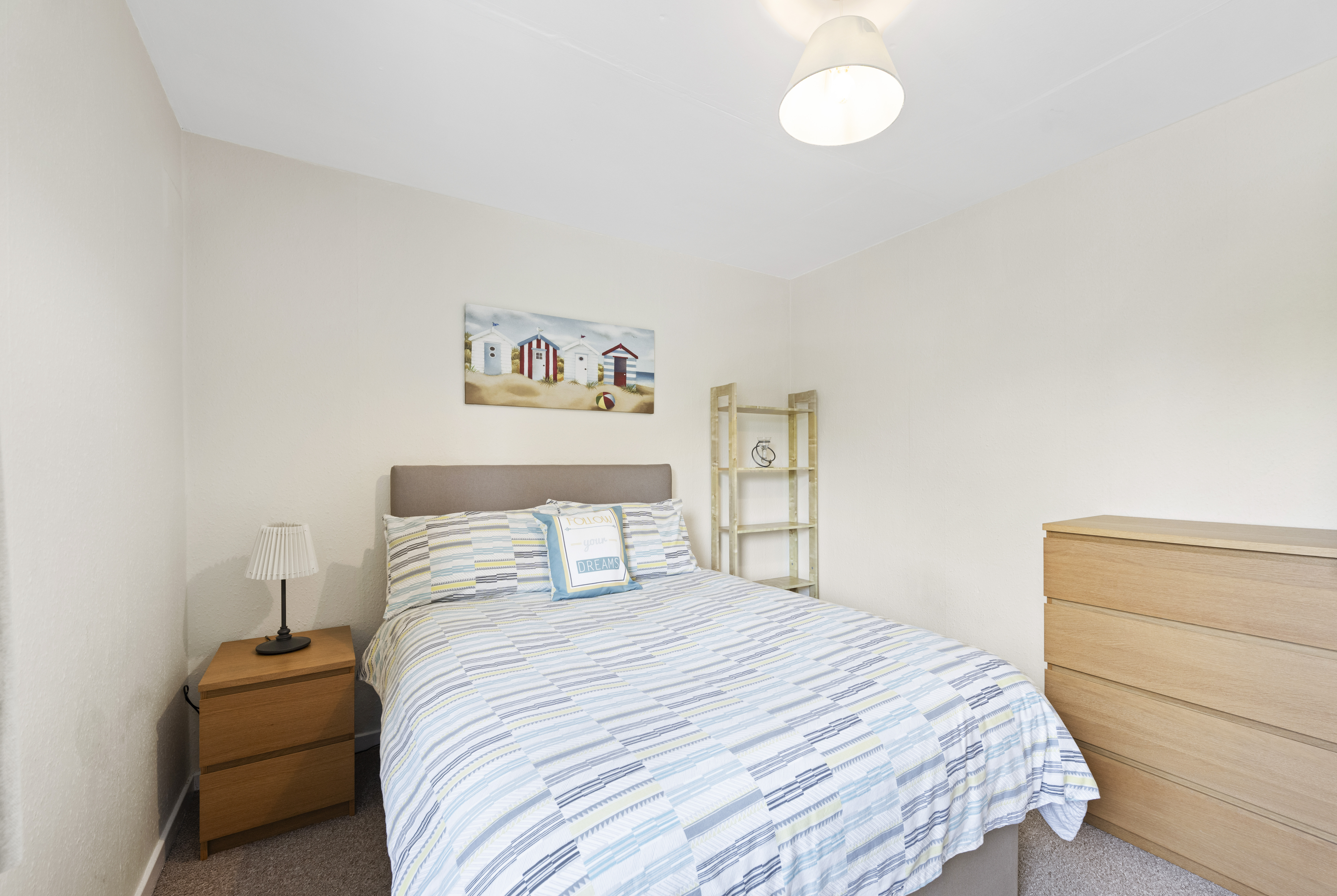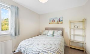 Another double bedroom with front facing window offering woodland views, vertical blind, tab top curtains and pole. Fitted cupboard with shelf and hanging rail. Radiator.