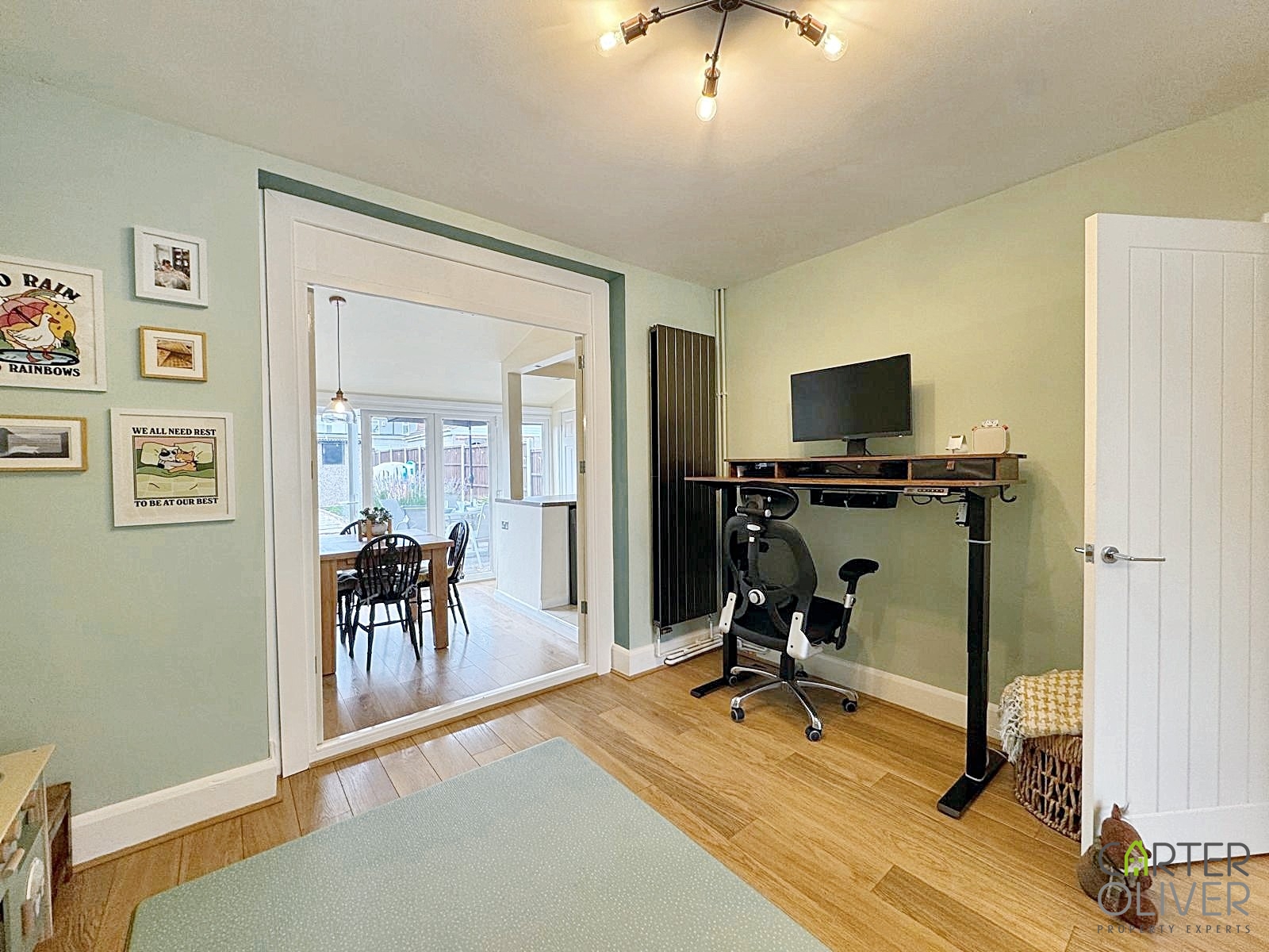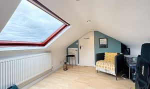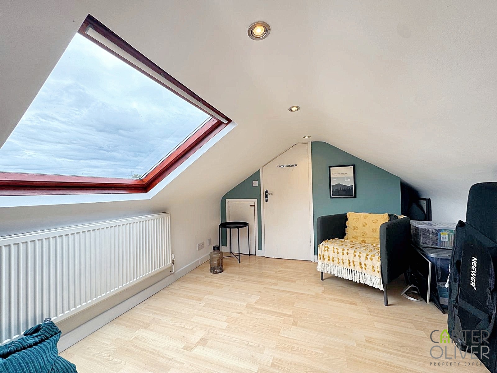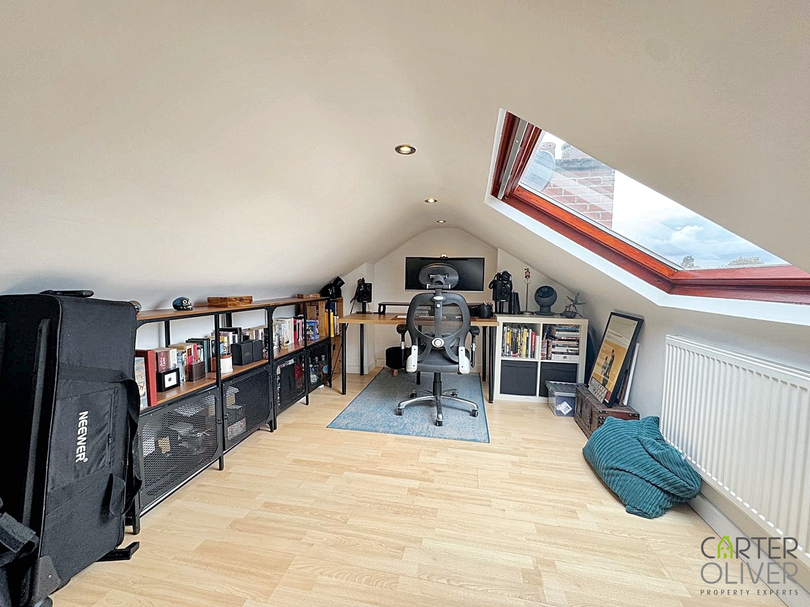 Outdoor living is truly a highlight of this home. Bi-fold doors open from the dining area onto a spacious patio, perfect for al fresco dining and entertaining, while the private, fenced garden is beautifully landscaped with flower beds, lush lawns, and dedicated children's play areas - ideal for families seeking both relaxation and recreation. The well-maintained garden also benefits from the garage for added storage and a secure environment for children to play. Off-road parking is provided via a spacious paved driveway, offering every-day convenience and peace of mind. The property’s attic rooms, complete with skylights and Velux windows, provide flexible spaces ideal for a home office, creative studio, or a cosy retreat, all flooded with natural light and featuring practical built-in shelving.