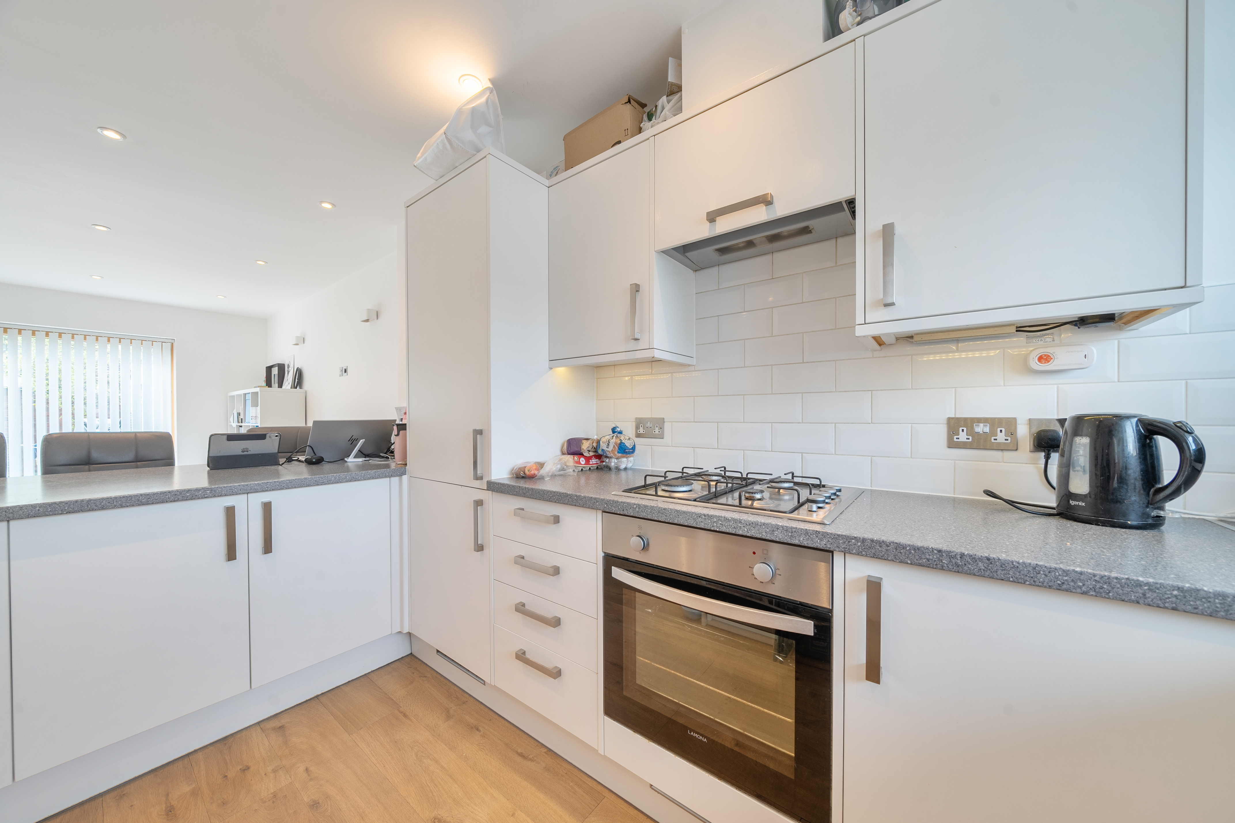 Upon entering, you are welcomed by an inviting open plan living area that is flooded with abundant natural light, creating a warm and airy atmosphere throughout. The modern kitchen is fitted with a range of integrated appliances (including oven, hob, fridge freezer, and dishwasher), sleek cabinetry, and ample workspace, making it ideal for both every-day living and entertaining guests. The spacious lounge and dining area seamlessly connect, providing a versatile space for relaxation and social gatherings. Upstairs, the property features three well-proportioned bedrooms, each offering a tranquil retreat at the end of the day. The principal bedroom benefits from a stylish ensuite bathroom, finished to a high standard, while the additional bedrooms are served by a contemporary family bathroom.