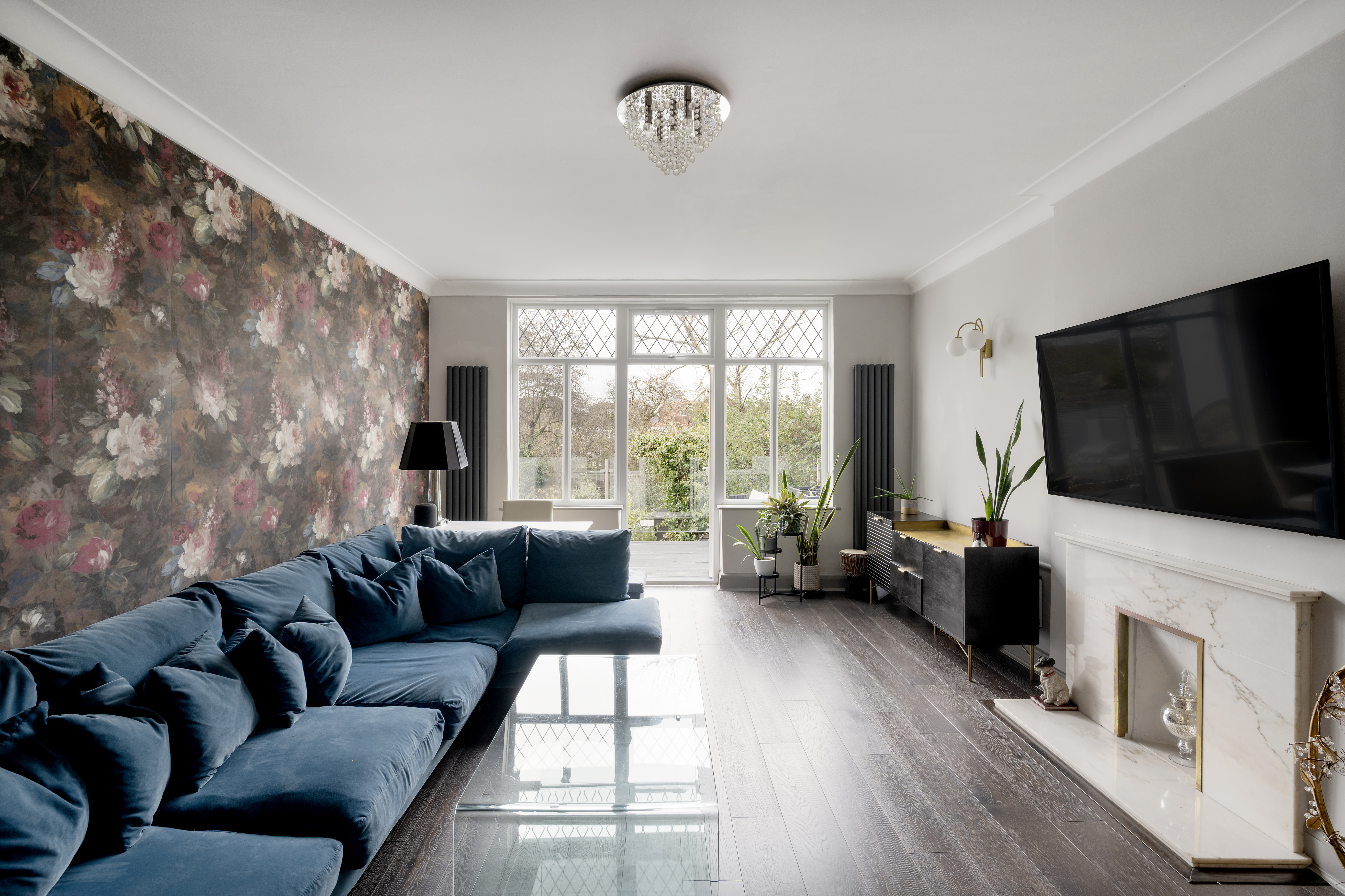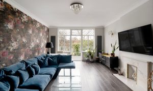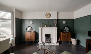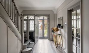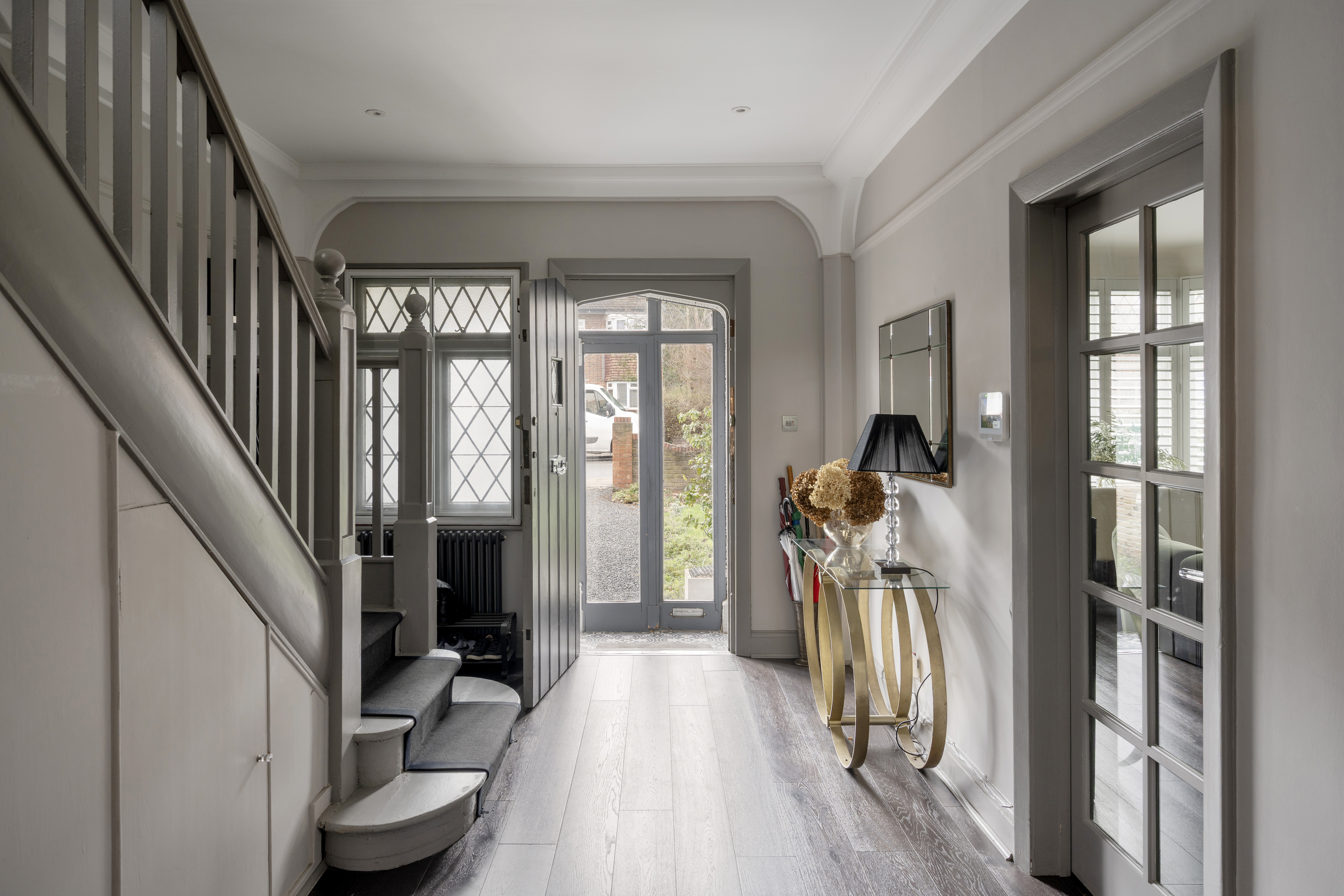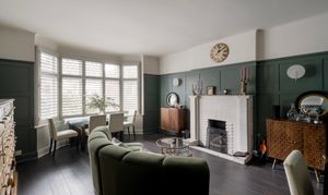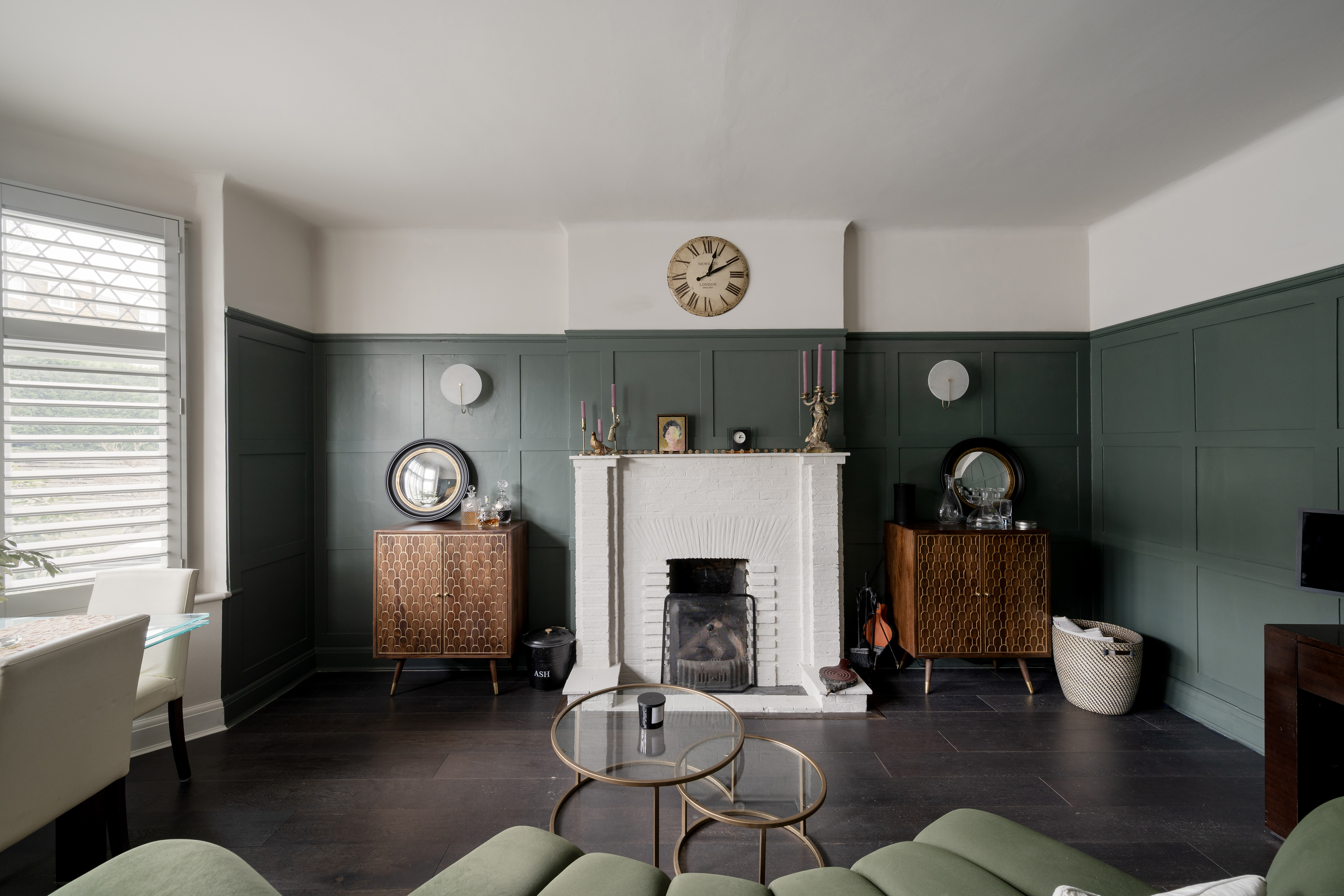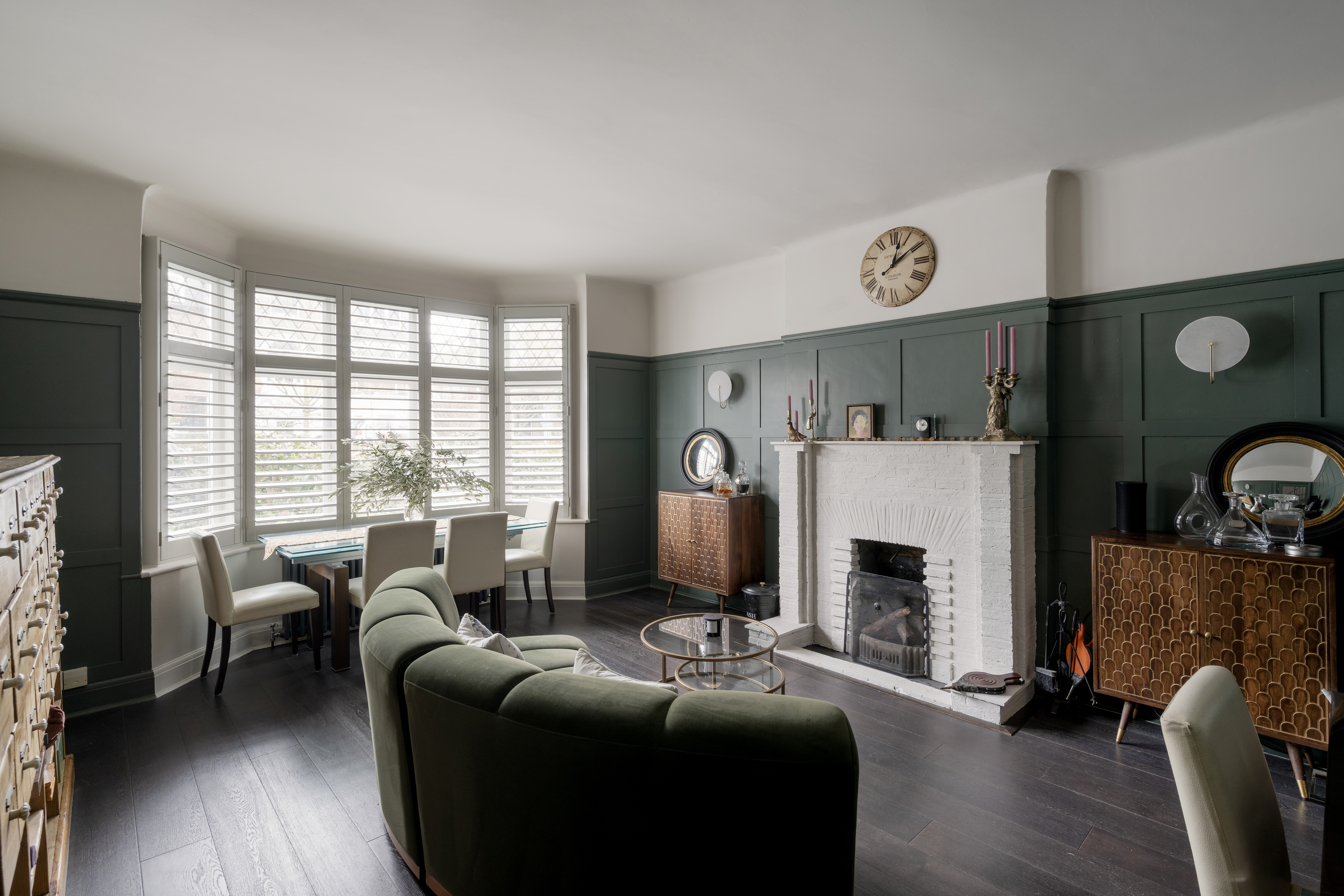 Behind its attractive exterior, the home opens into a welcoming entrance hall which seamlessly flows into a large rear reception room with views directly onto the garden. A second reception space, also used as a dining room, sits opposite the staircase and features a large bow window, working fireplace, and wooden panelling finished in Farrow & Ball to create a refined space suited to both cosy evenings and more formal entertaining.