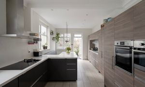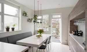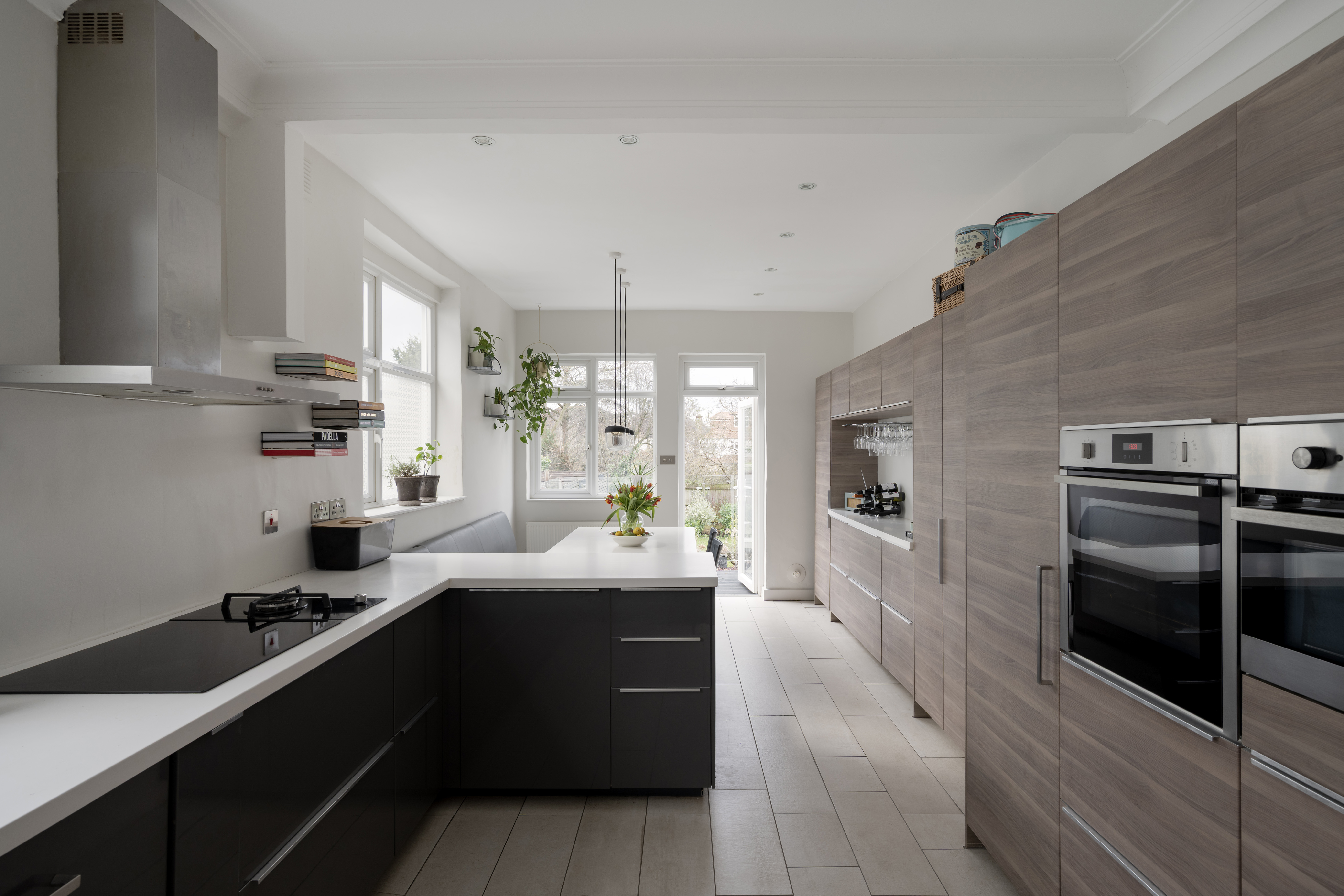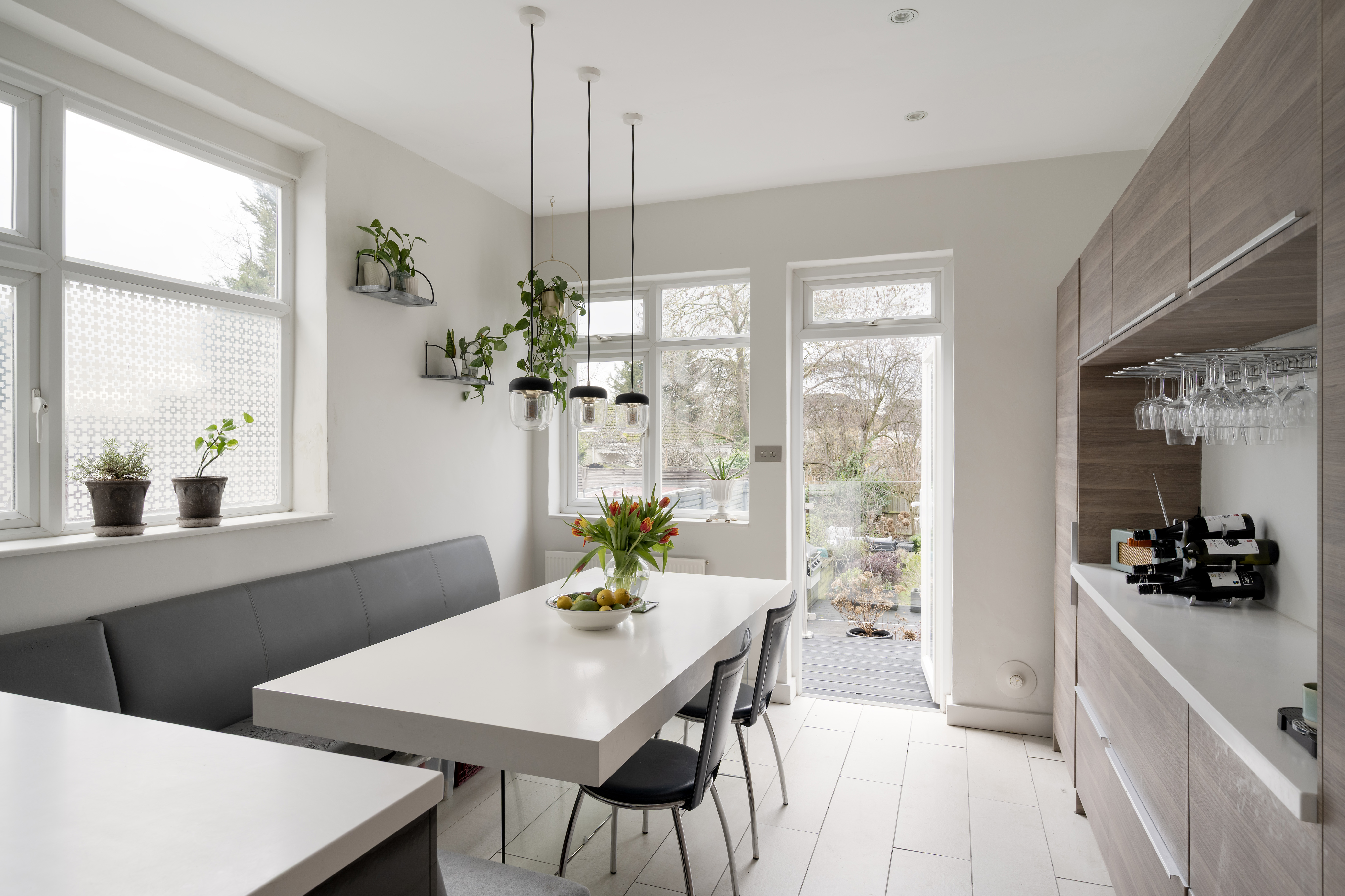 Engineered wood flooring runs throughout the downstairs living areas, except for the kitchen, which benefits from underfloor heating powered by the gas-fired central heating system. The light-filled kitchen and dining space, with sleek contemporary cabinetry, integrated appliances (including both gas and induction hobs), and expansive worktops, forms a practical and sociable heart of the home. Large windows draw in natural light, while a direct door to the decking provides a seamless connection to the garden which is perfect for summer gatherings. The kitchen is further complemented by a separate utility room, and a downstairs toilet (one of four in total) is found underneath the stairs.