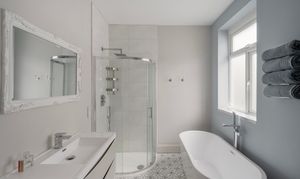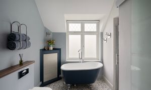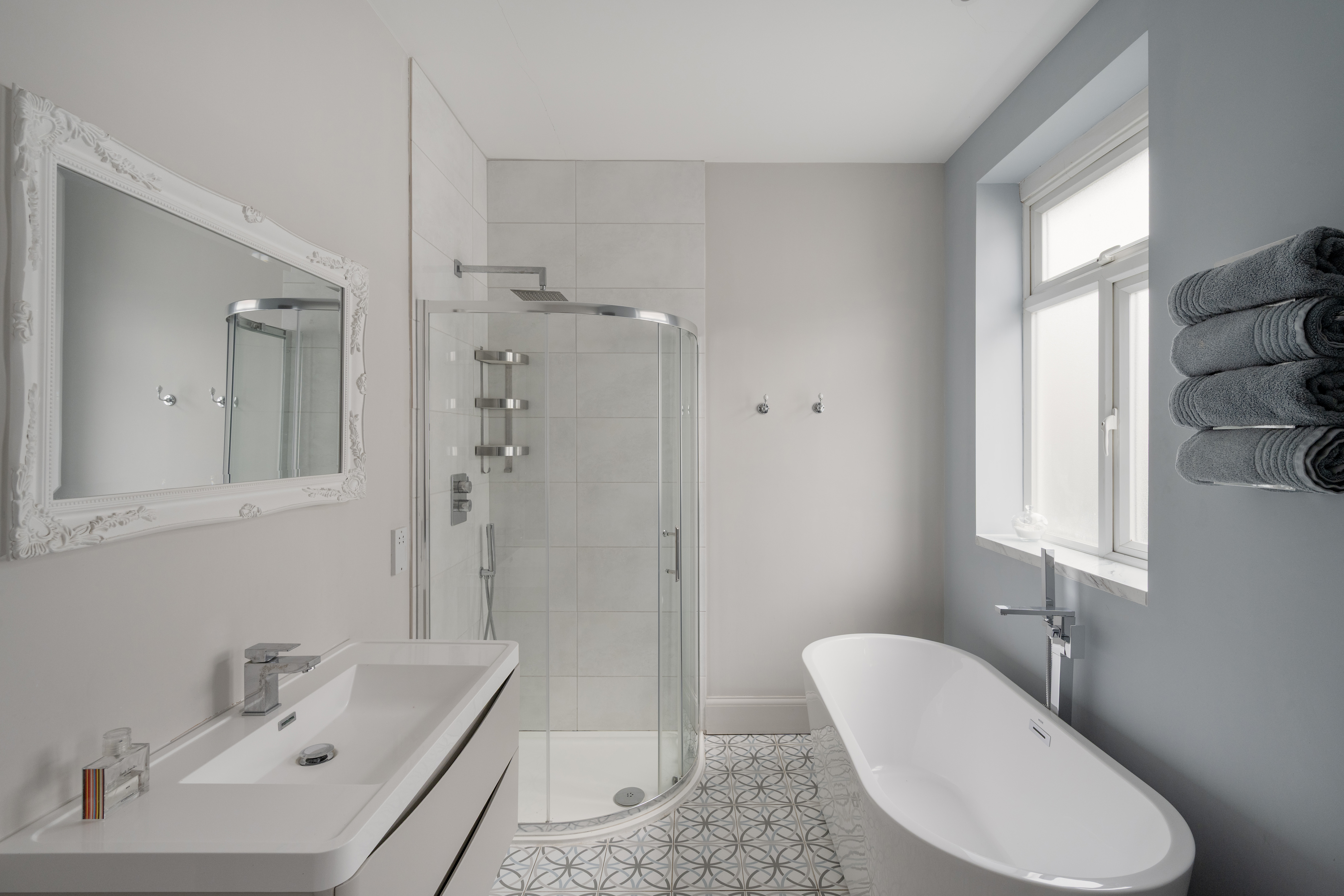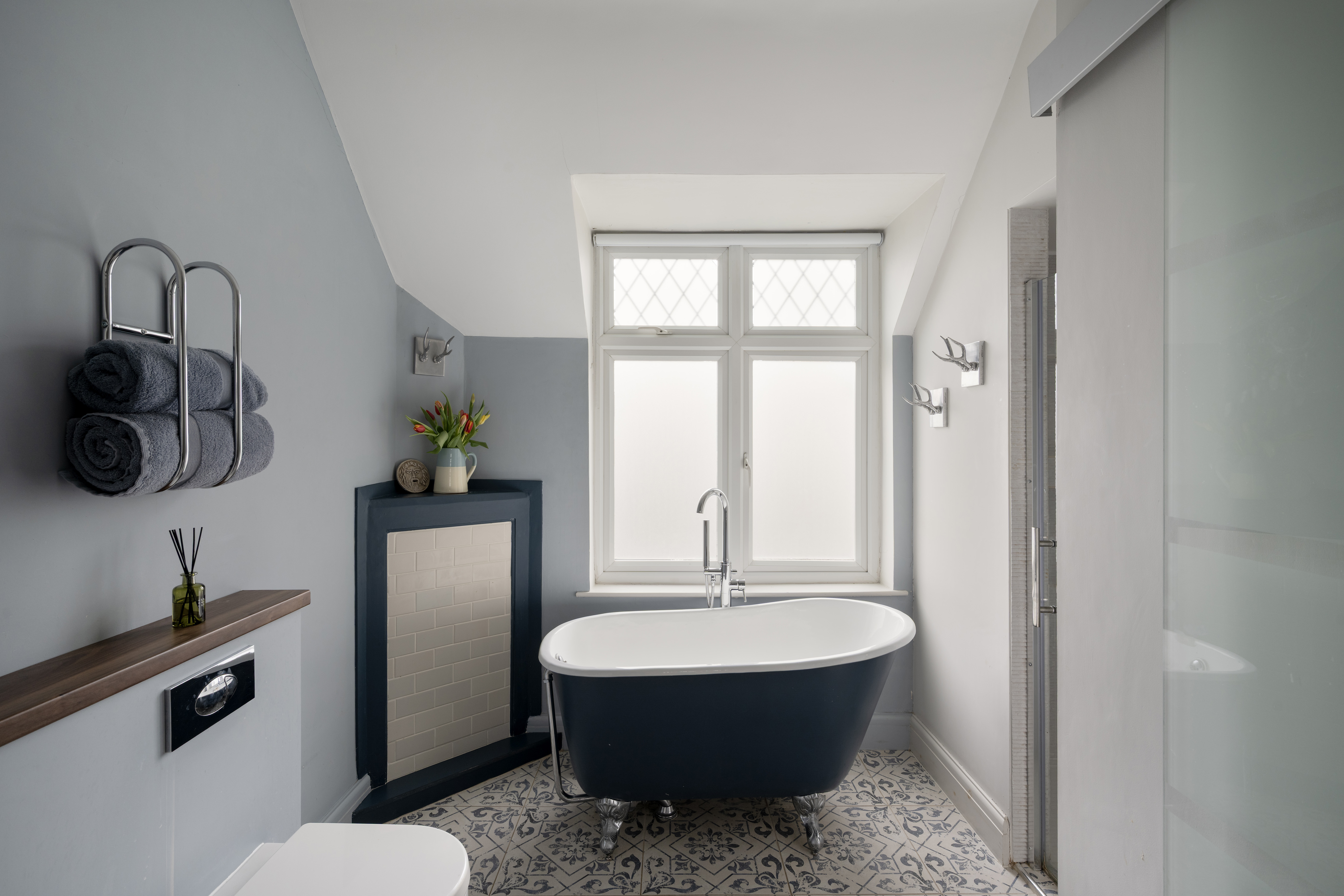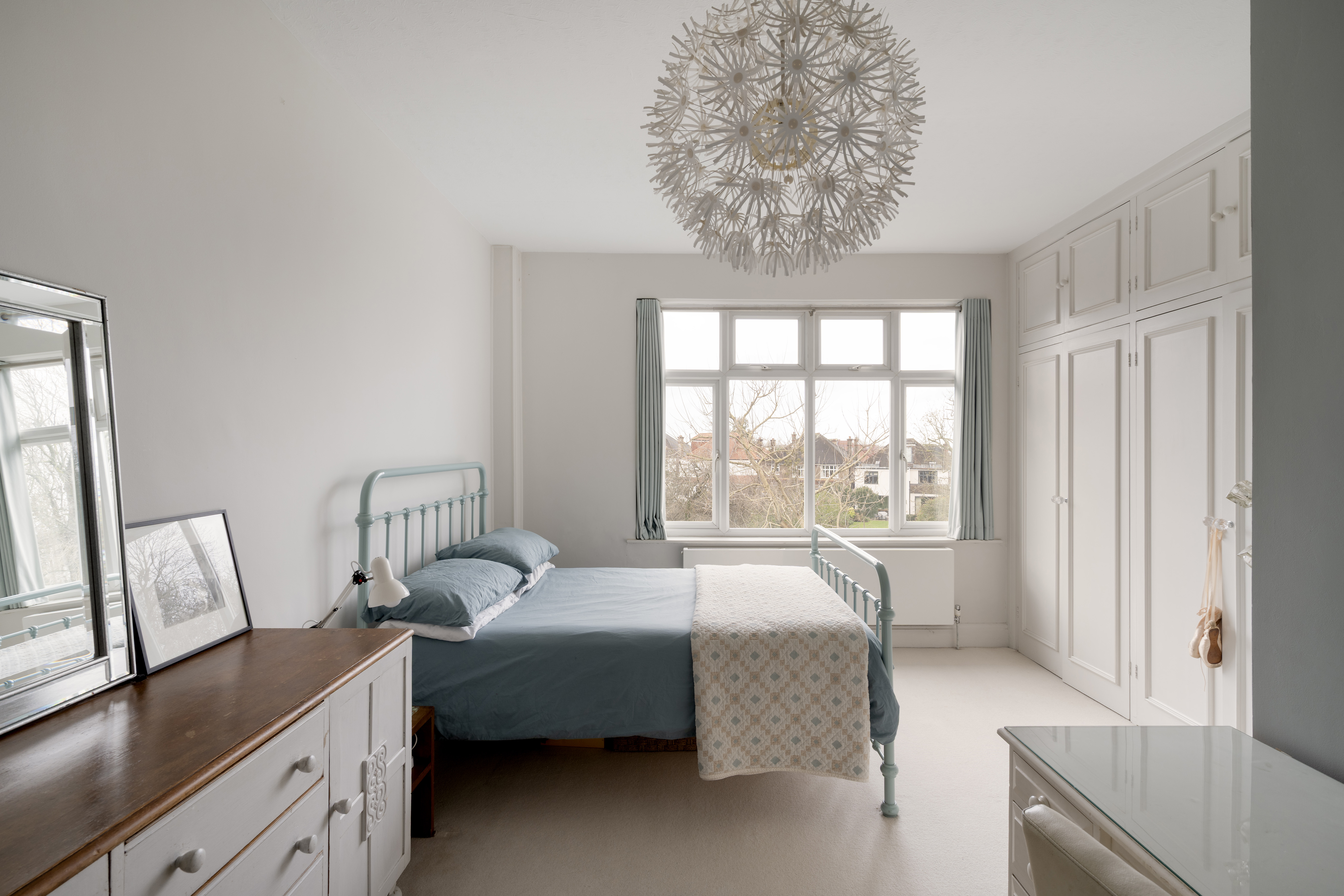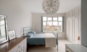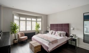 Upstairs, the property offers four well-proportioned bedrooms, with wood flooring continuing the aesthetic from downstairs. The principal suite spans the front of the house, with a large bow window drawing in natural light from a second bow window, alongside ample built-in storage, creating a calm and modern retreat. A large en suite bathroom, complete with a separate shower and freestanding roll-top bath, adds a luxurious touch.