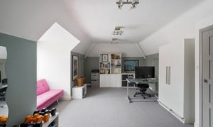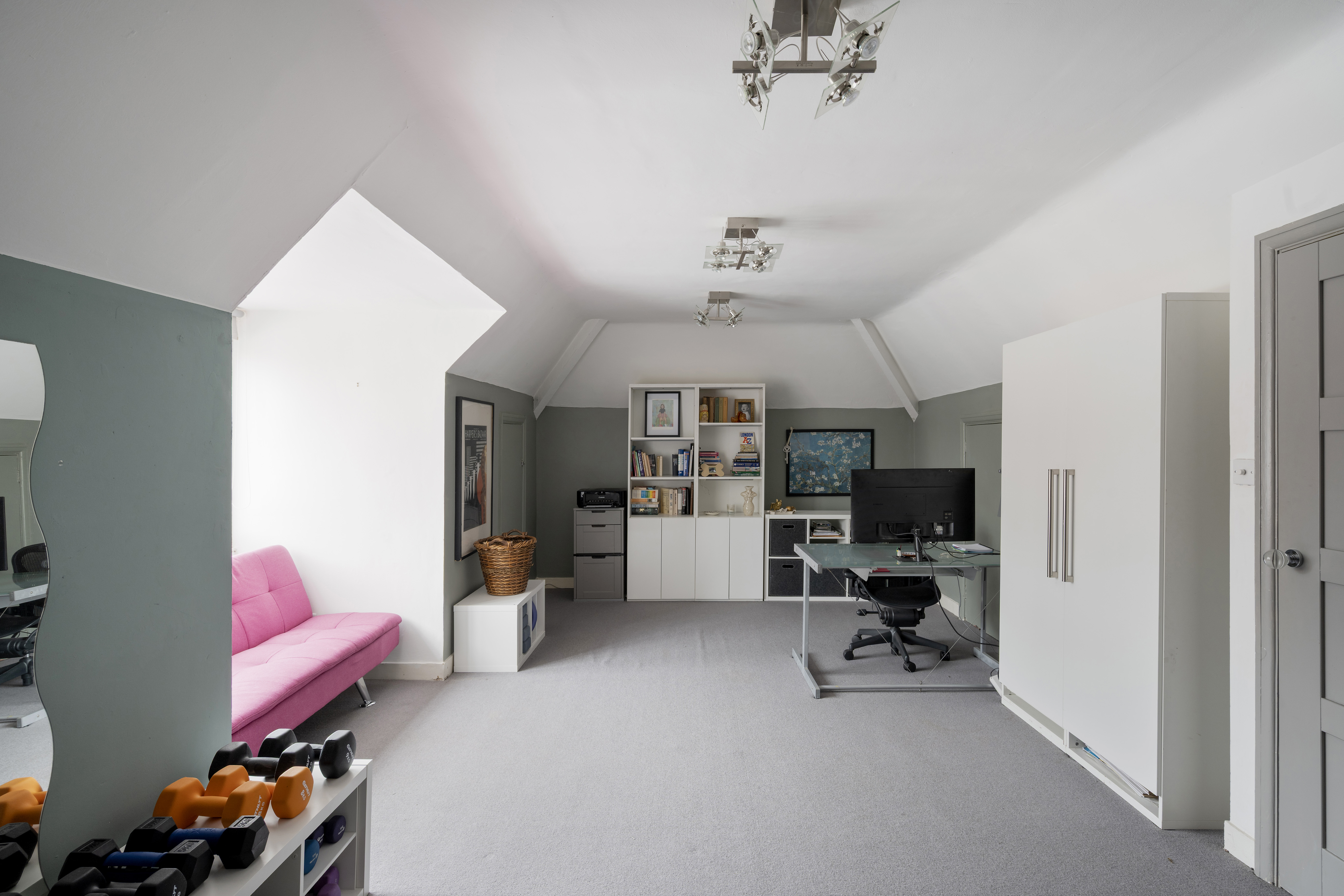 Two further bedrooms (one with an en suite) on this floor are versatile, ideal for children, guests, or working from home, and are also served by a well-appointed family bathroom with a separate walk-in shower. On the second floor, a substantial additional bedroom, workspace, or studio spans the top level. Extensive eaves storage is found on all sides, and this floor offers potential for further extension (STPP).
