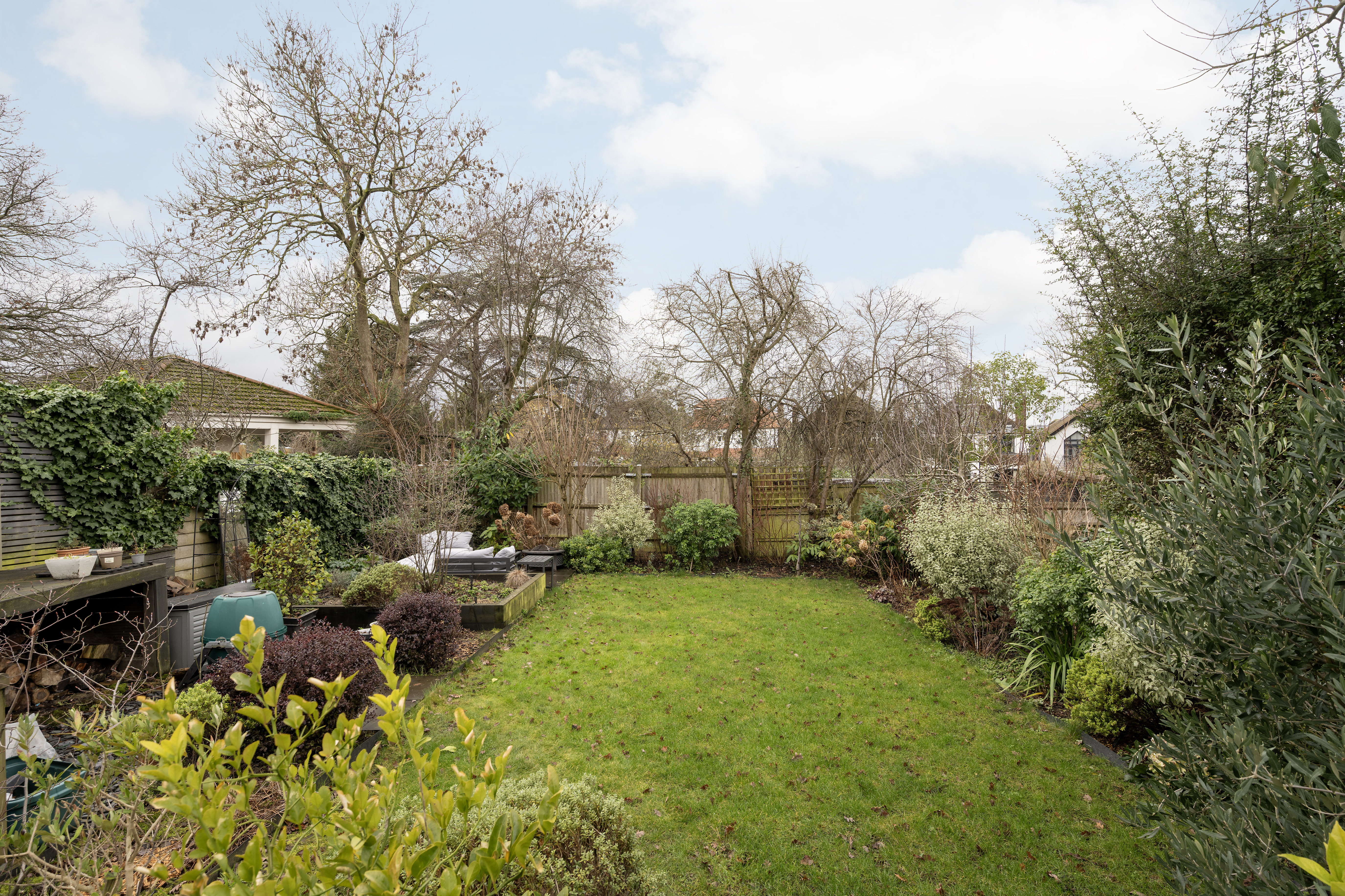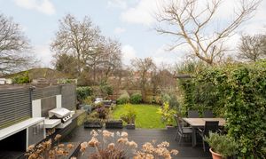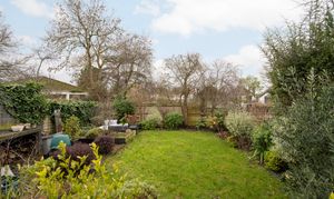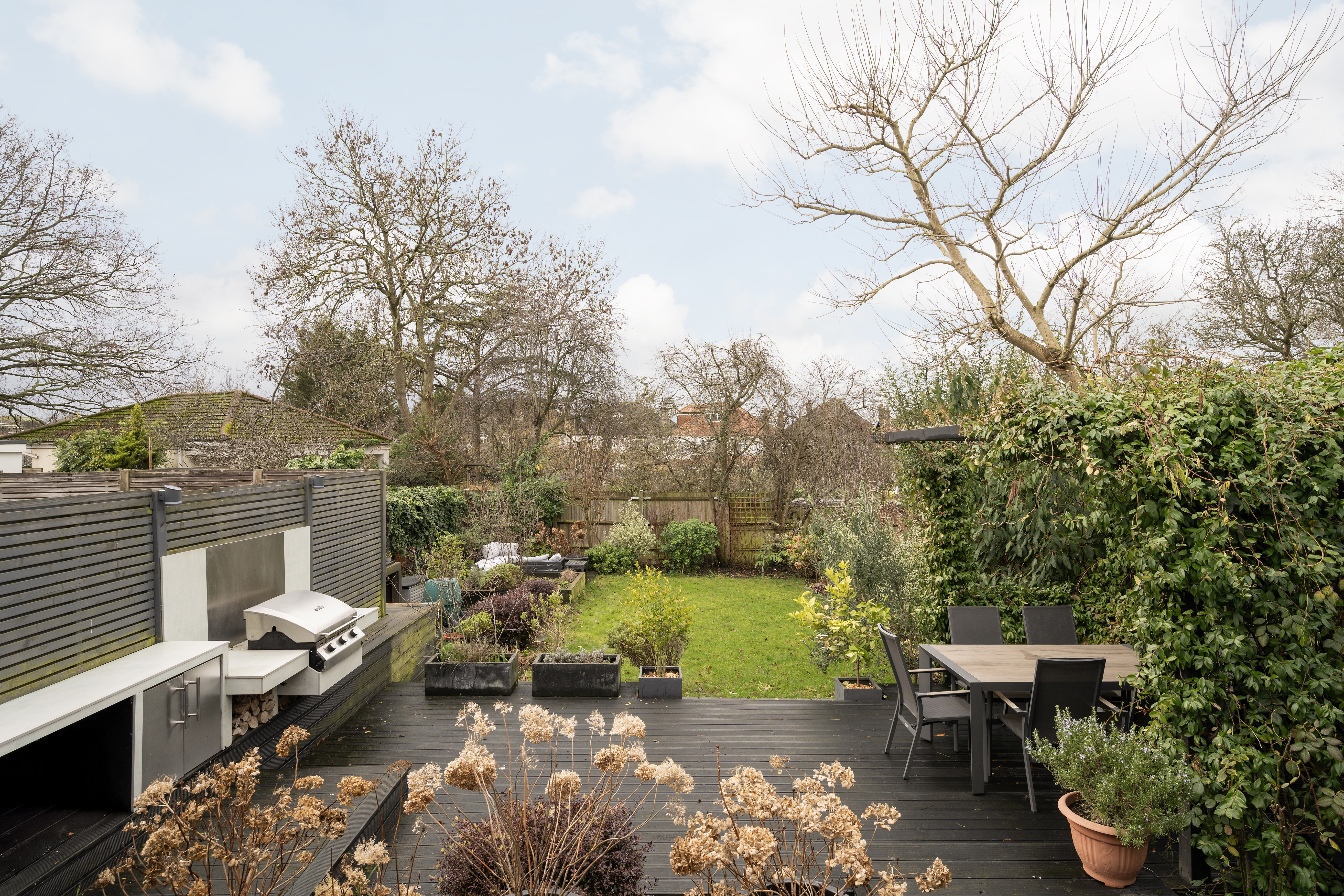 Outside, the rear garden is a standout feature. A large, decked terrace provides ample space for outdoor dining and entertaining, leading onto a mature lawn bordered by established planting and enjoying sunlight throughout much of the day. A shared driveway with potential for gated off-street parking sits alongside the home, and a side gate provides convenient garden access.