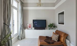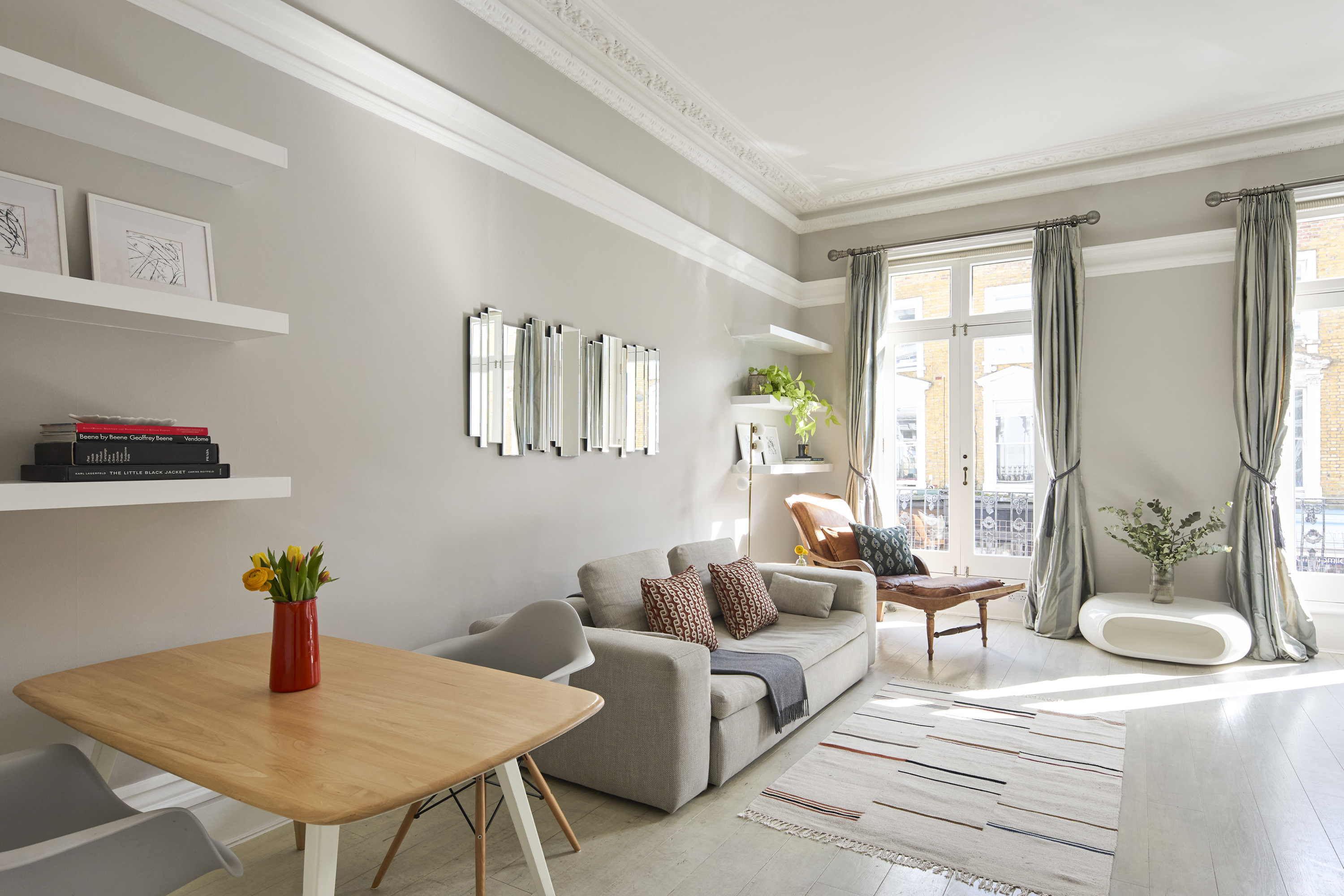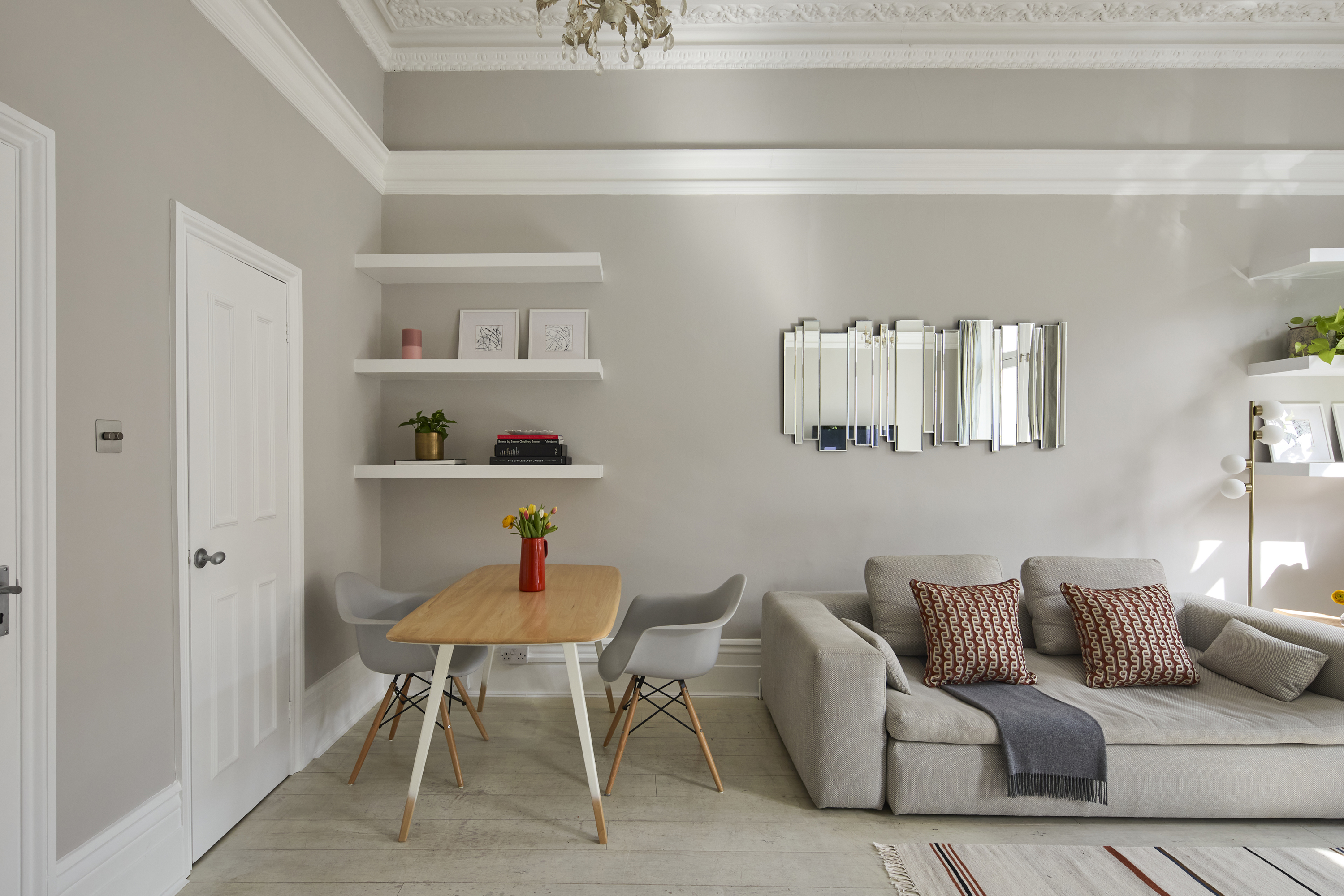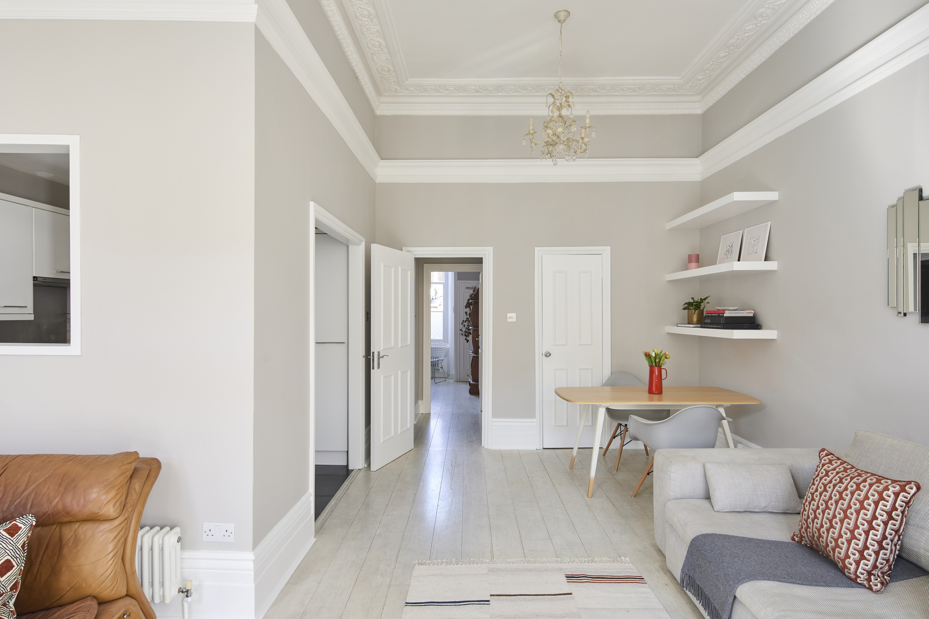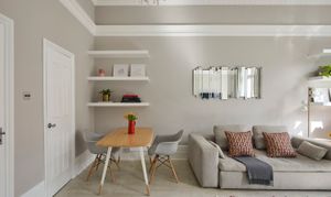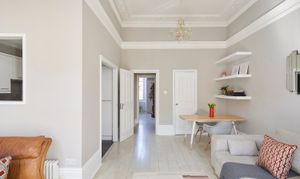 Located down a pretty, cobbled mews and set on the first floor of a Victorian conversion, this one-bedroom flat arrives with all the historic detail you'd hope for. Period bones are very much intact; intricate cornicing, handsome picture rails and tall sash windows that draw in the light. These sit comfortably alongside more modern instincts — a sleek monochrome kitchen, built-in storage and neatly judged floating shelves in the living space.