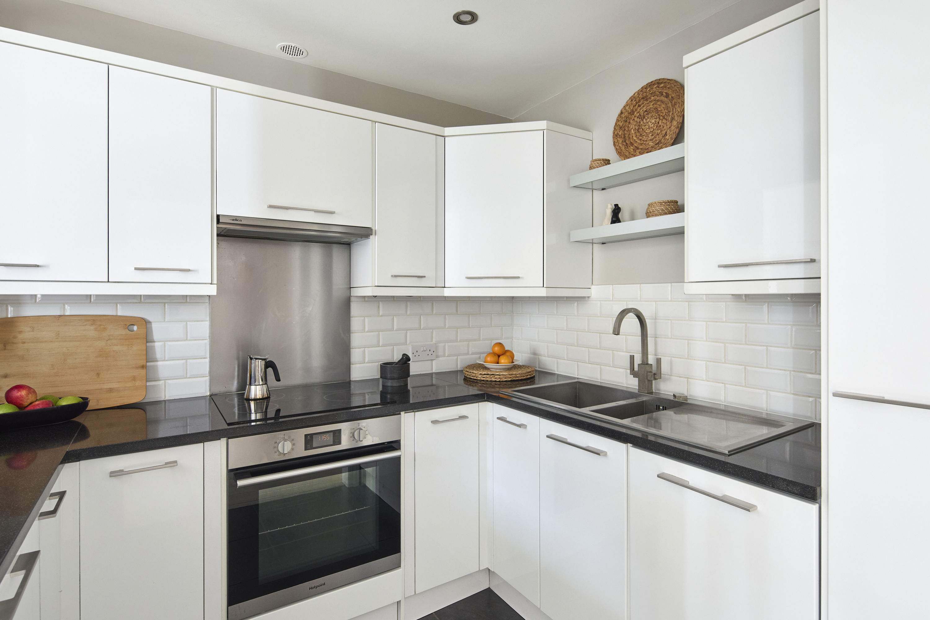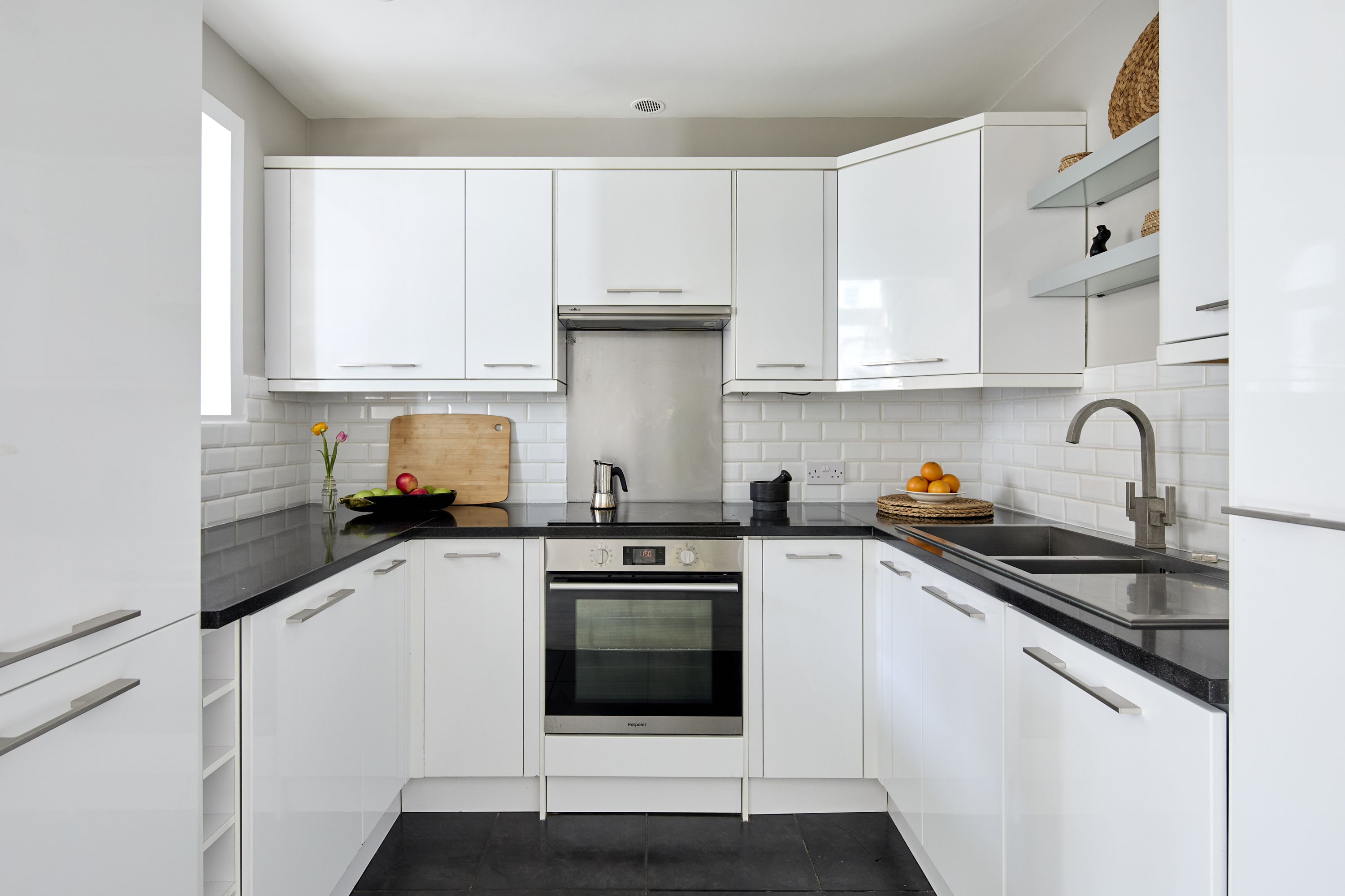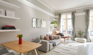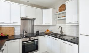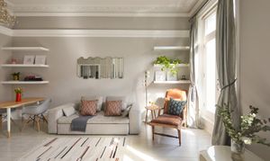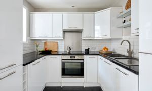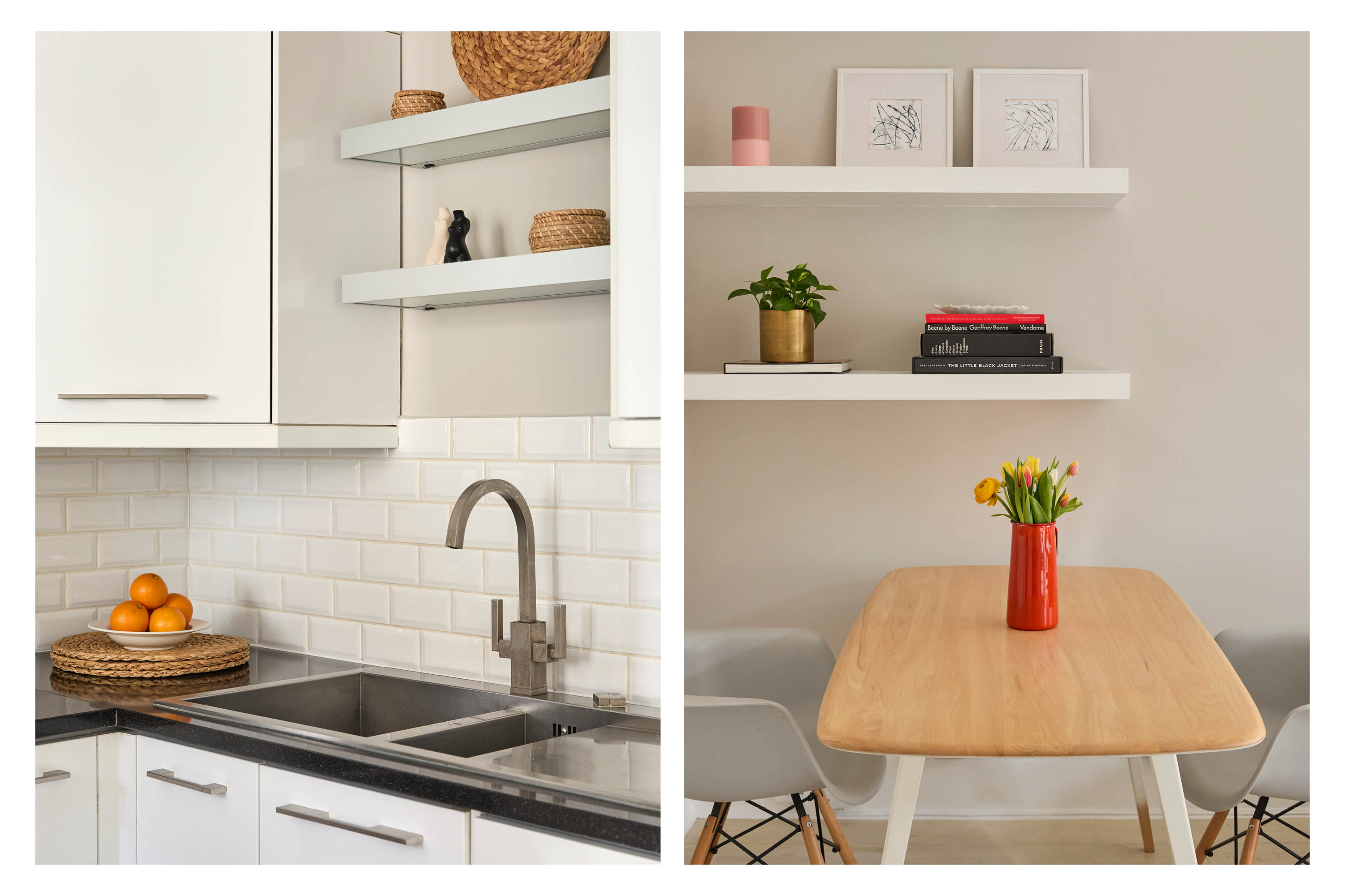 Located down a pretty, cobbled mews and set on the first floor of a Victorian conversion, this one-bedroom flat arrives with all the historic detail you'd hope for. Period bones are very much intact; intricate cornicing, handsome picture rails and tall sash windows that draw in the light. These sit comfortably alongside more modern instincts — a sleek monochrome kitchen, built-in storage and neatly judged floating shelves in the living space.
