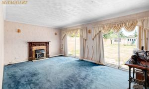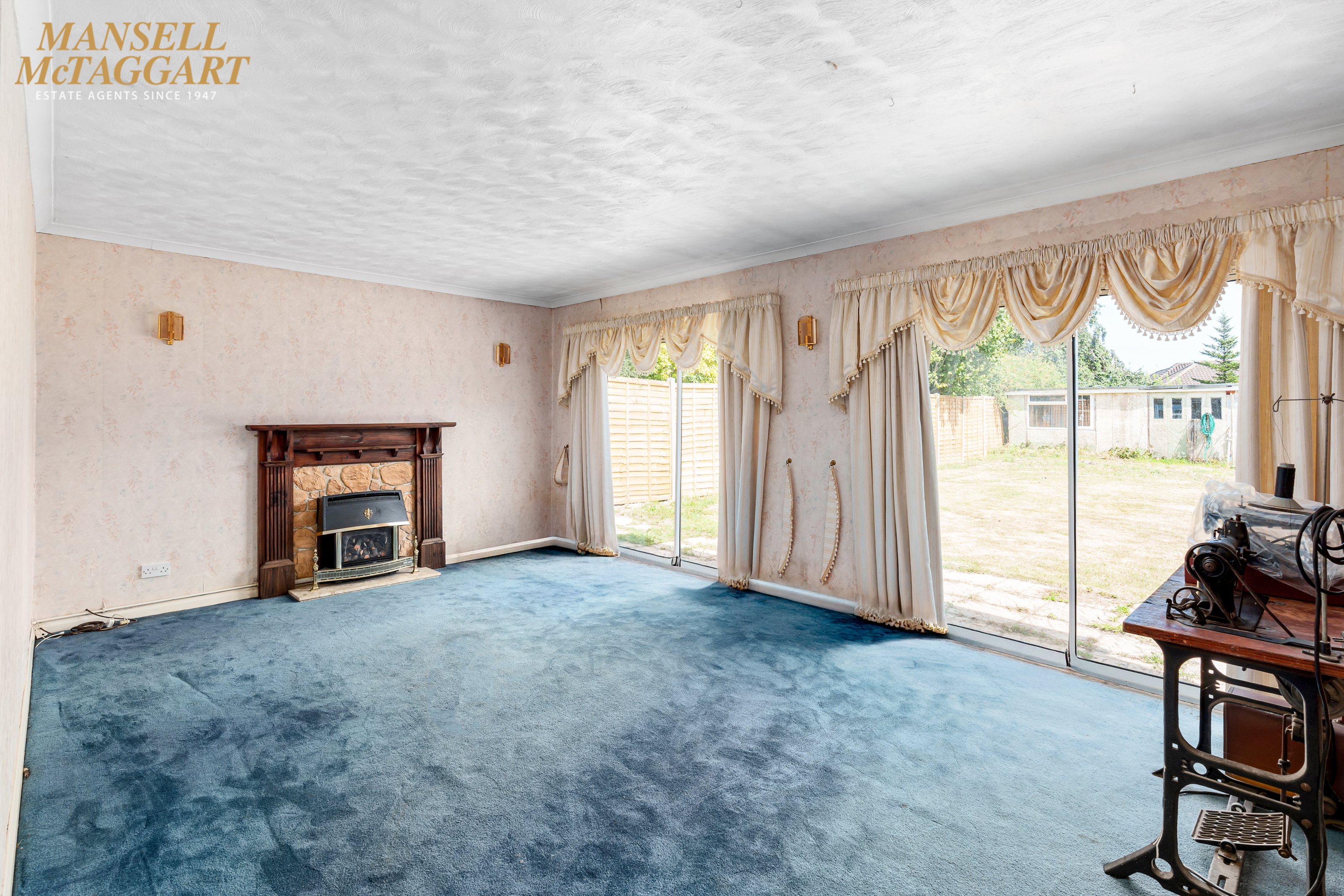 Living/dining room: A large, bright, L-shaped carpeted room with gas fireplace, multiple power sockets, TV point and two sliding double glazed doors into rear garden.