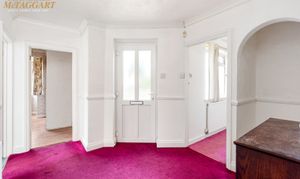 Hallway: Carpeted hallway with doors leading to all rooms, loft hatch accessing roof space, fuse board.