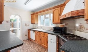 Kitchen: A number of eye and base level wooden units with laminate wood countertops, breakfast bar, integrated oven/grill with 4 ring gas hob/extractor hood, Worcester boiler mounted on floor, vinyl flooring, arch leading to utility room with tall storage cupboard and power/plumbing for washing machine and tumble dryer stack. There is a frosted uPVC double glazed window in the kitchen to the side, the utility has uPVC double glazed windows and patio door to rear garden.