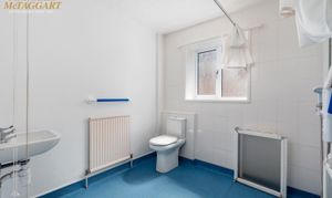 Bathroom: Wet-style shower room with low level w/c, basin, radiator with towel rail, power shower with drain on floor, two tiled walls, linoleum flooring with frosted uPVC double glazed window and extractor fan for ventilation.
