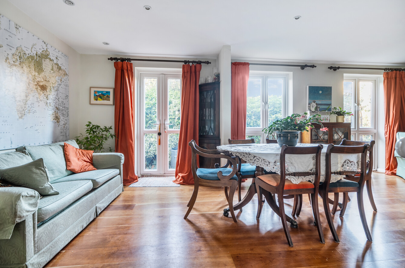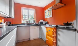 The welcoming entrance hall features a wide staircase and cloakroom, leading to an attractive sitting/dining room with Maple flooring, westerly facing full-height picture windows and French doors. A contemporary log-effect gas fire set into the wall adds a stylish focal point. The modern kitchen is fitted with grey fronted floor and wall units. An Everhot electric Aga-style stove is available by separate negotiation.