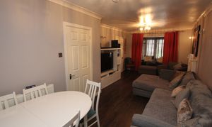 Double aspect room with UPVC double glazed window to front and UPVC double glazed sliding patio door to rear. 2 radiators. Door to kitchen. Wood effect flooring. Space for dining room table and chairs. Please note gas point is still present if one wanted to reinstate a gas fire.
