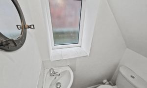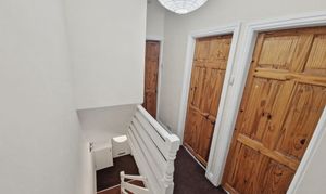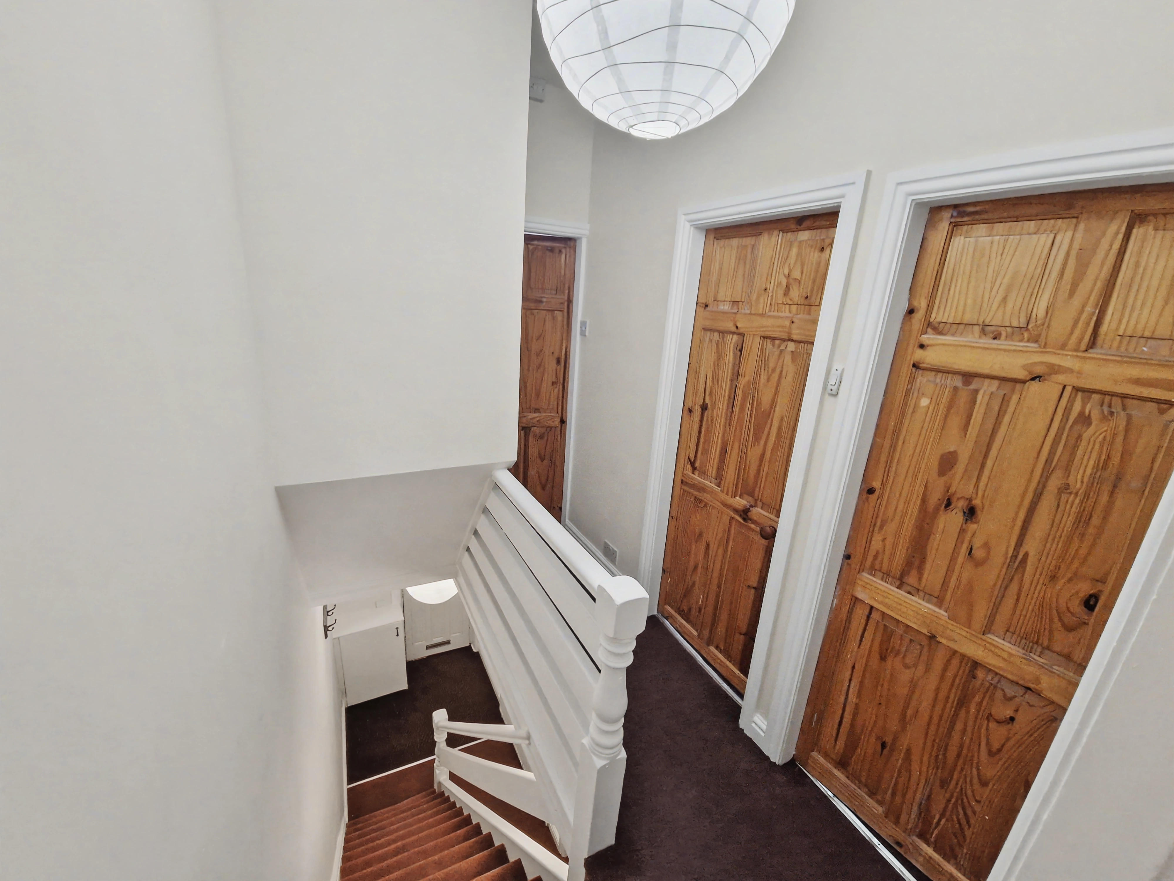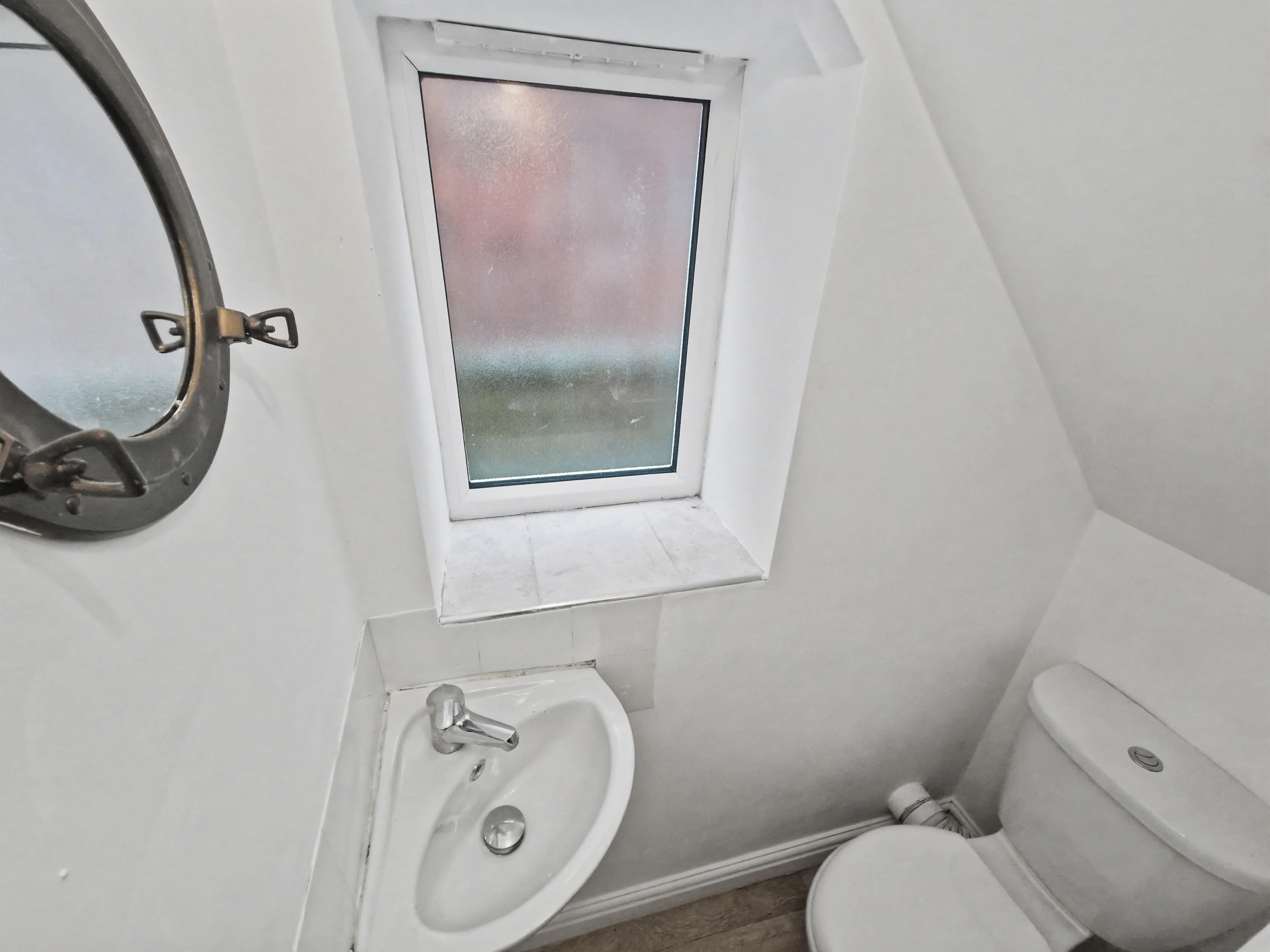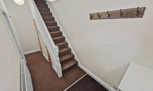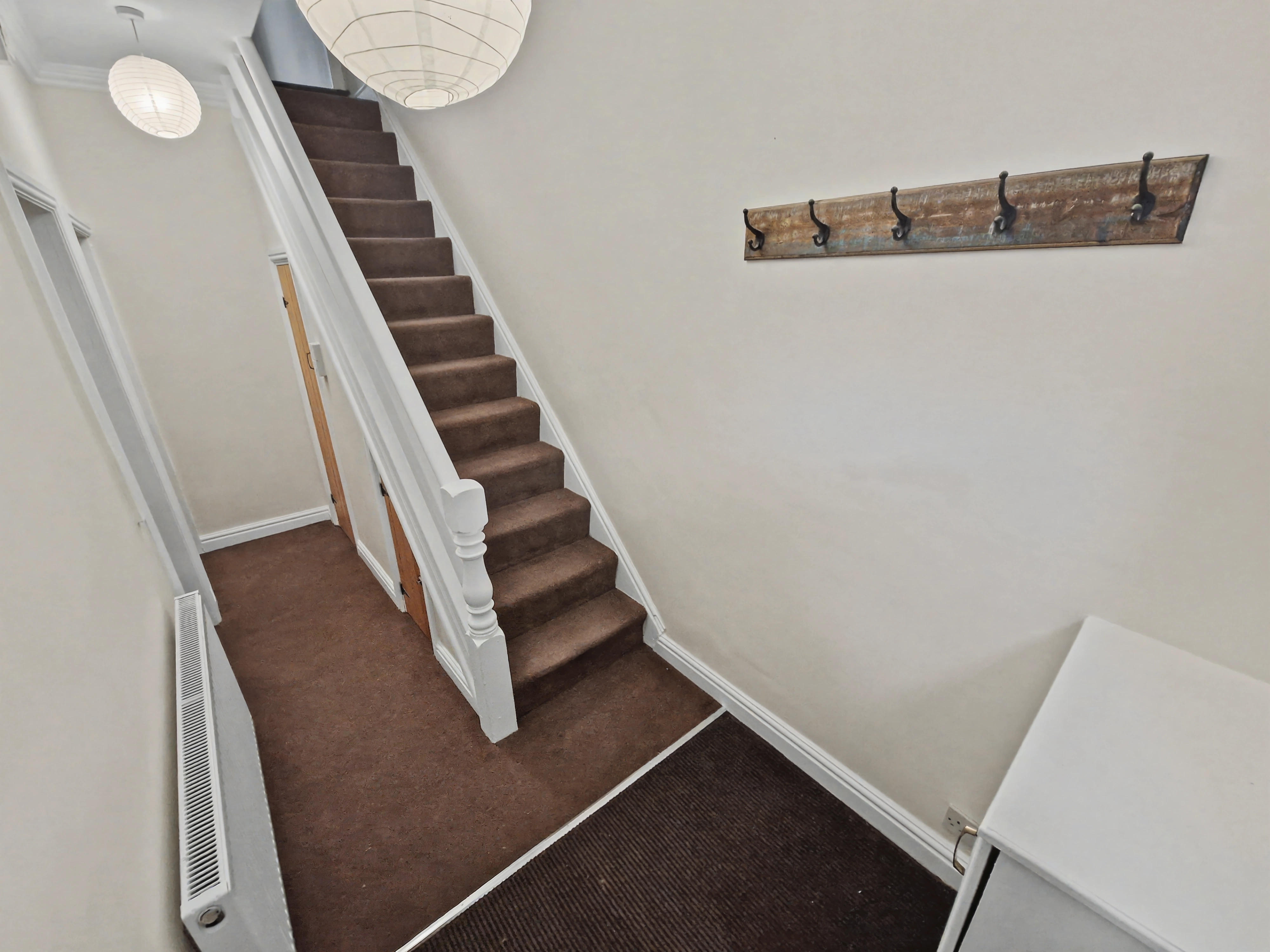The property is approached via the front entrance, leading into a welcoming hallway with stairs rising to the first-floor landing. Beneath the stairs is a convenient downstairs WC with wash basin.