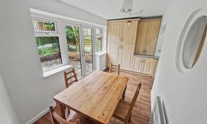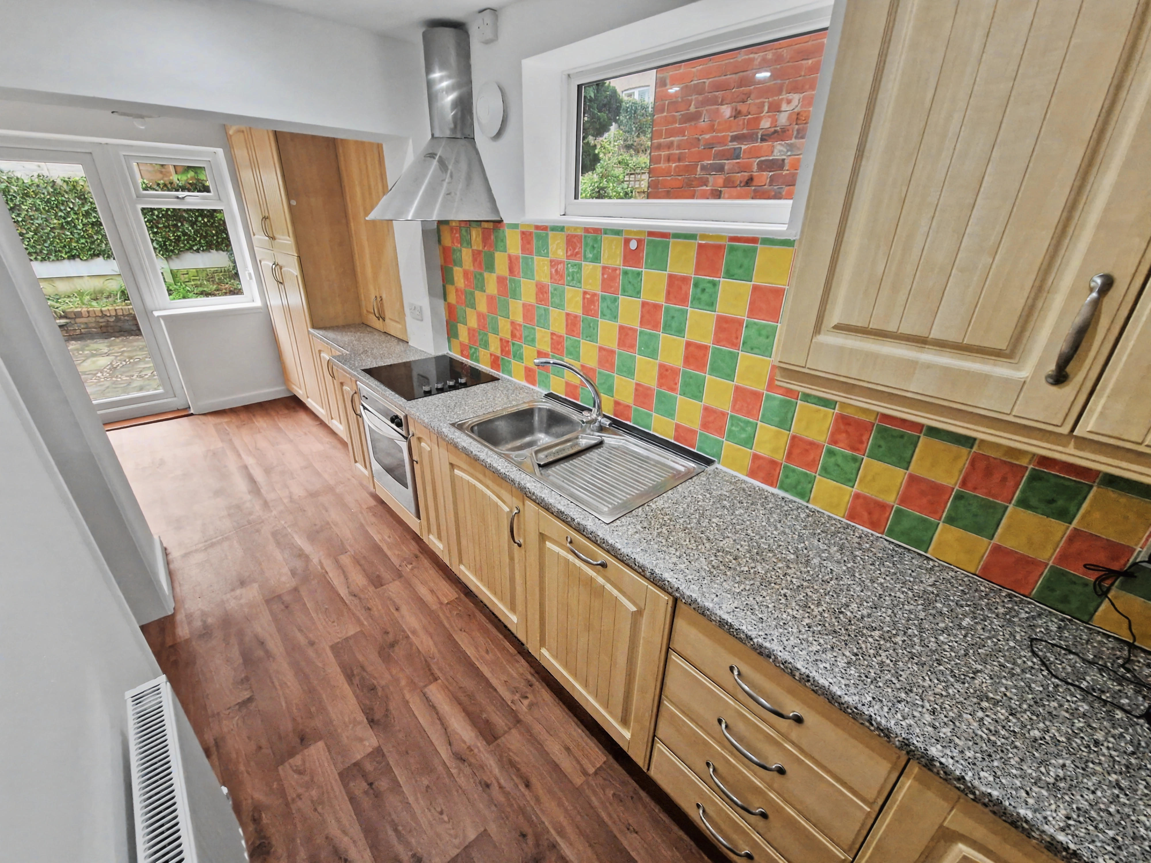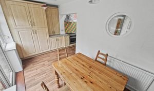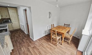 The dining kitchen is well proportioned and fitted with a range of base and wall units, along with integrated appliances including a fridge, freezer, oven with electric hob, and dishwasher. The dining area comfortably accommodates a family dining table, while uPVC double-glazed doors open out to a well-maintained rear yard, ideal for outdoor seating or low-maintenance enjoyment.