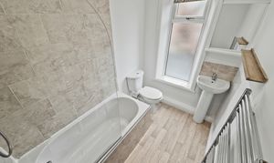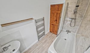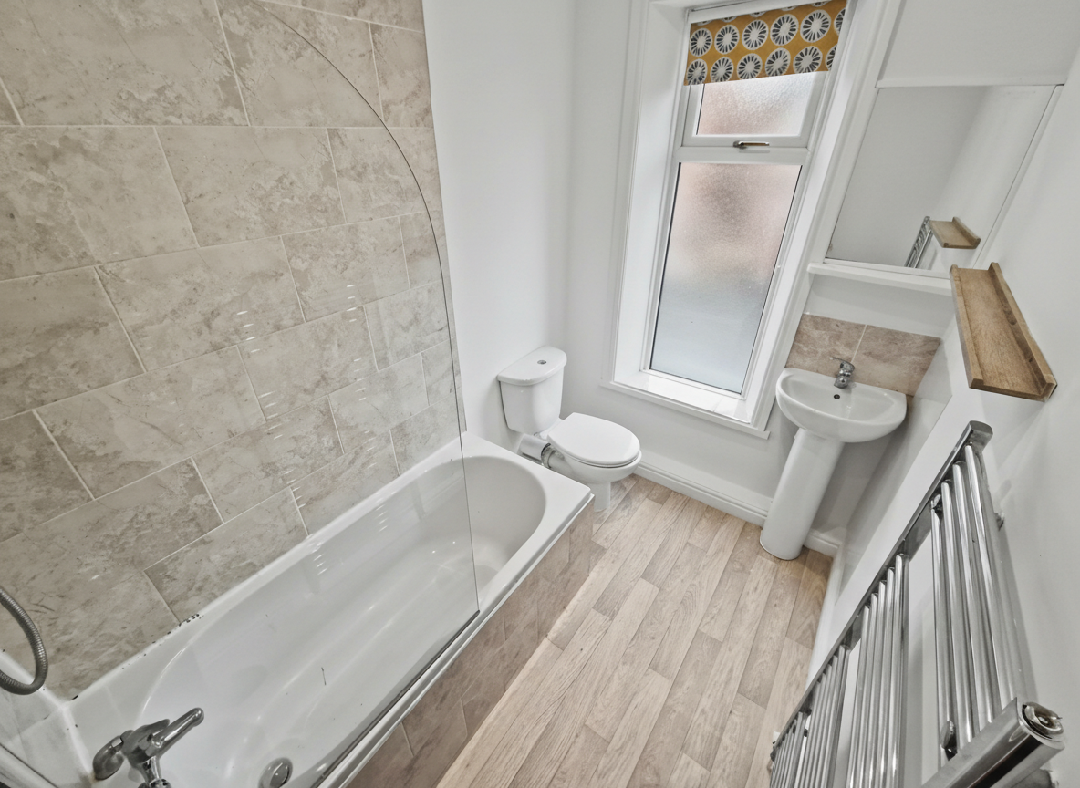 To the first floor, the landing provides access to three bedrooms and the family bathroom. Bedrooms two and three are both good-sized doubles overlooking the rear of the property, while the master bedroom is positioned to the front and offers generous space. The family bathroom, also located to the front, is fitted with a pedestal wash basin, WC, heated towel rail, and bath with power shower over.