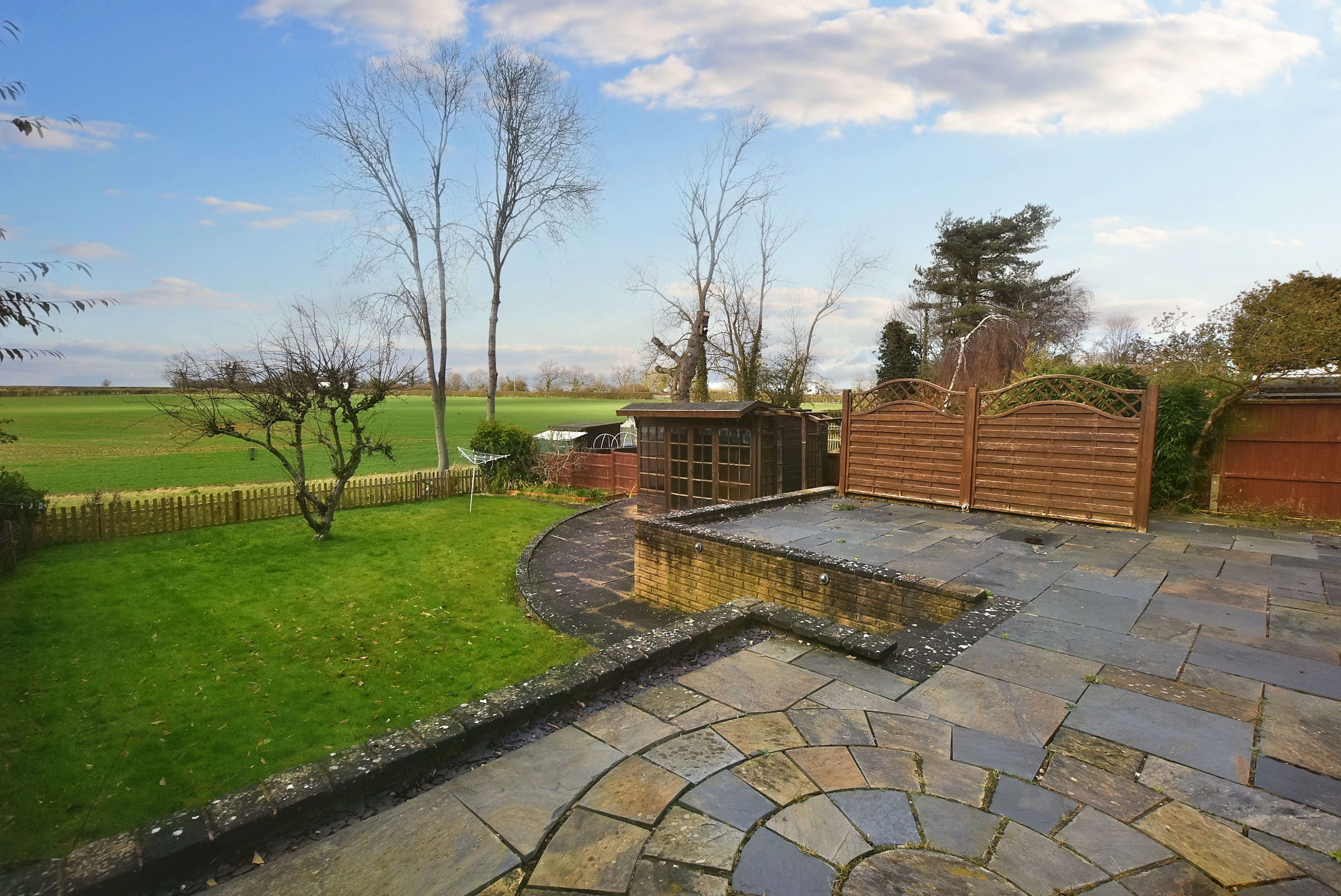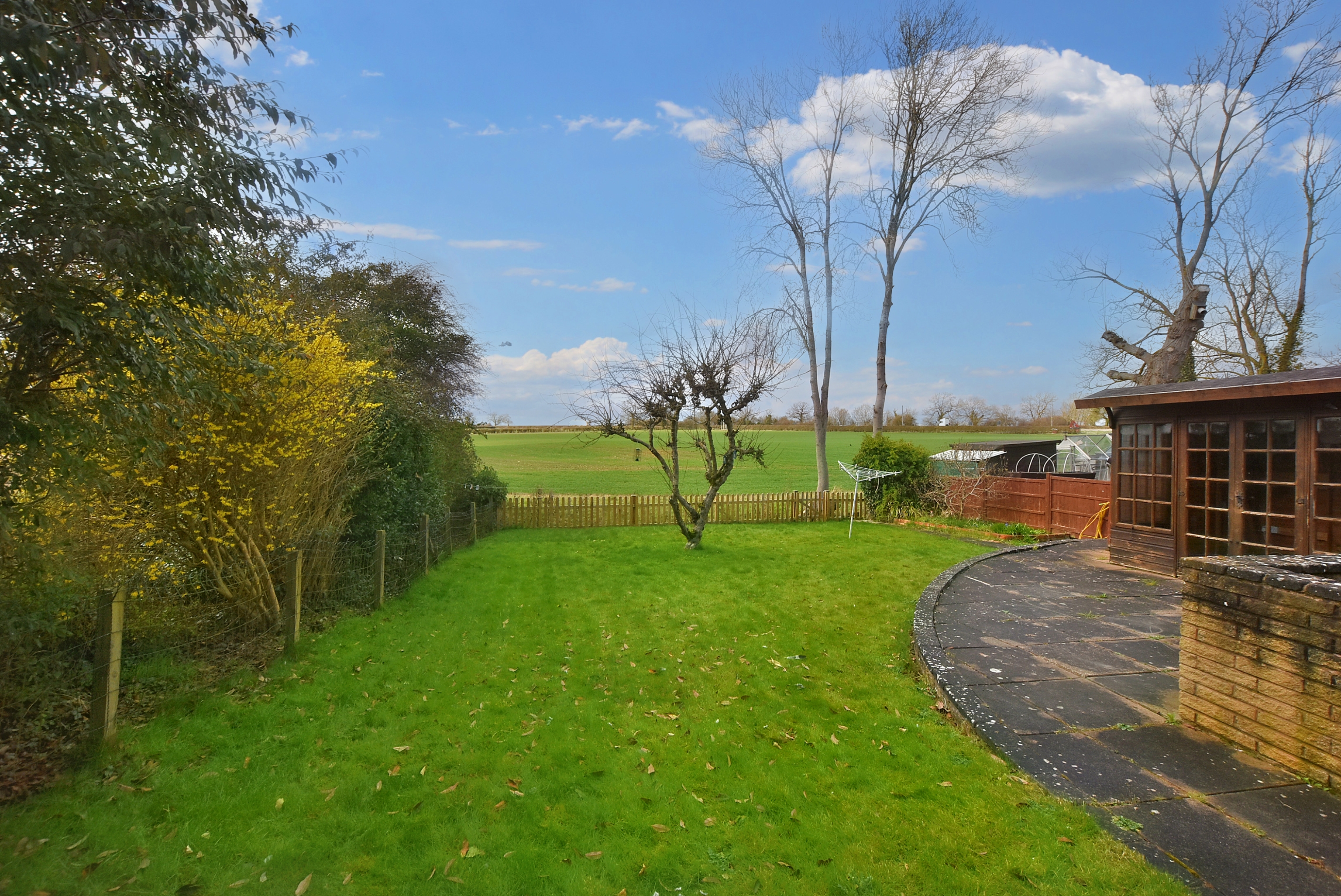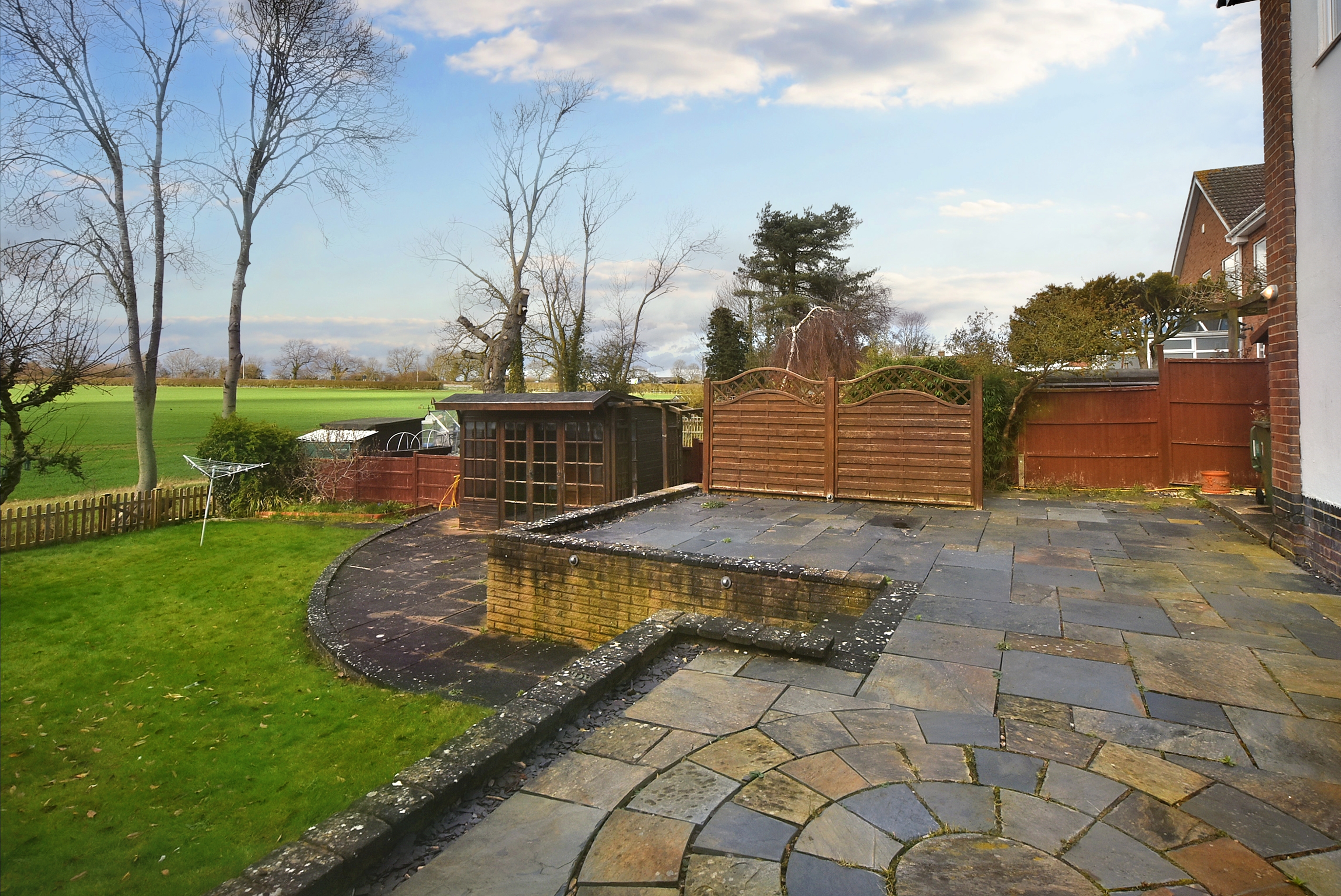 A large rear garden enjoying field views to the rear, with paved patio seating area, lawn, further paved area, fencing to perimeter, summer house with mains power, shed.