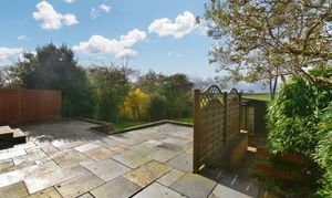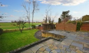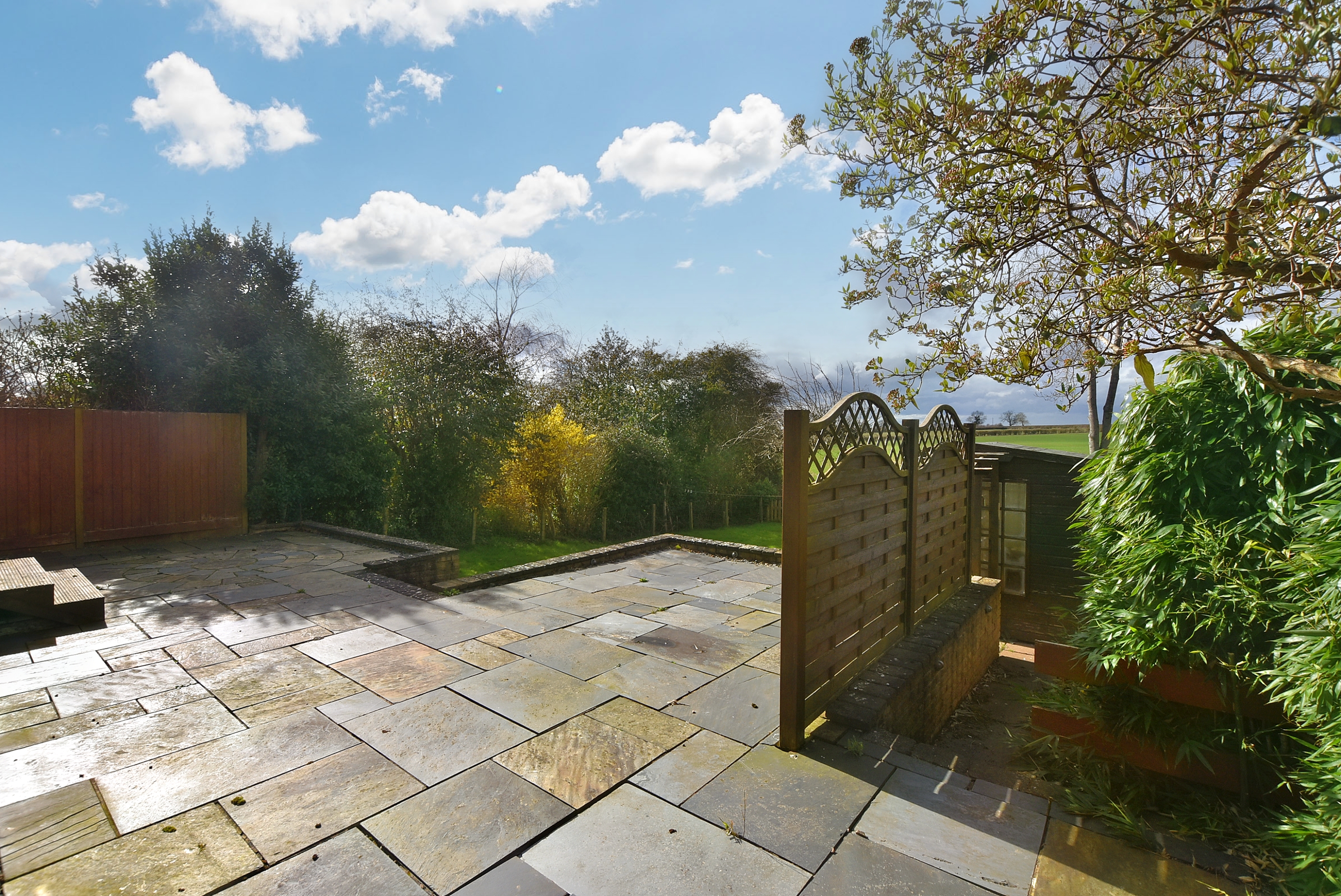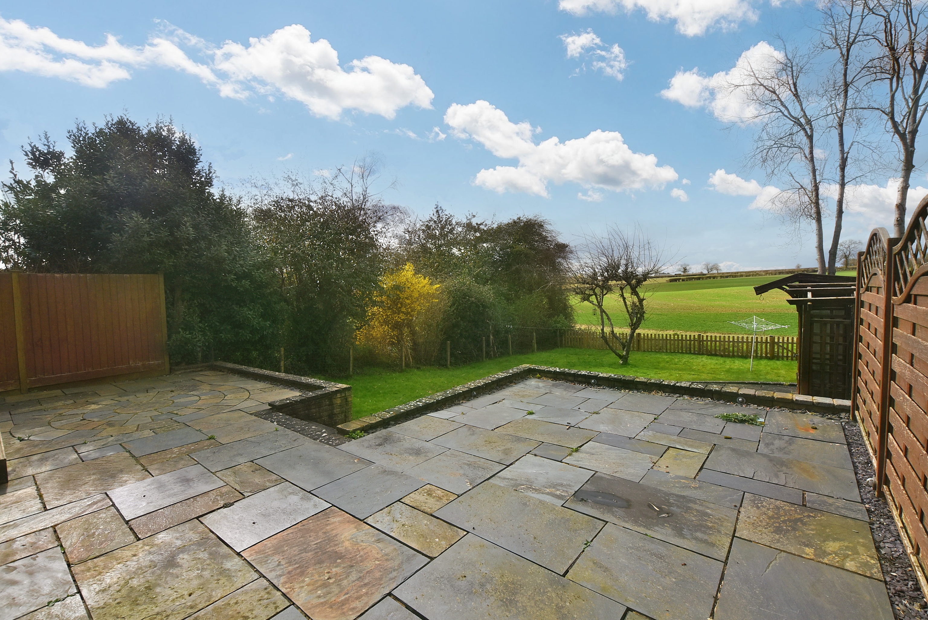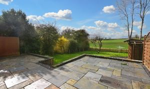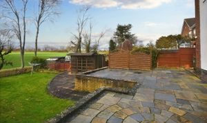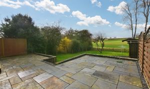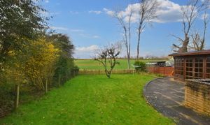 A large rear garden enjoying field views to the rear, with paved patio seating area, lawn, further paved area, fencing to perimeter, summer house with mains power, shed.