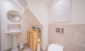 At the heart of this abode is a magnificent open-plan kitchen/dining and family room that is flooded with natural light, thanks to its well-positioned windows, and enhanced by a large central island and bi-fold doors that seamlessly connect to the rear garden. A separate living room offers a serene retreat, while a guest cloakroom adds practicality to the ground floor layout.