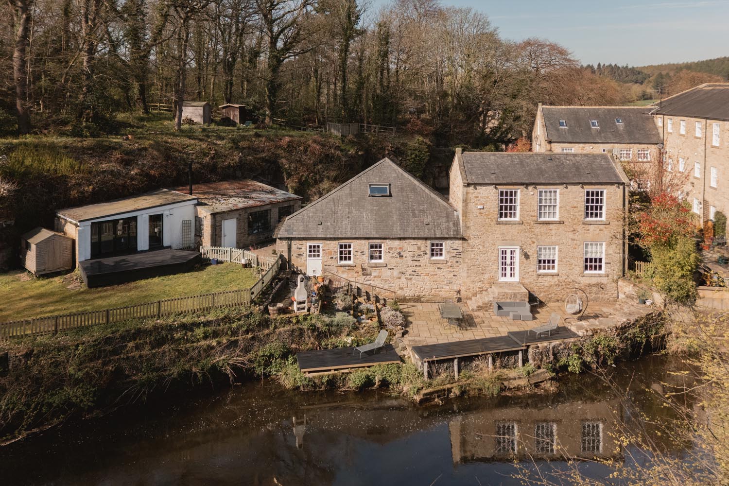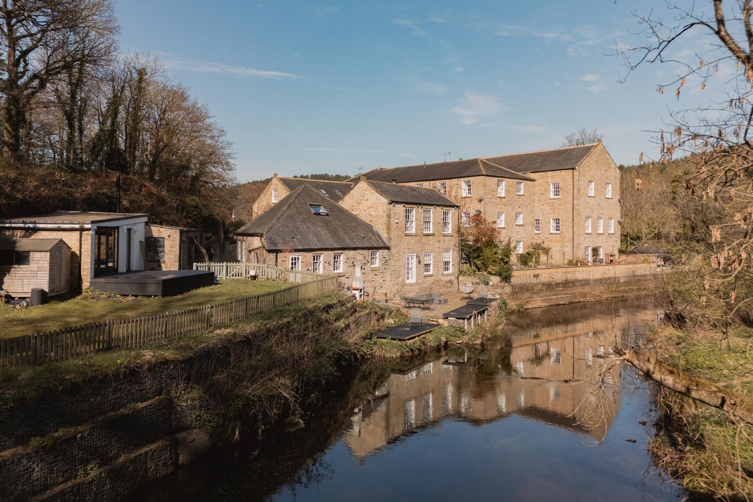 The Old Mill occupies a remarkable position along the banks of the River Derwent, where the setting feels shaped as much by the landscape as by the building itself. A Grade II Listed former paper mill, now adapted into a distinctive house where its industrial origins remain evident in the structure and layout.