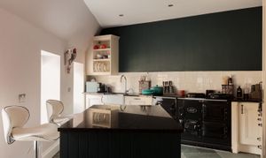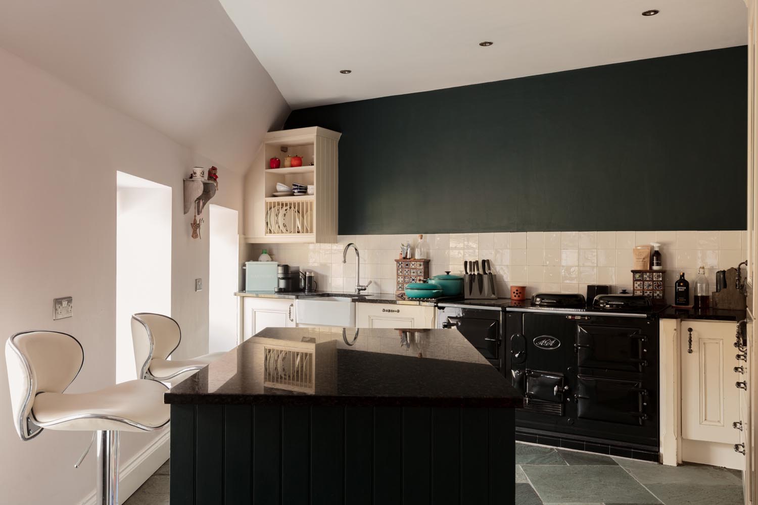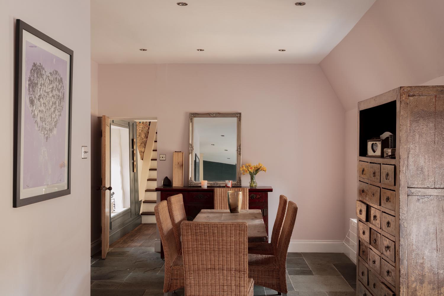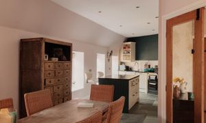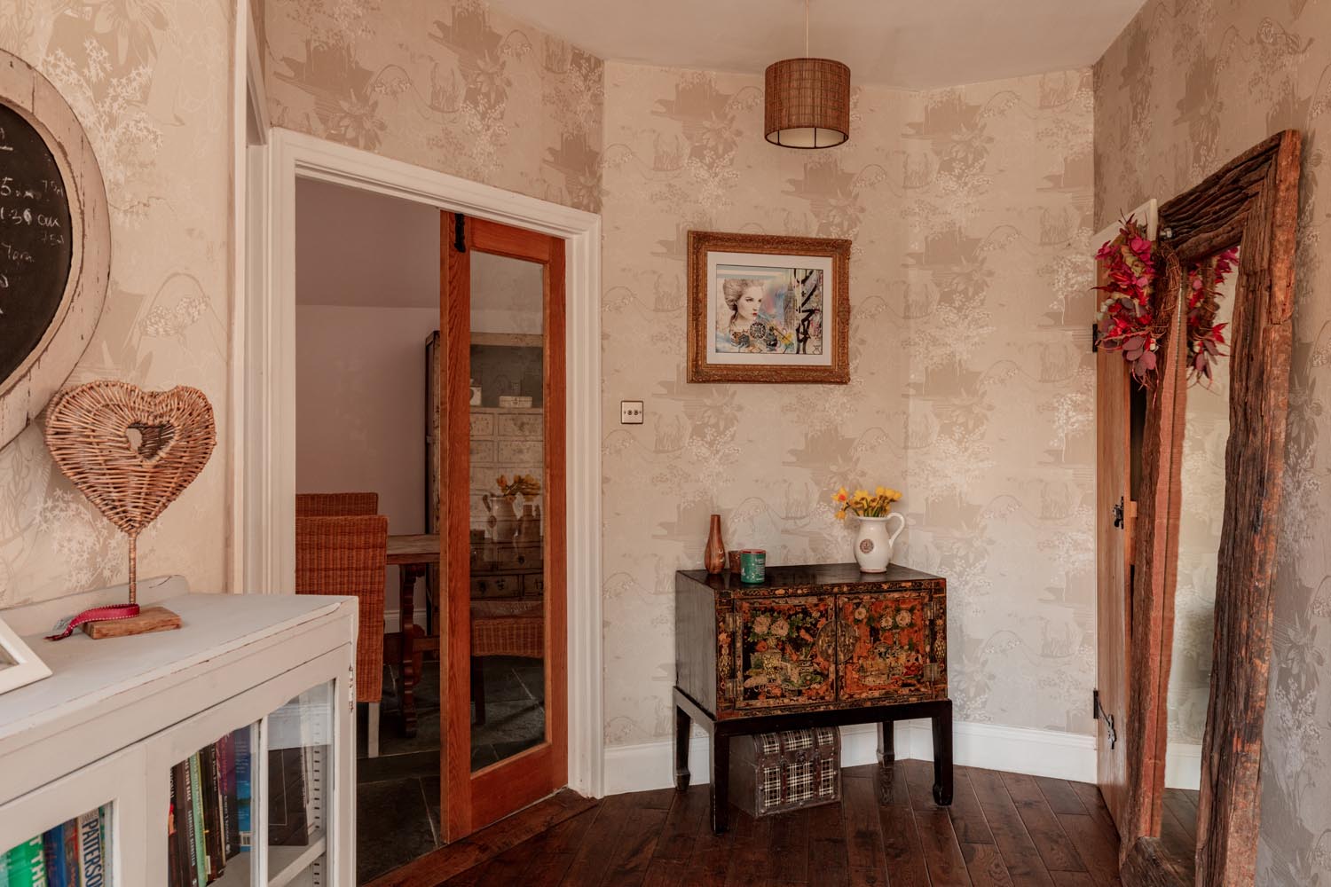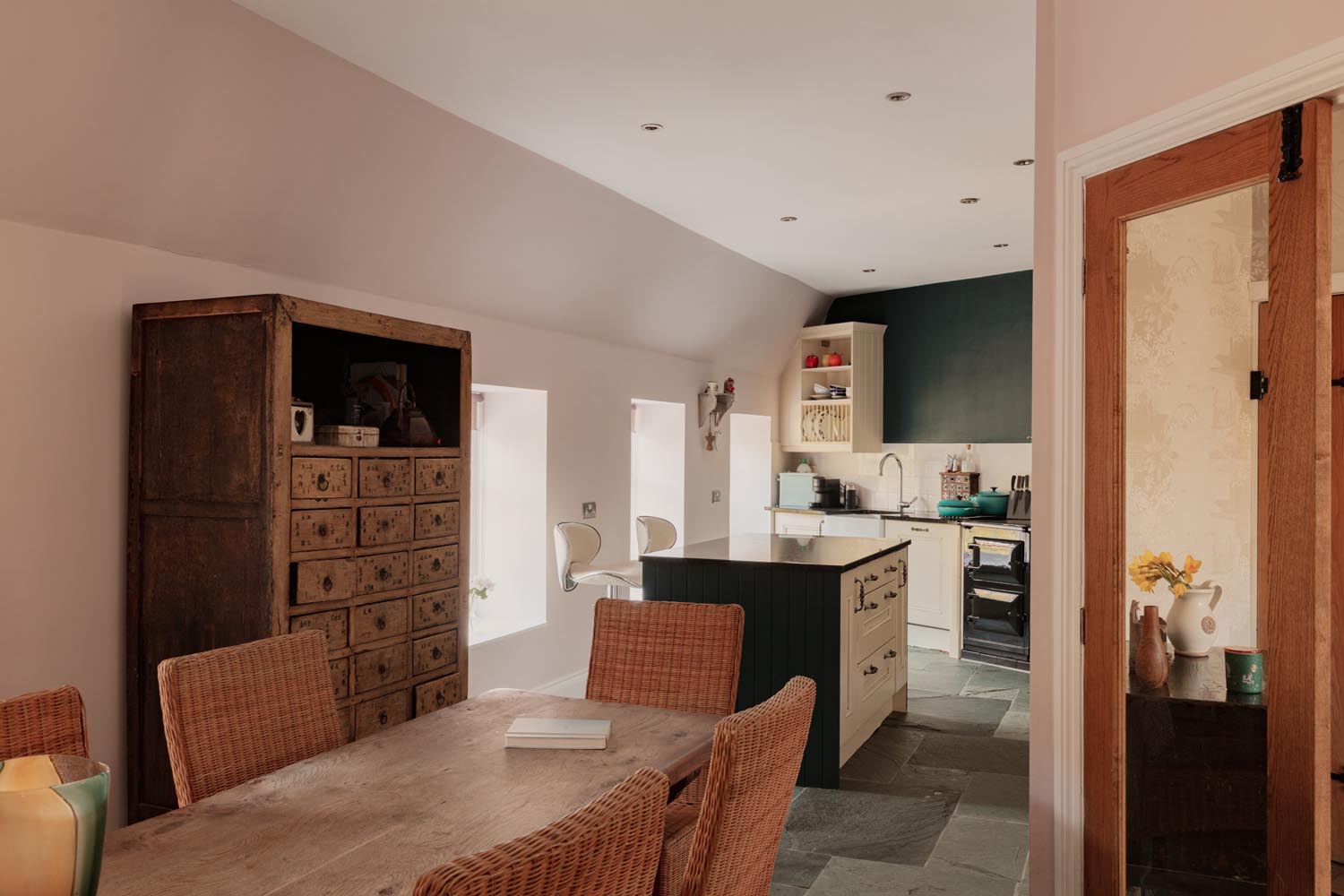 Upon entering the property, the entrance hall sits at the centre of the plan, linking the principal spaces in a way that feels both practical and intuitive. From here, the kitchen and dining room open out as a generous, sociable space, arranged around a central island with an Aga set into the main run of cabinetry. The proportions allow for a full dining arrangement, while doors connect directly to the terrace, extending the space naturally for entertaining and everyday use.
