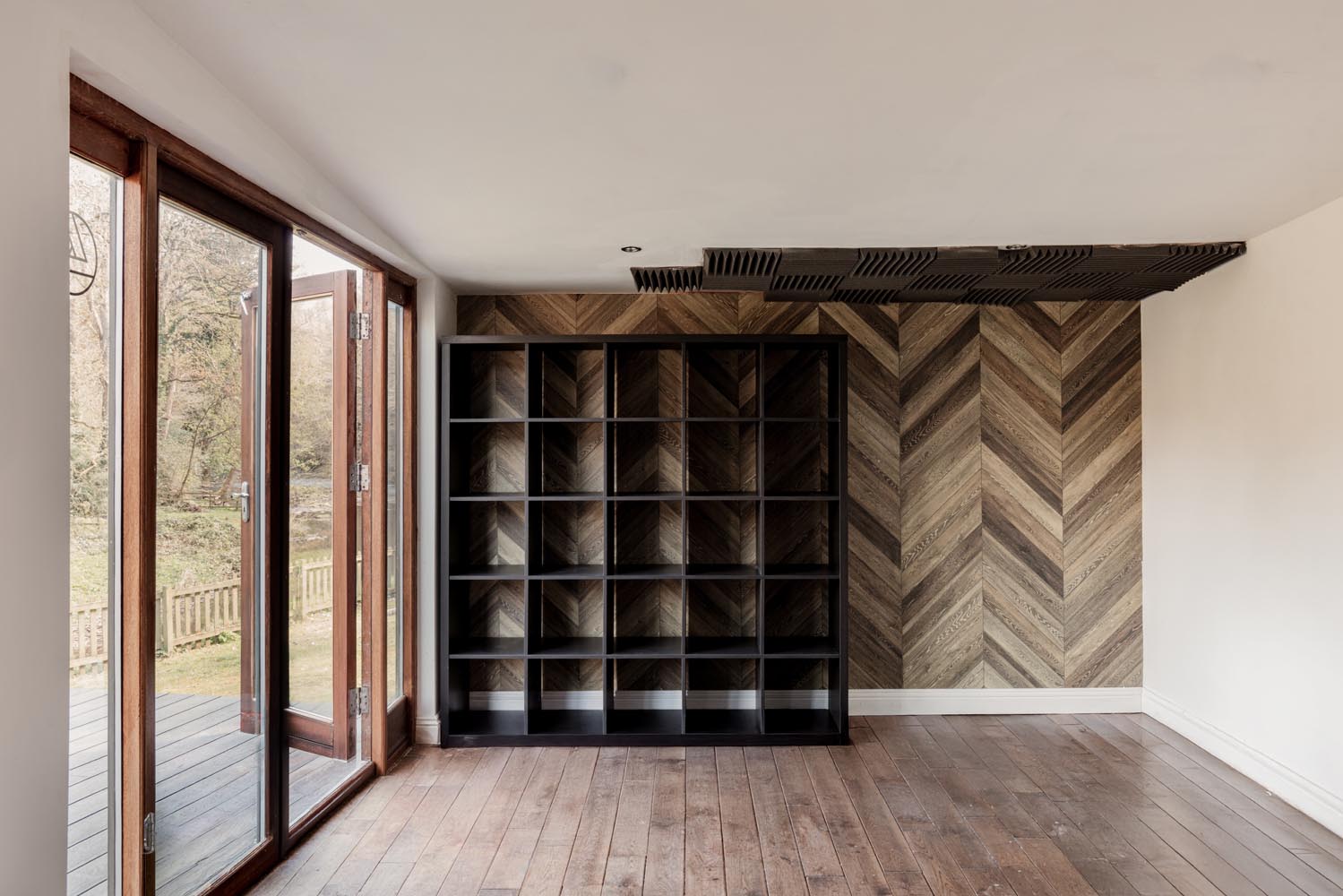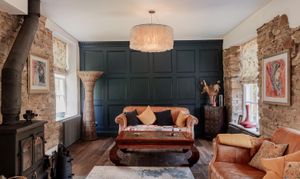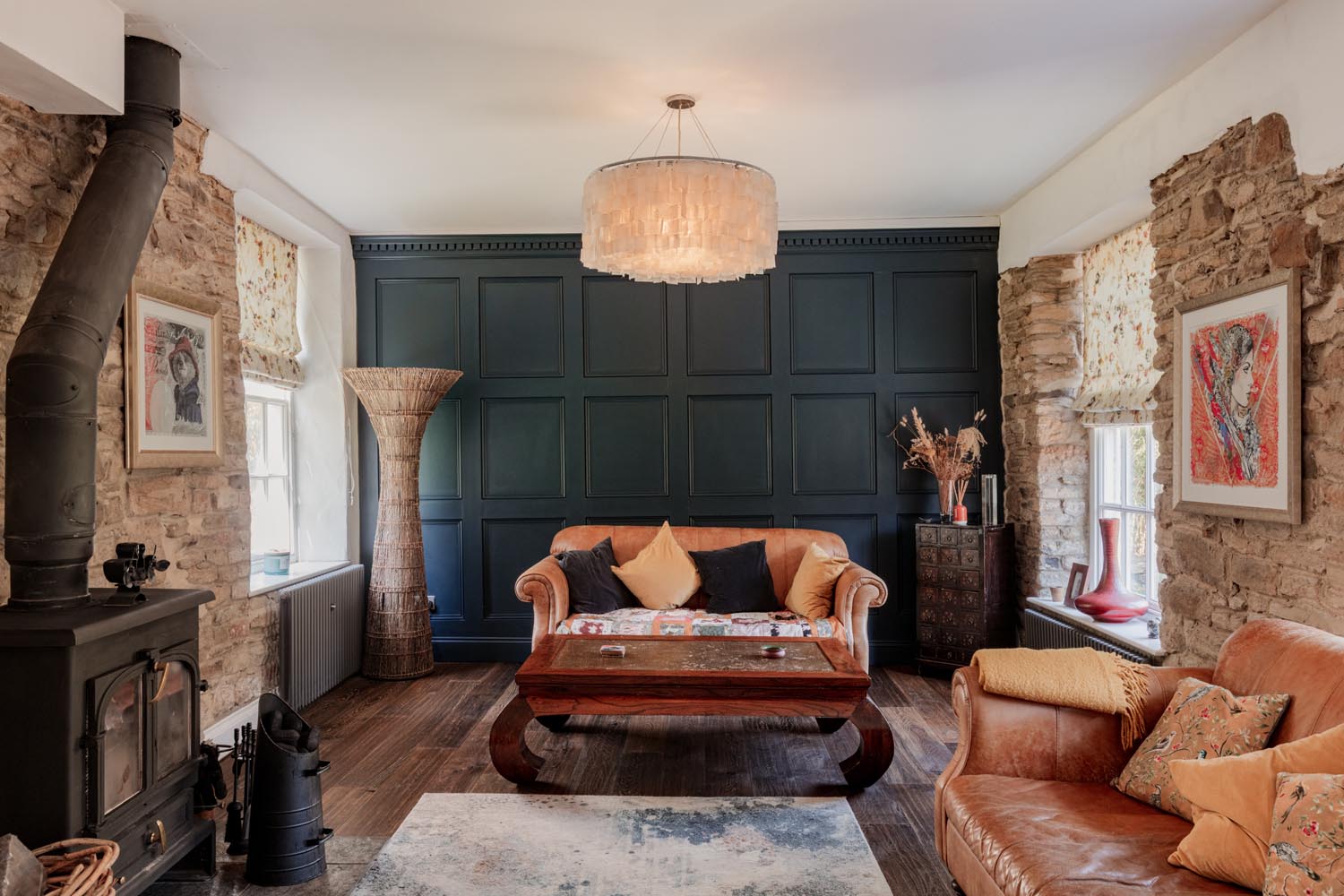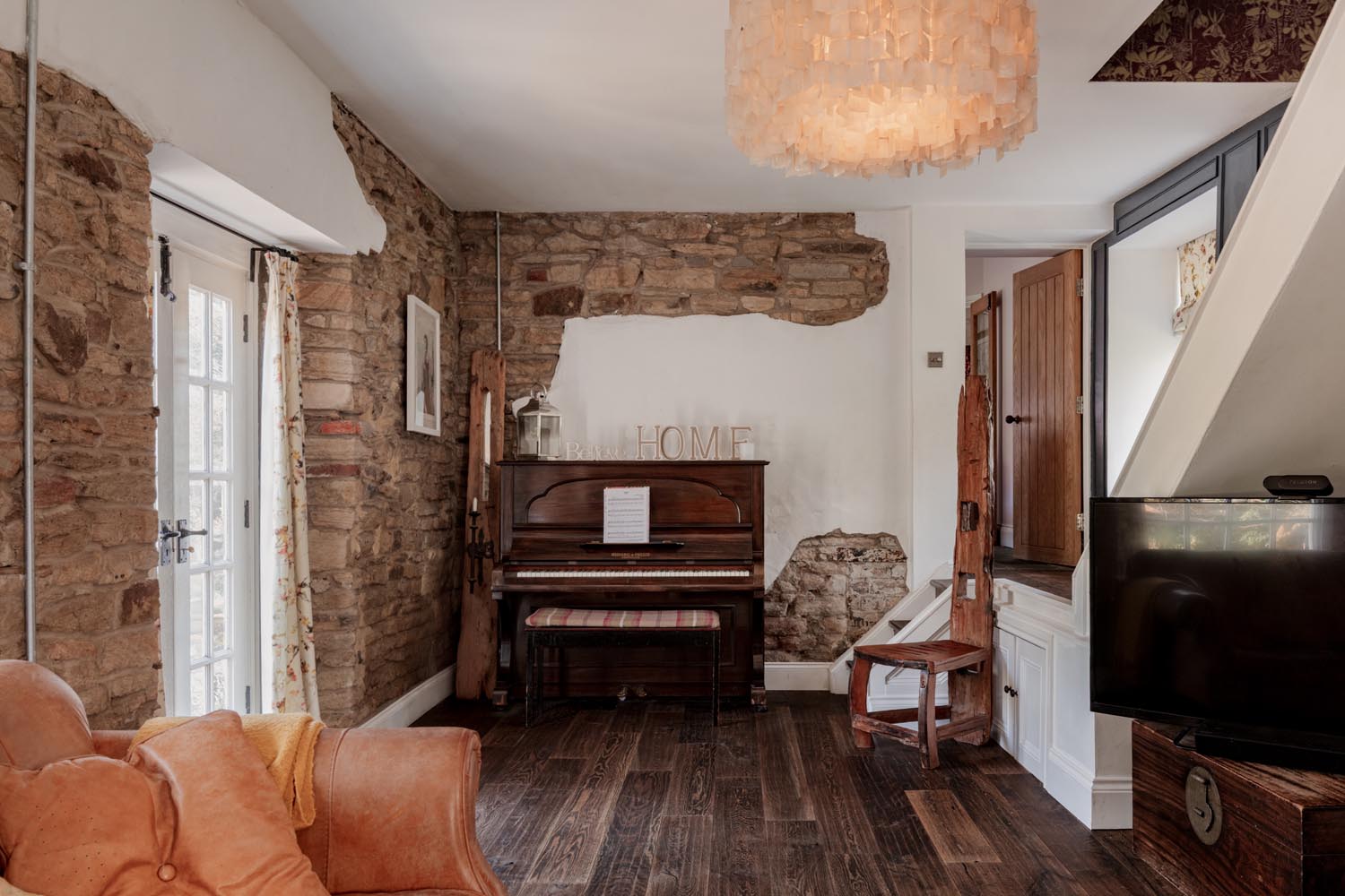 Positioned to one side, the living room is notably well-proportioned, with a dual aspect that draws in light throughout the day. A multi-fuel stove provides a focal point, while glazed doors open onto the terrace, reinforcing the connection to the riverside setting.