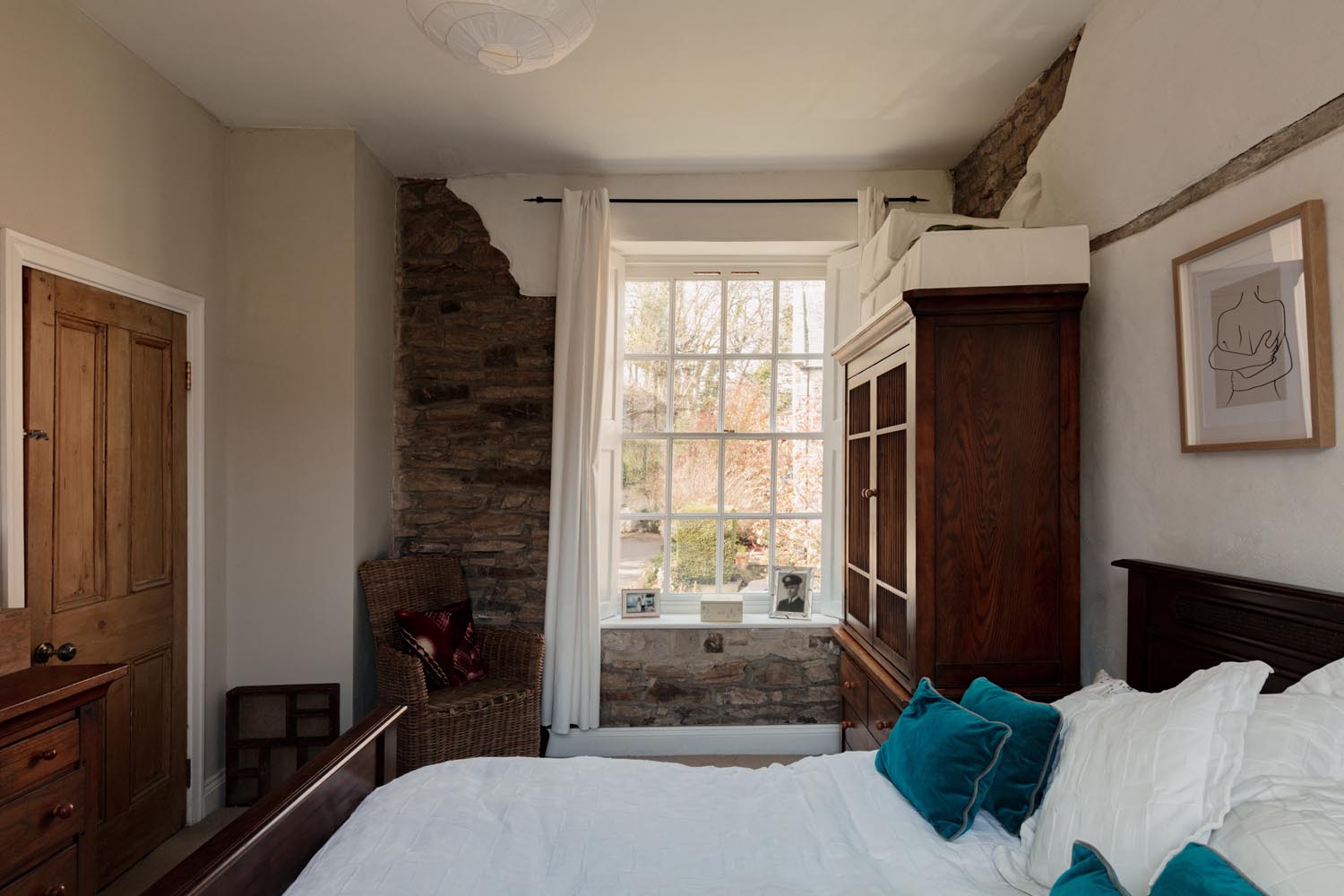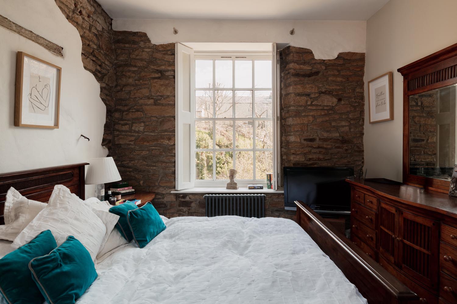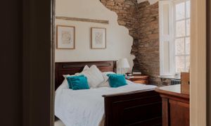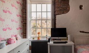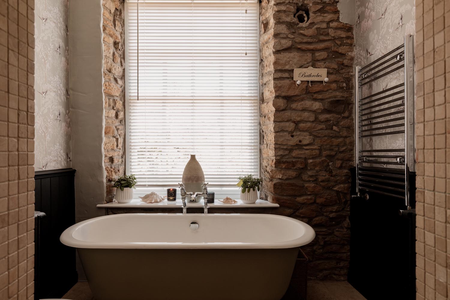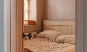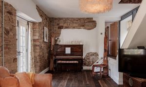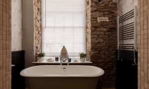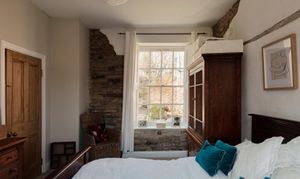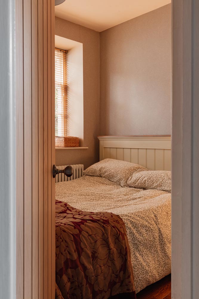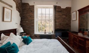 Upstairs, the accommodation is arranged in two distinct sections. From the main landing, two bedrooms are set side by side, one incorporating exposed brickwork and built-in storage. The bathroom is thoughtfully positioned between them, with a freestanding roll-top bath oriented to take in views towards the river.