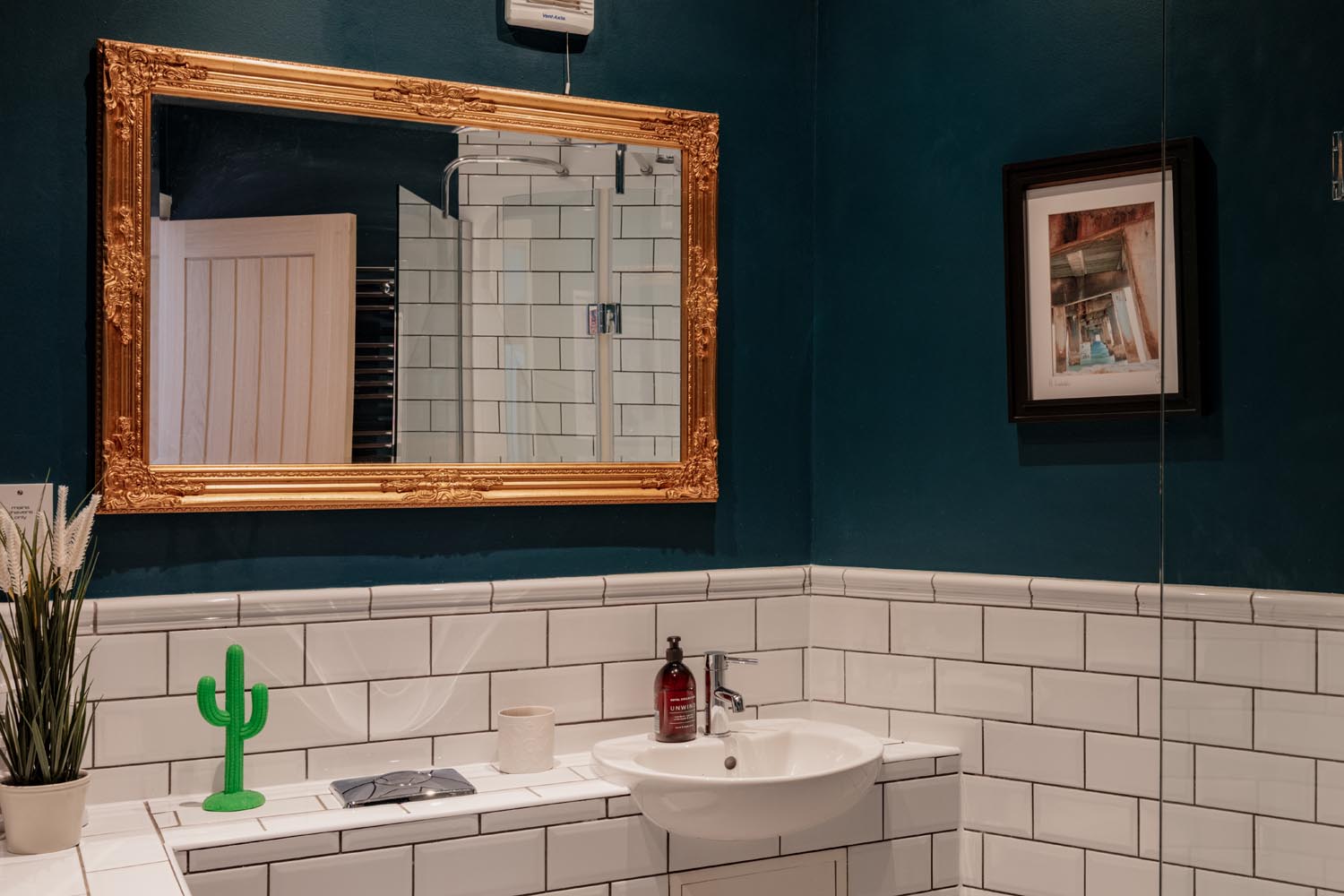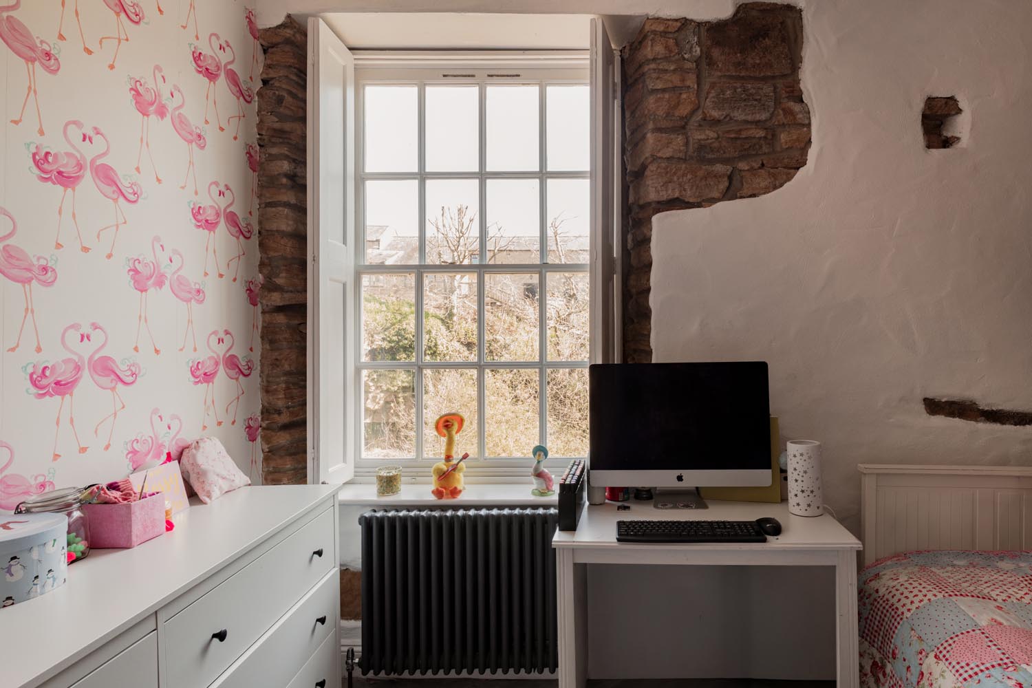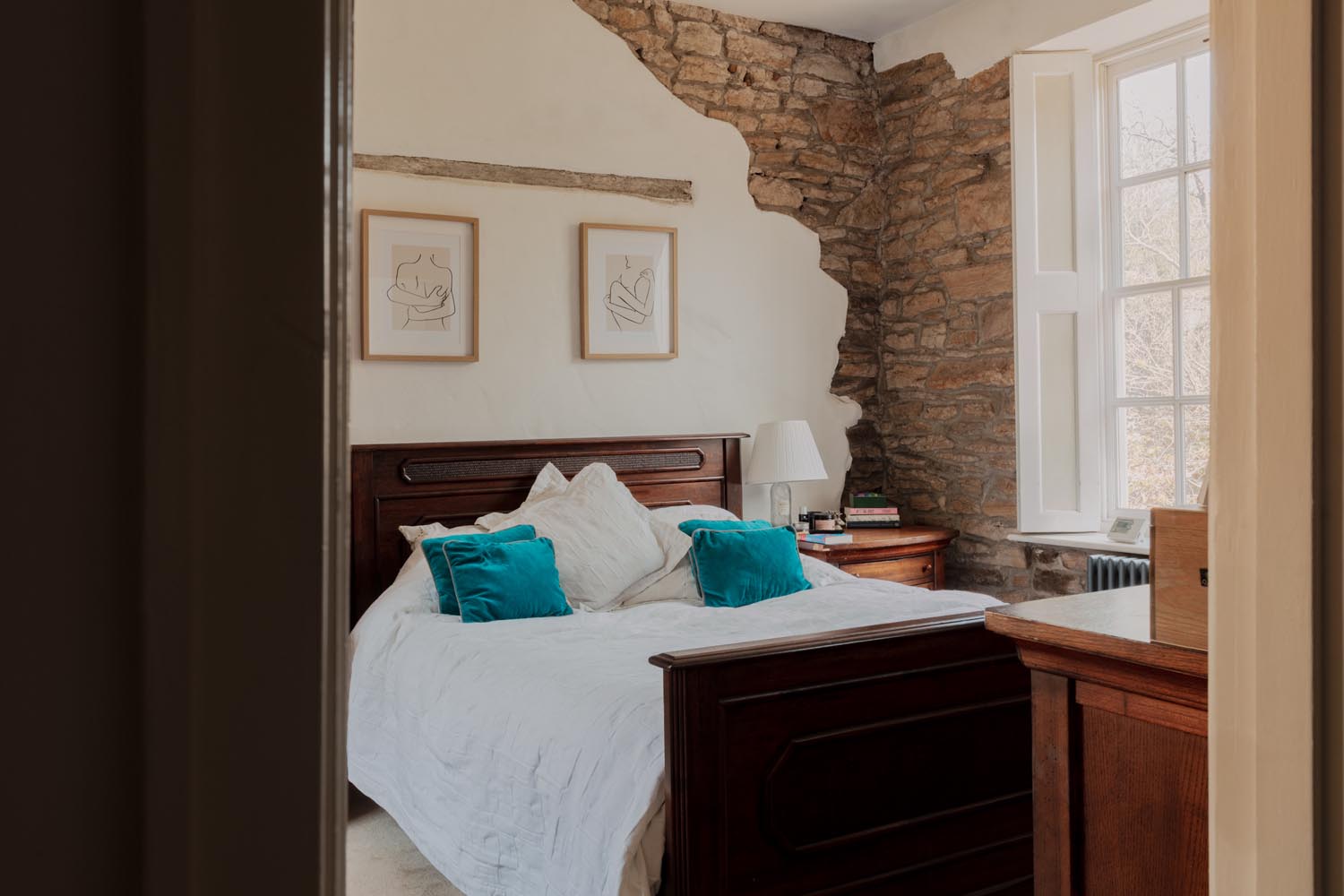 Upstairs, the accommodation is arranged in two distinct sections. From the main landing, two bedrooms are set side by side, one incorporating exposed brickwork and built-in storage. The bathroom is thoughtfully positioned between them, with a freestanding roll-top bath oriented to take in views towards the river.