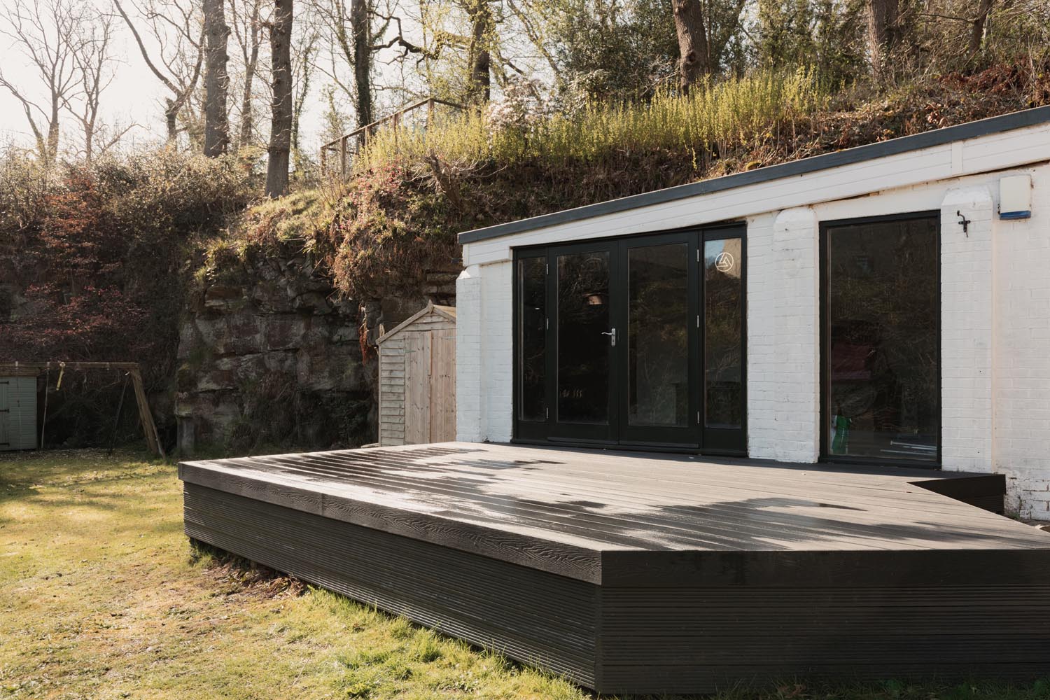 The grounds follow the line of the river, with a combination of lawn, terrace and decked seating areas arranged to make the most of the setting. A raised deck projects out towards the water, offering a particularly strong vantage point for dining or relaxing, while additional patio areas provide further space for entertaining. A detached studio sits within the garden, well suited to home working or creative use. To the front, a gated driveway provides parking for multiple vehicles and leads to a detached double garage, with EV charging in place.