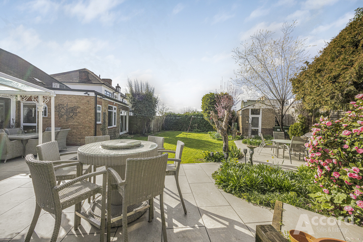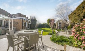 Outside, the front provides generous off-street parking for up to five cars as well as access to the garage. The rear garden is a real feature of the property, with a large patio, lawn and mature borders, giving you plenty of room to relax or entertain. There is also a further garage access at the rear via a shared driveway and a shed, adding even more parking and useful storage or workspace.