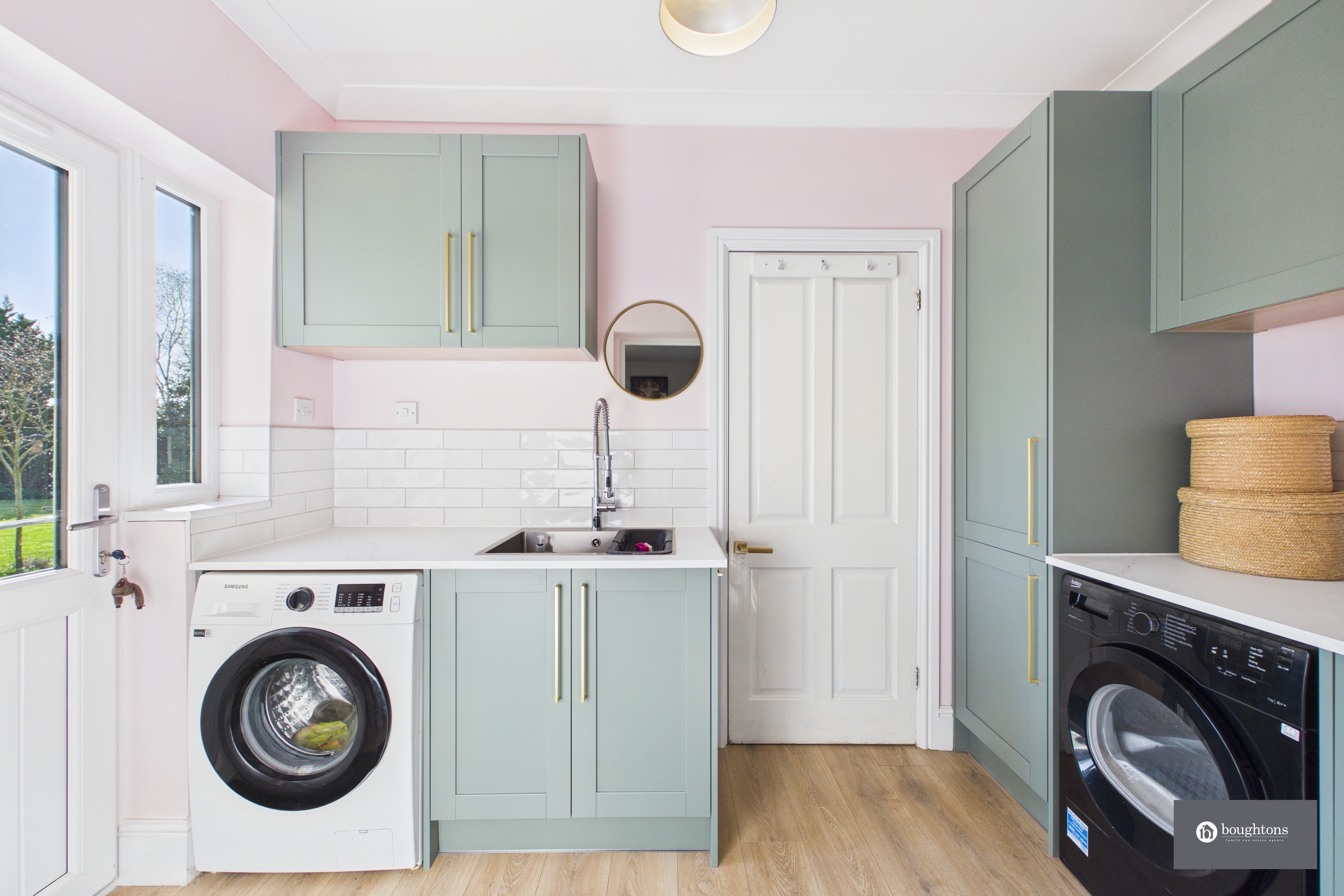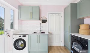 A separate utility room continues the same high standard of finish, with matching cabinetry, tiled splashbacks, an additional sink, space for appliances and coordinating gold finishes. There is also an additional integrated freezer. A further door provides convenient access to the garden.