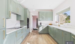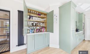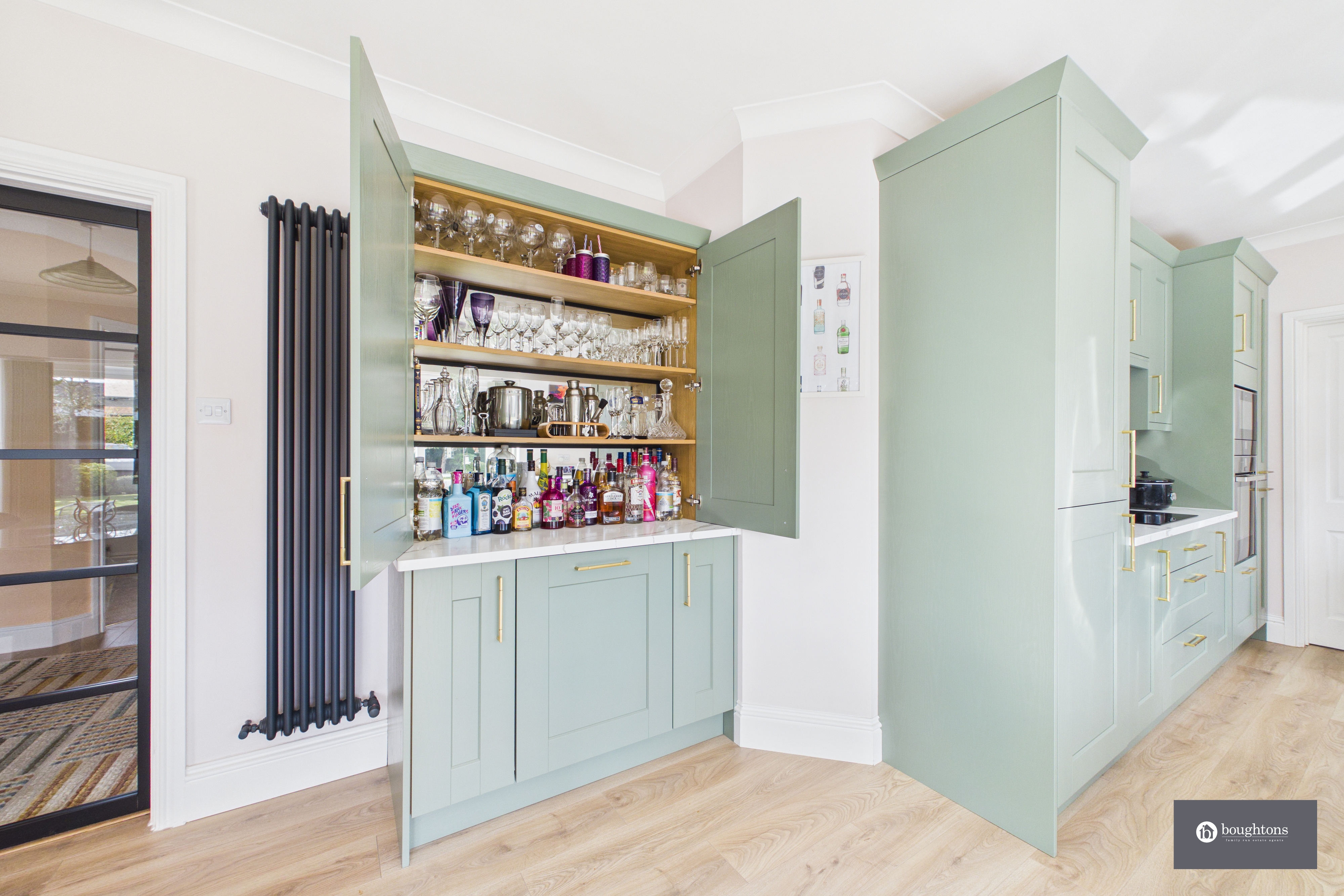 The dining area flows effortlessly into the beautifully designed kitchen, where elegant cabinetry is finished with striking gold handles and detailing, perfectly complemented by white worktops. A breakfast bar overlooks the garden and offers a lovely place for casual dining or morning coffee. The kitchen also benefits from a stylish drinks cabinet/cocktail bar, along with an integrated fridge freezer, hob, raised oven, microwave and additional fridge under the cocktail bar.