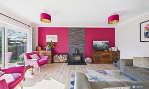 The living area is warm and inviting, centred around a charming log burner and complemented by sleek vertical radiators. There is plenty of room for both generous living and dining furniture, creating a wonderfully sociable space. Large sliding doors allow natural light to pour into the room while providing seamless access to the rear garden.