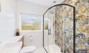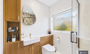 The bungalow offers three generously sized double bedrooms, each beautifully presented. The principal bedroom is a particularly impressive retreat, featuring generous built-in wardrobes, a walk-in wardrobe and a remarkable en-suite. This luxurious space has been exquisitely designed and includes a striking curved black glass shower panel with matching handle, a gold rain shower with handheld attachment, a feature wall, bespoke cabinetry with built-in vanity and storage, W.C. and sink.