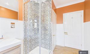 The modern family bathroom is equally elegant, finished with a beautiful combination of decorative tiling and contrasting paintwork. It comprises a bathtub, separate shower cubicle, heated towel rail, W.C. and a sink with built-in vanity storage.