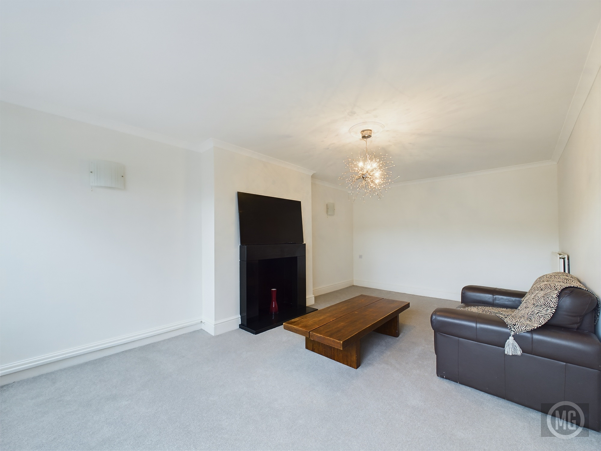 Carpet flooring, decorative fireplace, window with front aspect, radiator, wall lights