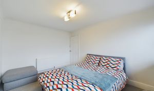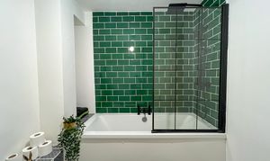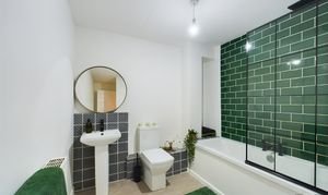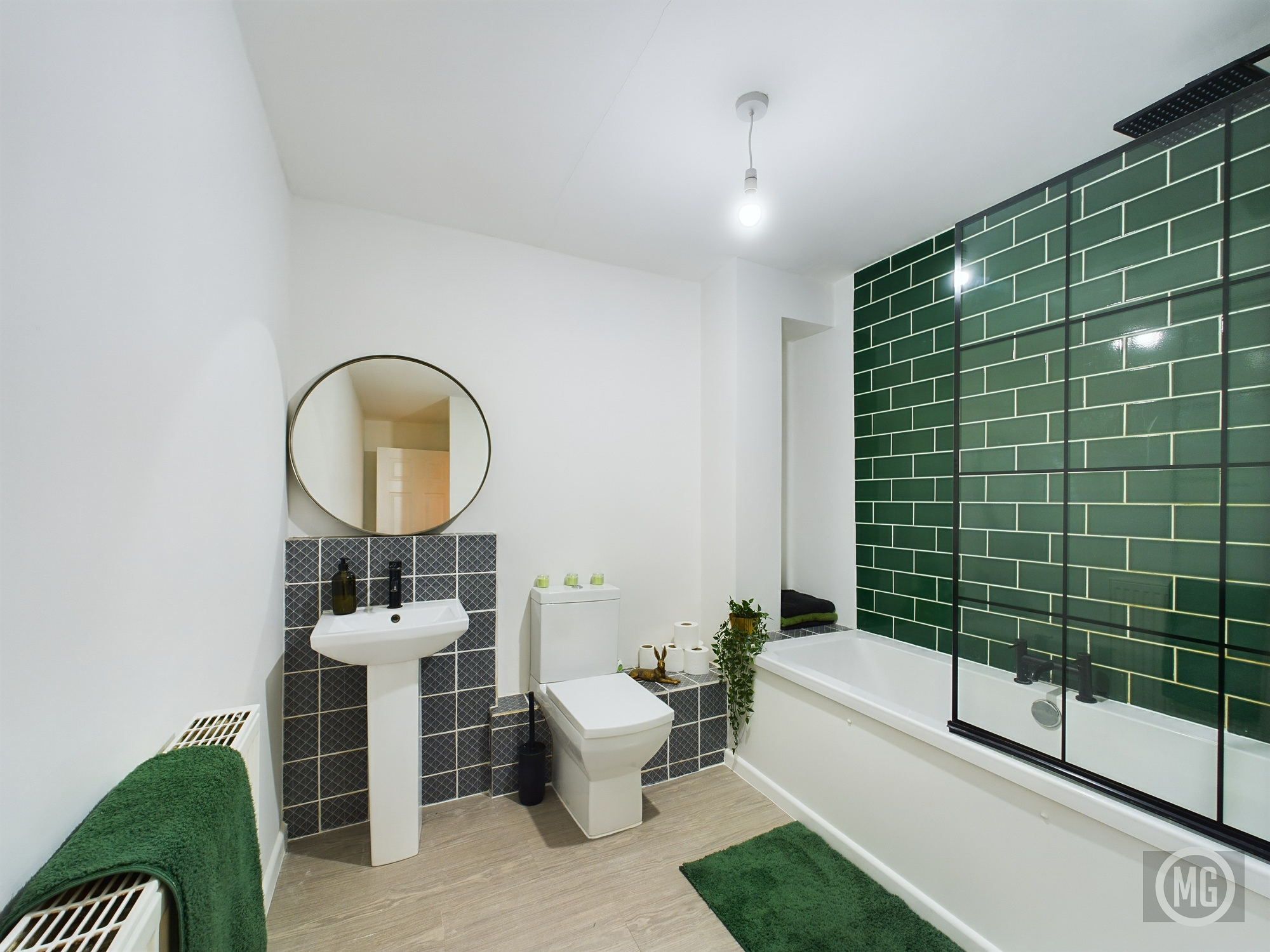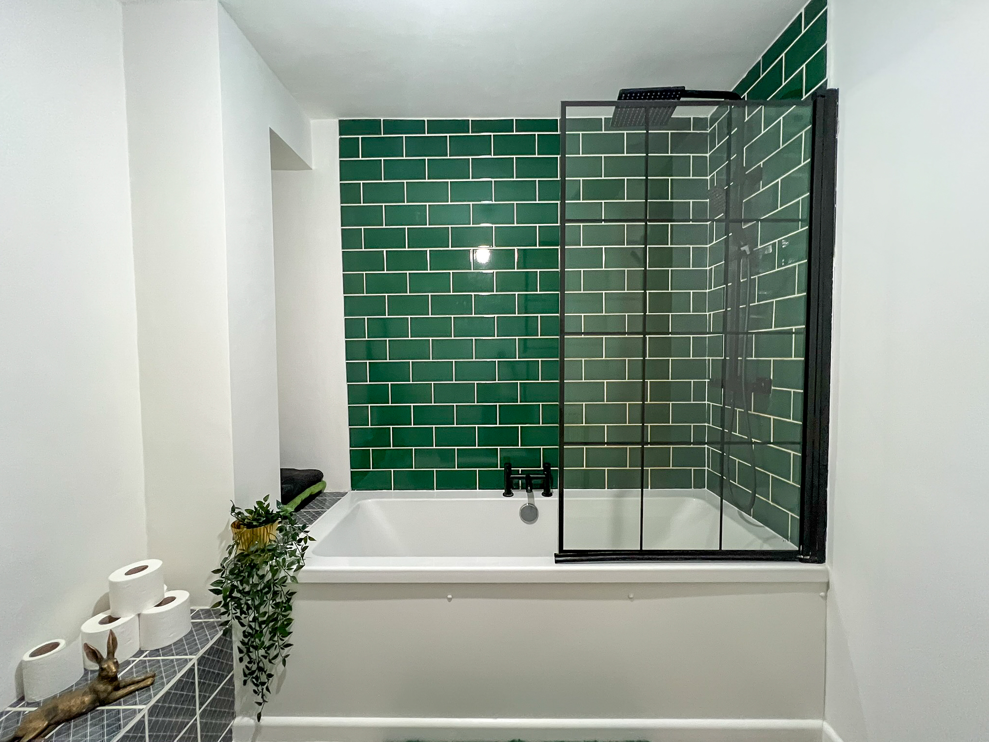 The newly fitted bathroom is a standout feature, with its striking tile surround, shower-over-bath setup, and contemporary style. It’s perfect for easing morning routines or unwinding with an evening soak.