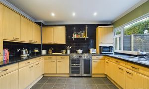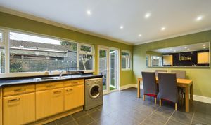 Tiled flooring, range of wall and base units, space for Range cooker, space for fridge/freezer, plumbing for washing machine, radiator, window with rear aspect, French doors leading into garden.