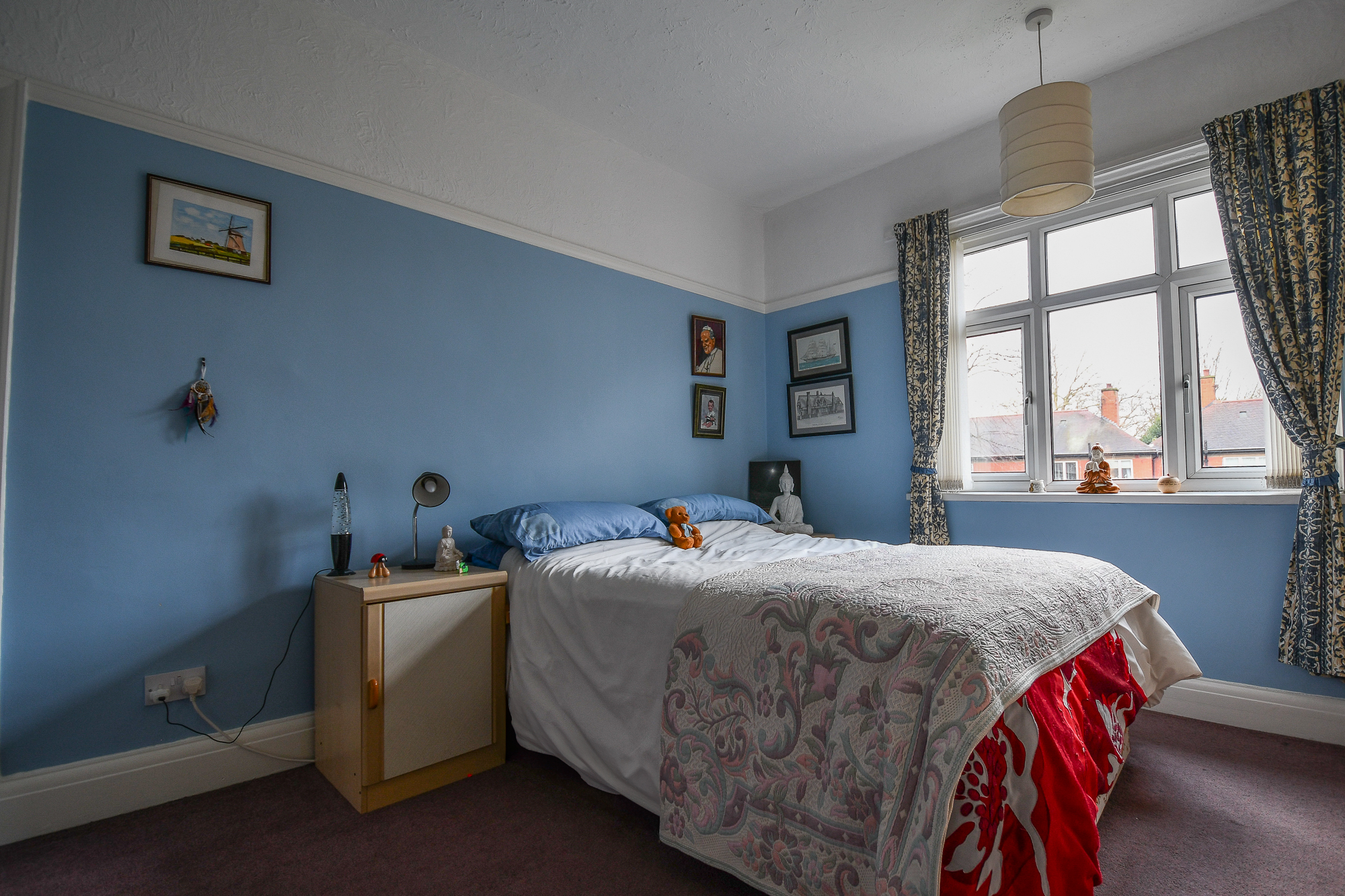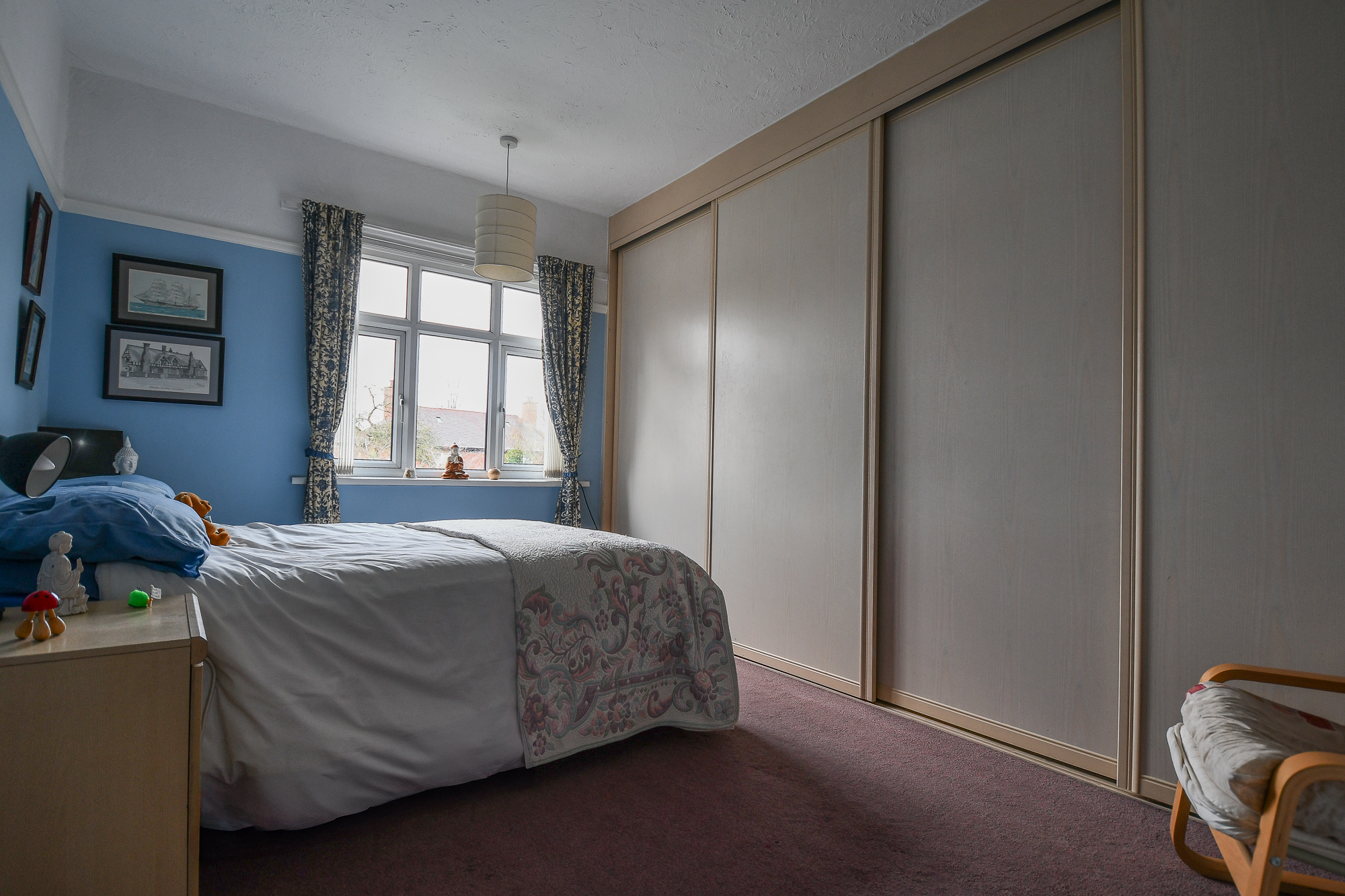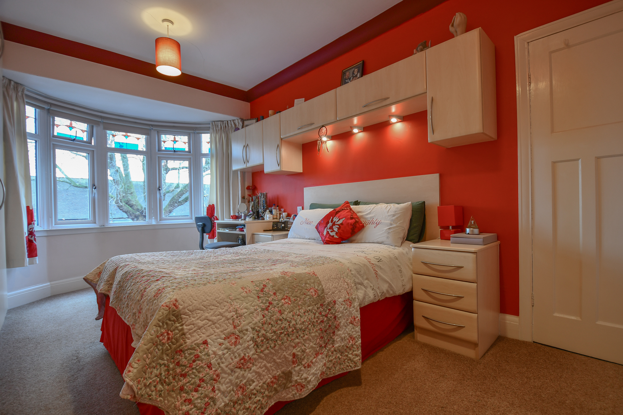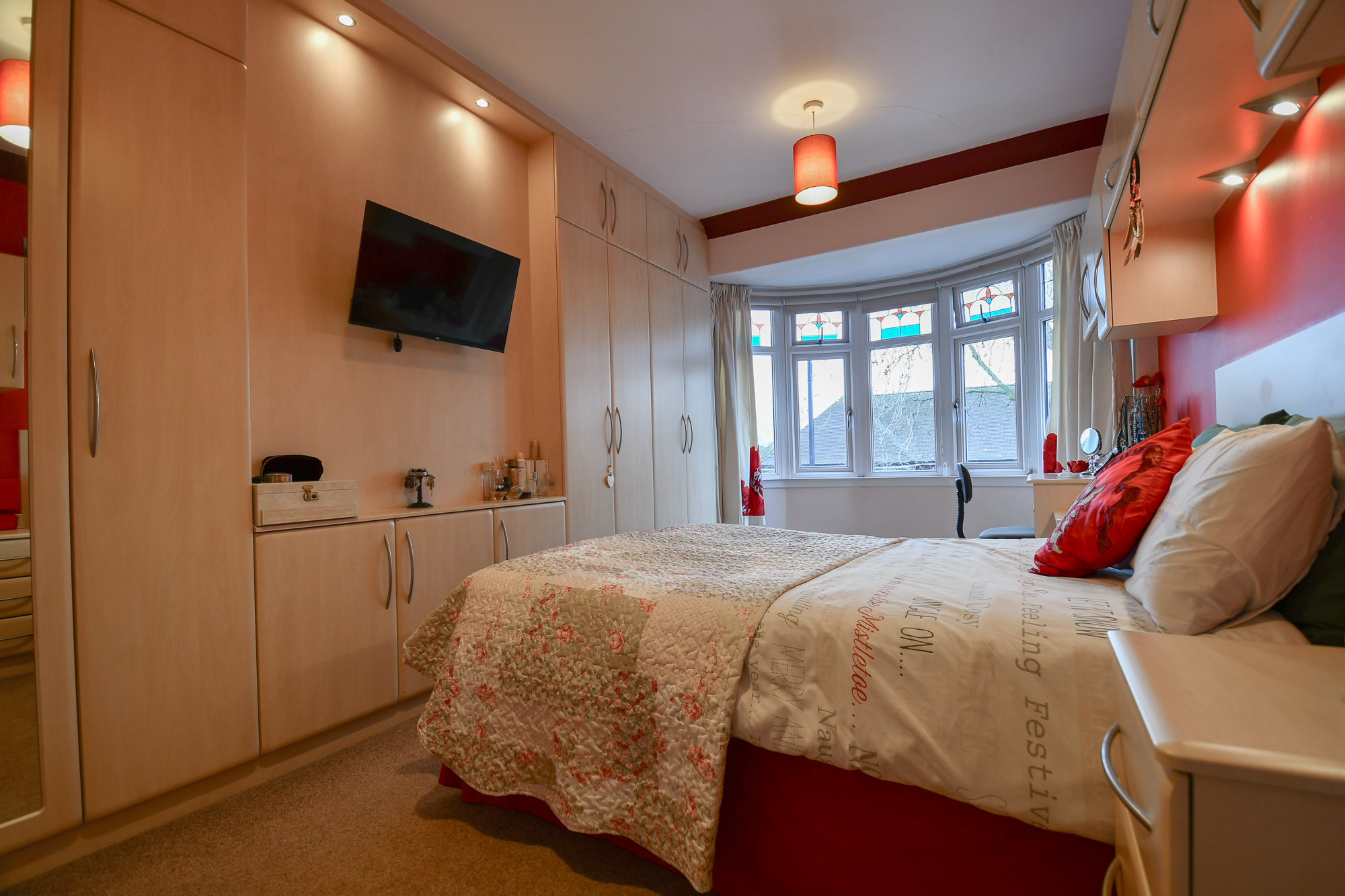 The master bedroom is a spacious double room featuring a charming bay window that allows plenty of natural light. Finished with carpeted flooring, the room also benefits from fitted wardrobes with a matching bed surround, spotlights within the surround, and two pendant lights.