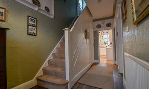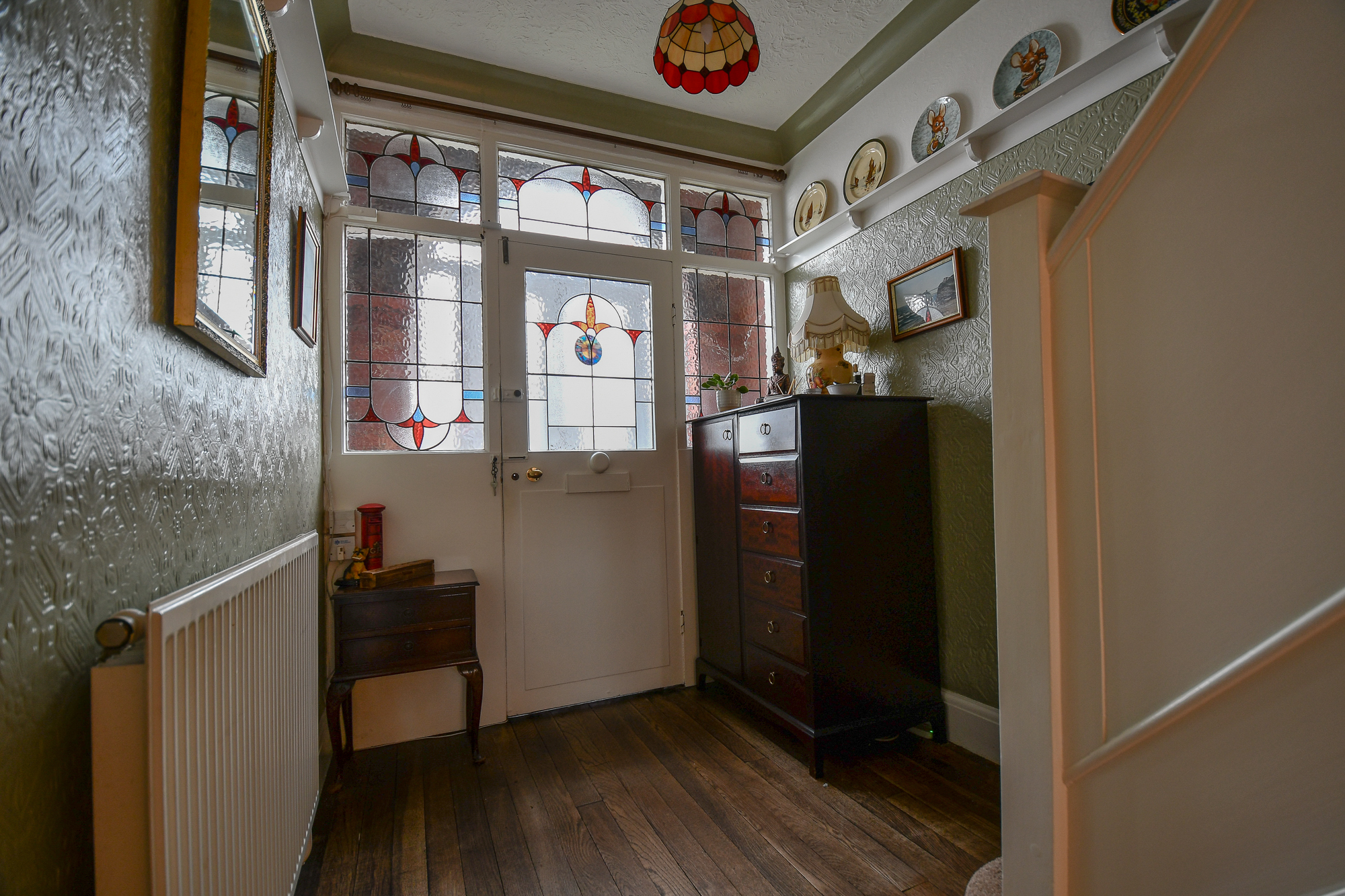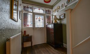 The entrance hall offers a welcoming first impression, featuring solid wood flooring and charming original features and coving throughout. The stained-glass front door and porchway add character, while under-stairs storage provides practicality and also gives access down to the cellar.
