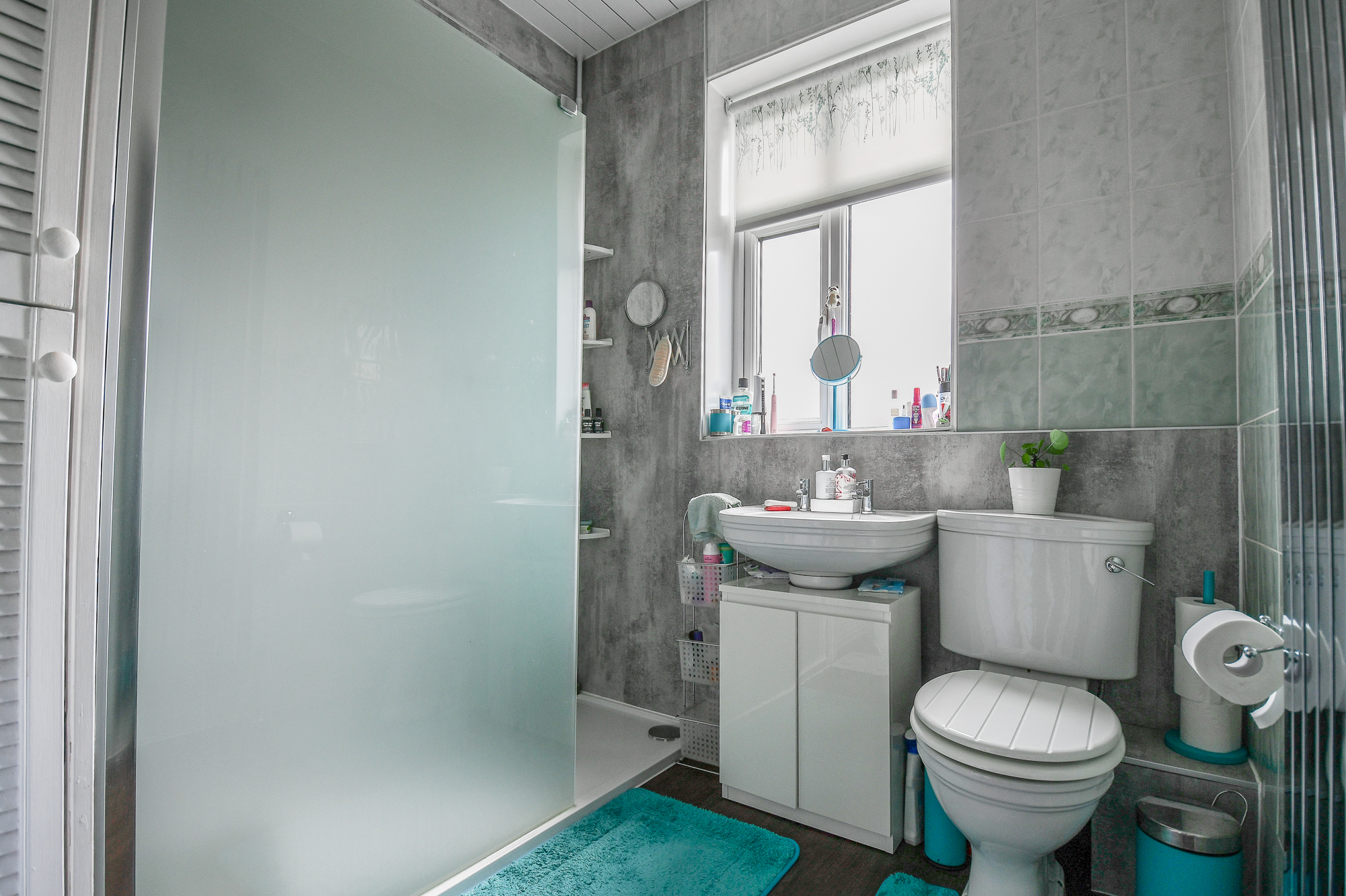 A well-presented bathroom featuring a walk-in shower, WC and sink, with a frosted window for privacy and natural light. There is also a useful airing cupboard which houses the boiler and provides extra storage.