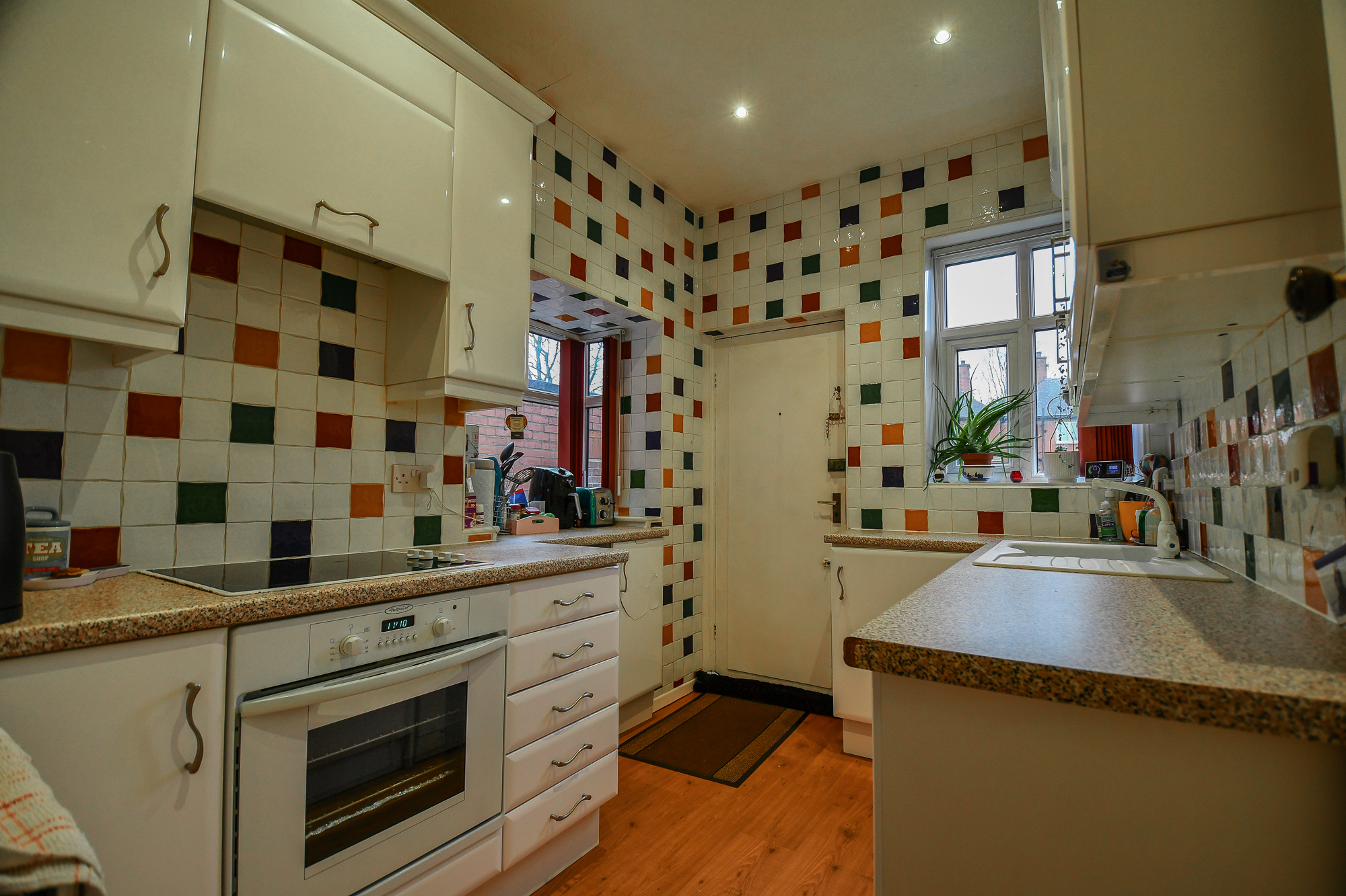 The kitchen is fitted with a range of white wall and base units, complemented by tiled walls and flooring for a practical finish. There is an integral electric oven and hob with extractor fan, a sink unit, and two windows allowing plenty of natural light. Finished with spotlights, the space feels bright and functional for everyday use.