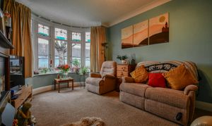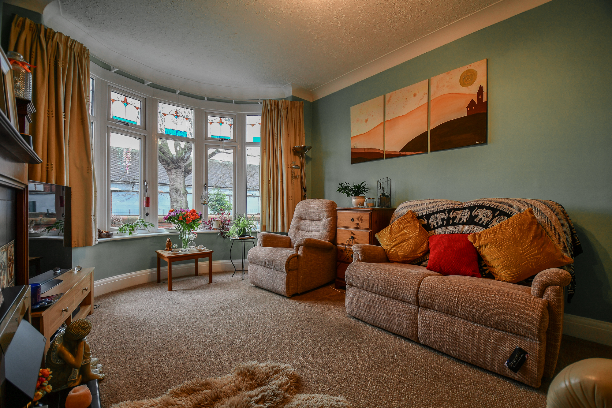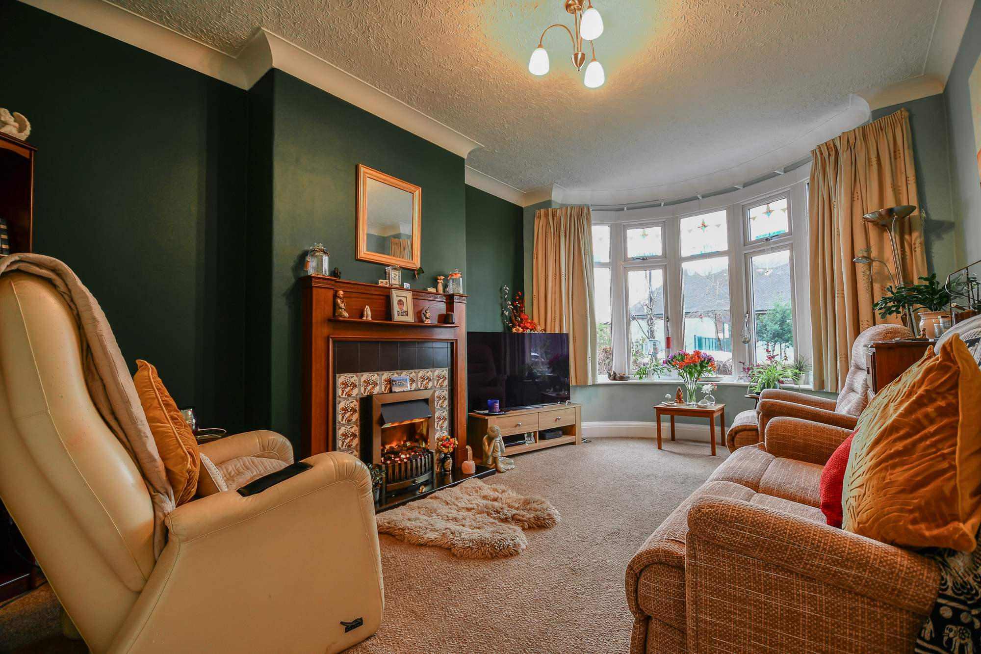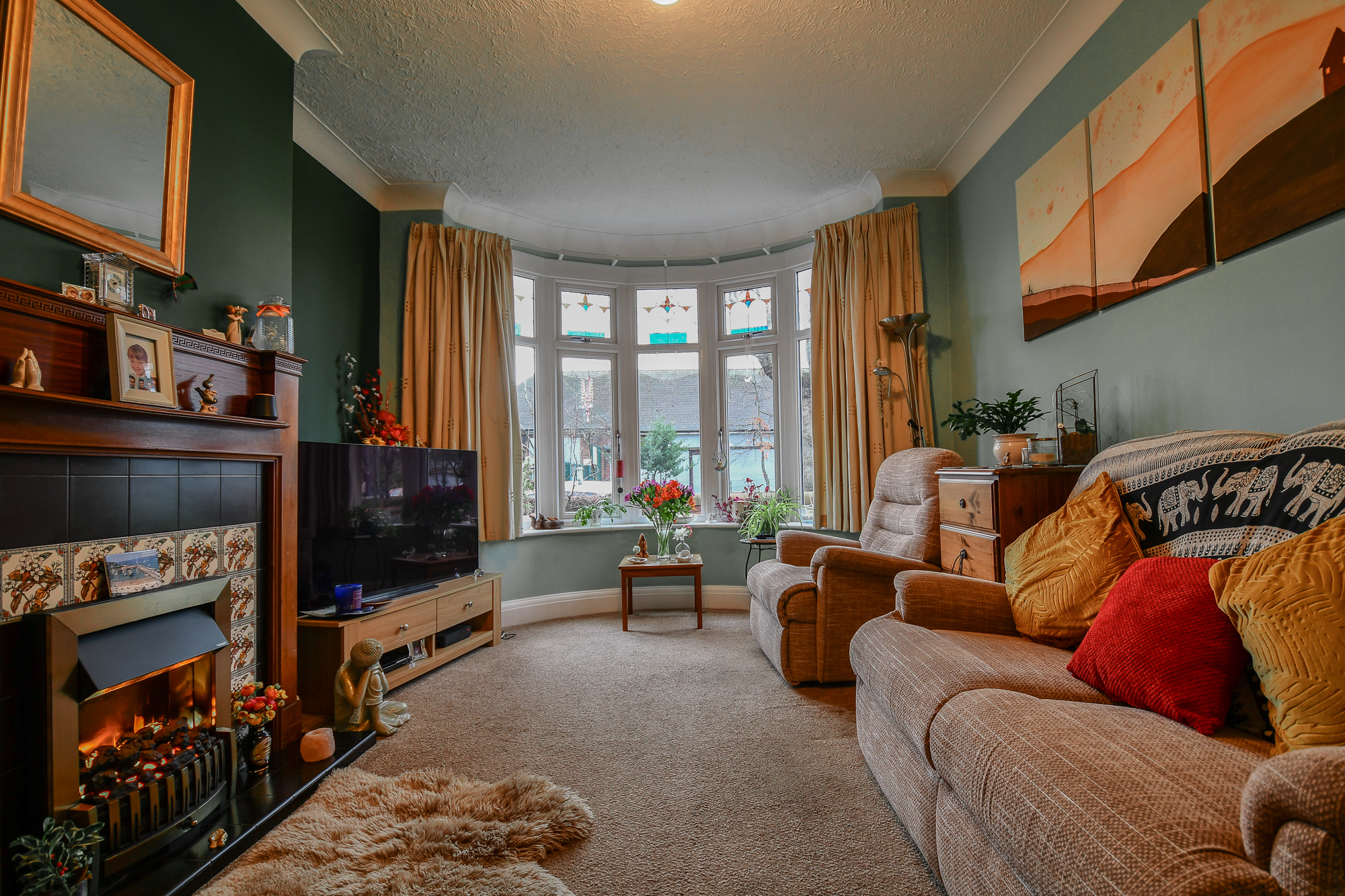 The front living room is a generous, light-filled space featuring a large bay window with double glazing and beautiful stained-glass detailing. A central electric fireplace with the original wooden surround creates a cosy focal point, while the carpeted flooring adds warmth and comfort, making this an ideal room for relaxing.