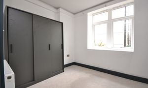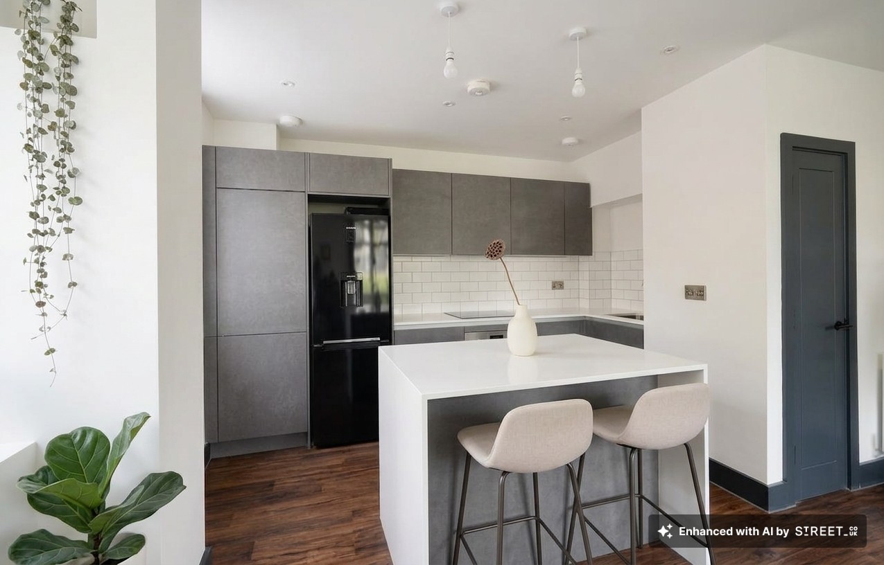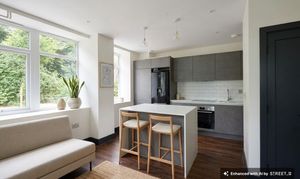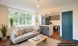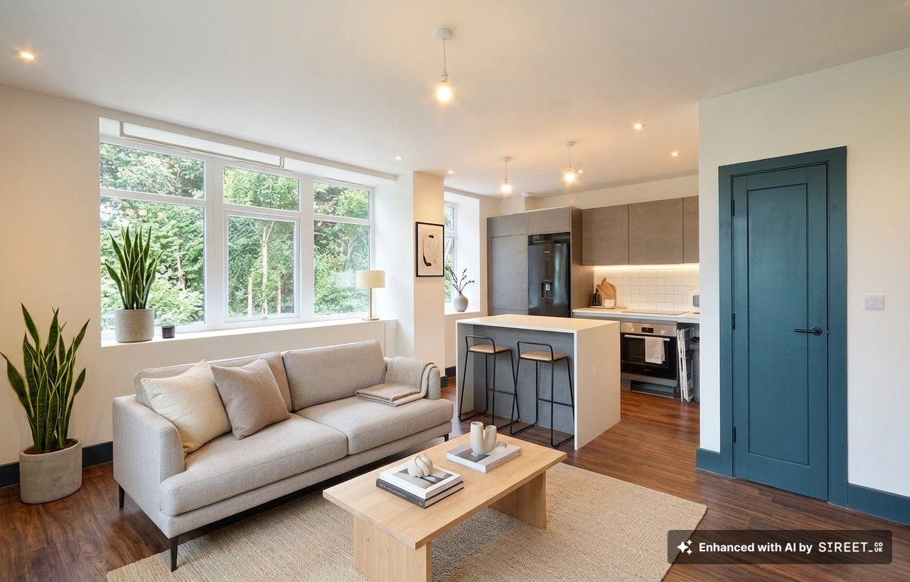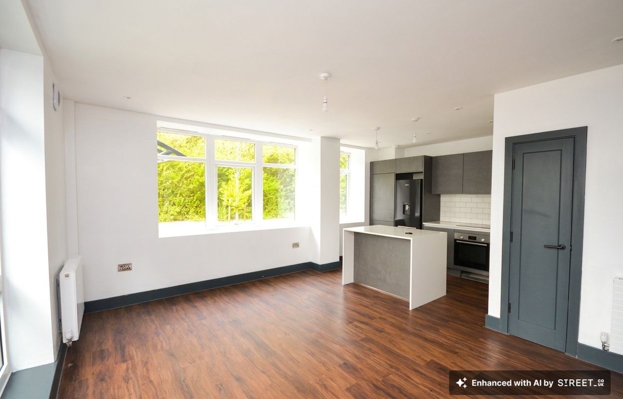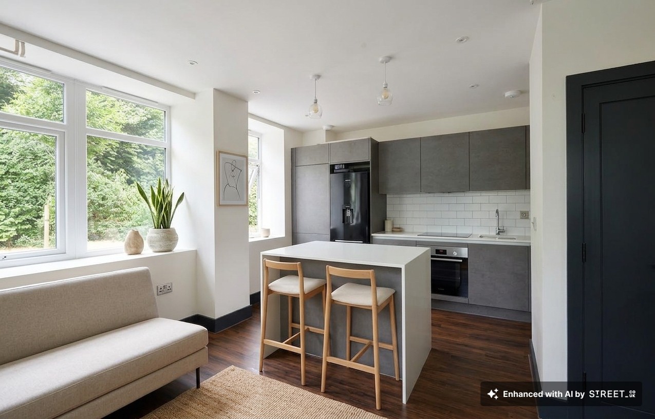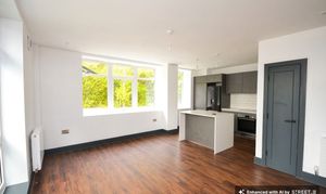 Kitchen area with range of matching wall and base units, stone worktops, space for dishwasher, integrated washing machine, space for fridge/freezer, cupboard housing boiler, induction hob, electric oven, breakfast bar. Living area - LVT flooring, storage cupboard, windows to front and side.