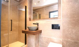 Fully tiled walls, double shower with rainforest shower head, WC & wash hand basin, heated towel rail.